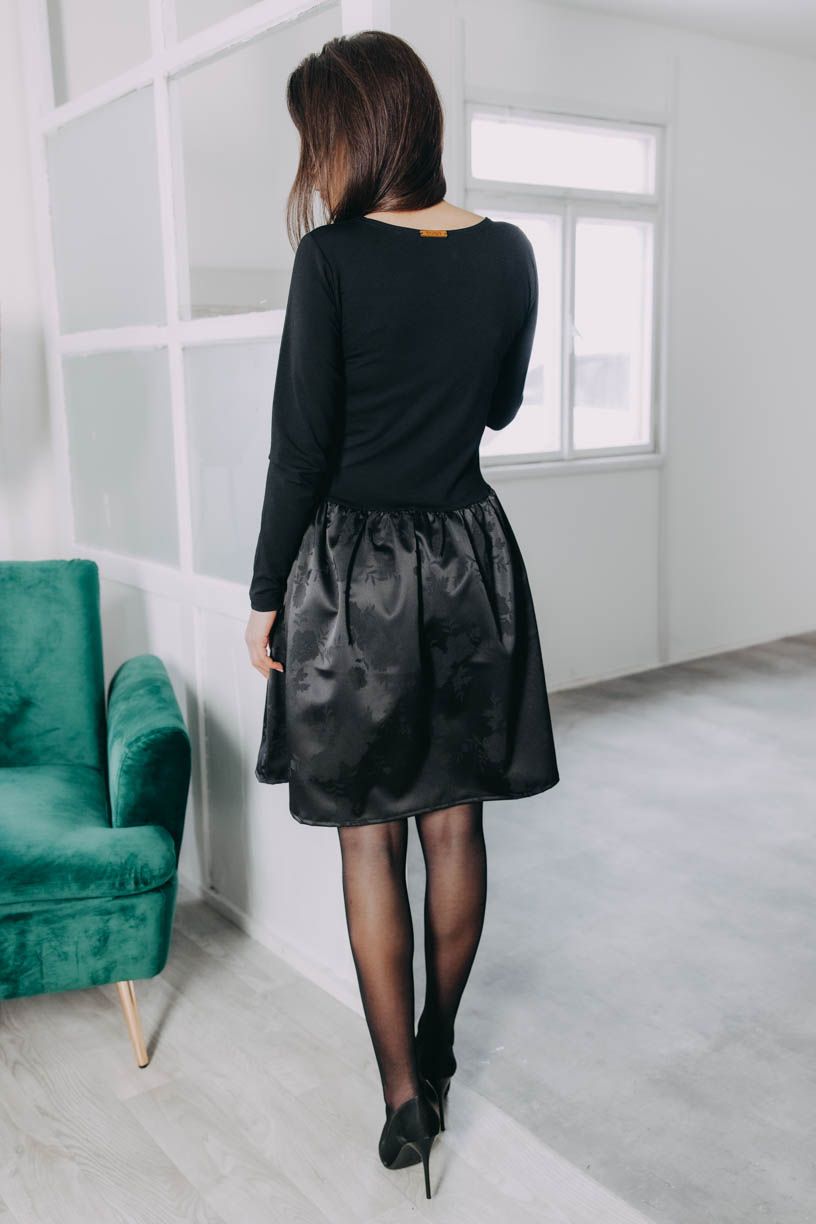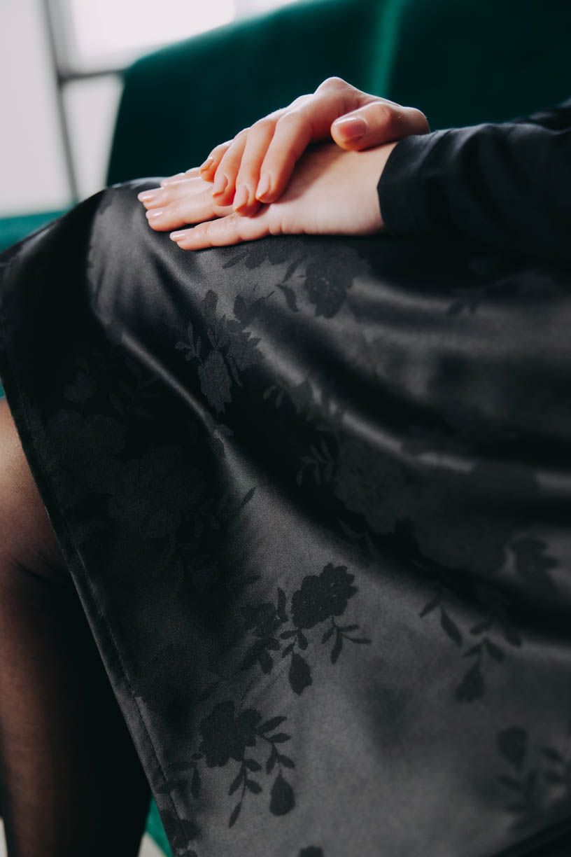 - Barva: Klasická hluboká černá doplněná o elegantní květinový motiv, který se objevuje a mizí podle světla — někdy jemný, jindy výraznější. Ideální pro sváteční atmosféru i běžné nošení.