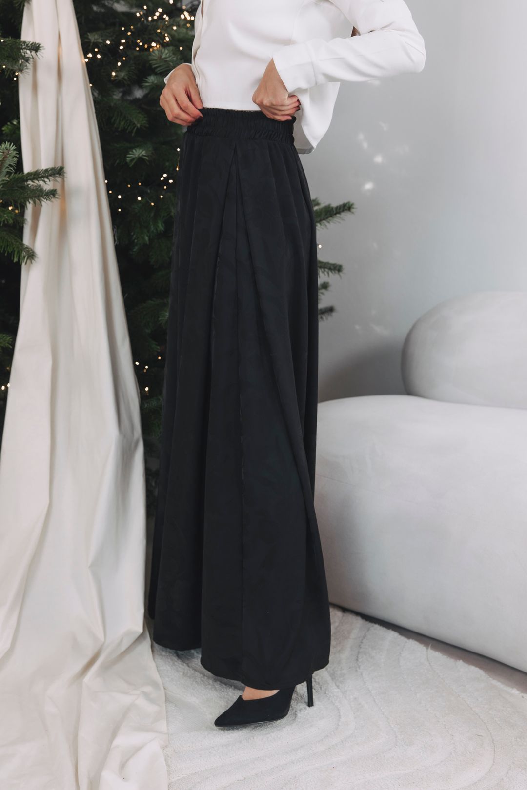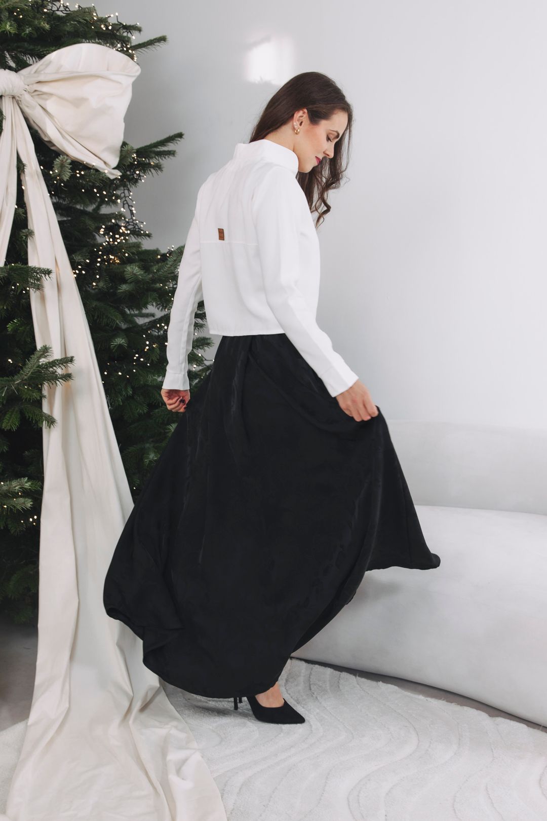 - Sváteční look: Zkombinujte sukni s černým saténovým topem nebo vestičkou na holé tělo. Doplňte ji nápadnými náušnicemi a úzkým zlatým páskem. Budete připravena zazářit nejen u stromečku, ale i na tanečním parketu.
