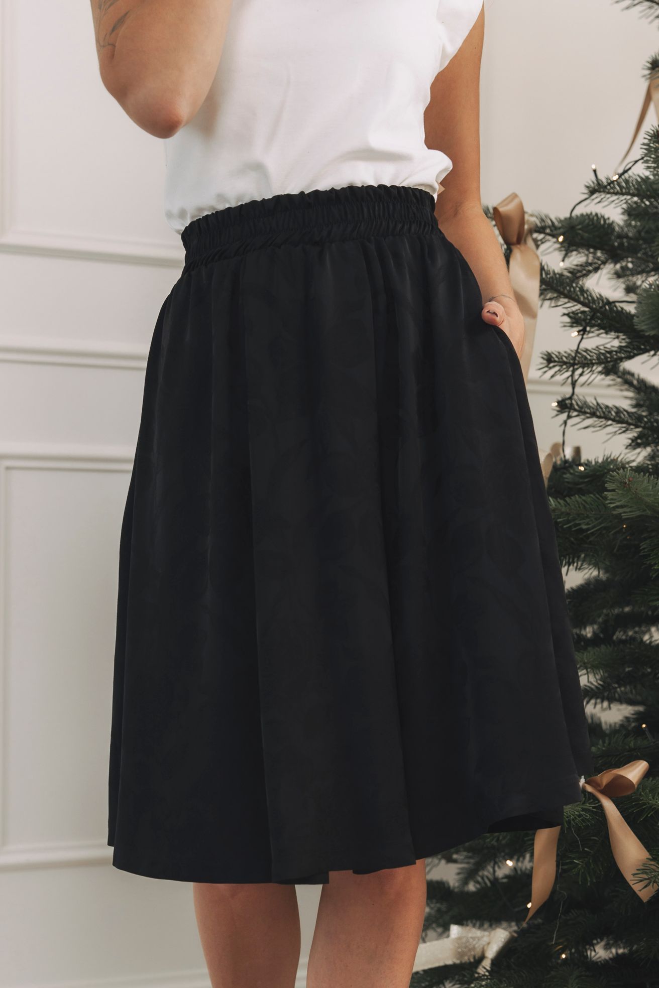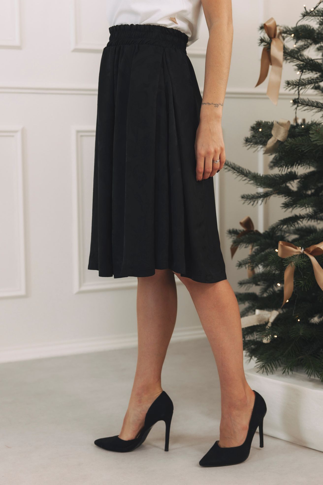- Sváteční look: Zkombinujte sukni s černým saténovým topem nebo vestičkou na holé tělo. Doplňte ji nápadnými náušnicemi a úzkým zlatým páskem. Budete připravena zazářit nejen u stromečku, ale i na tanečním parketu.