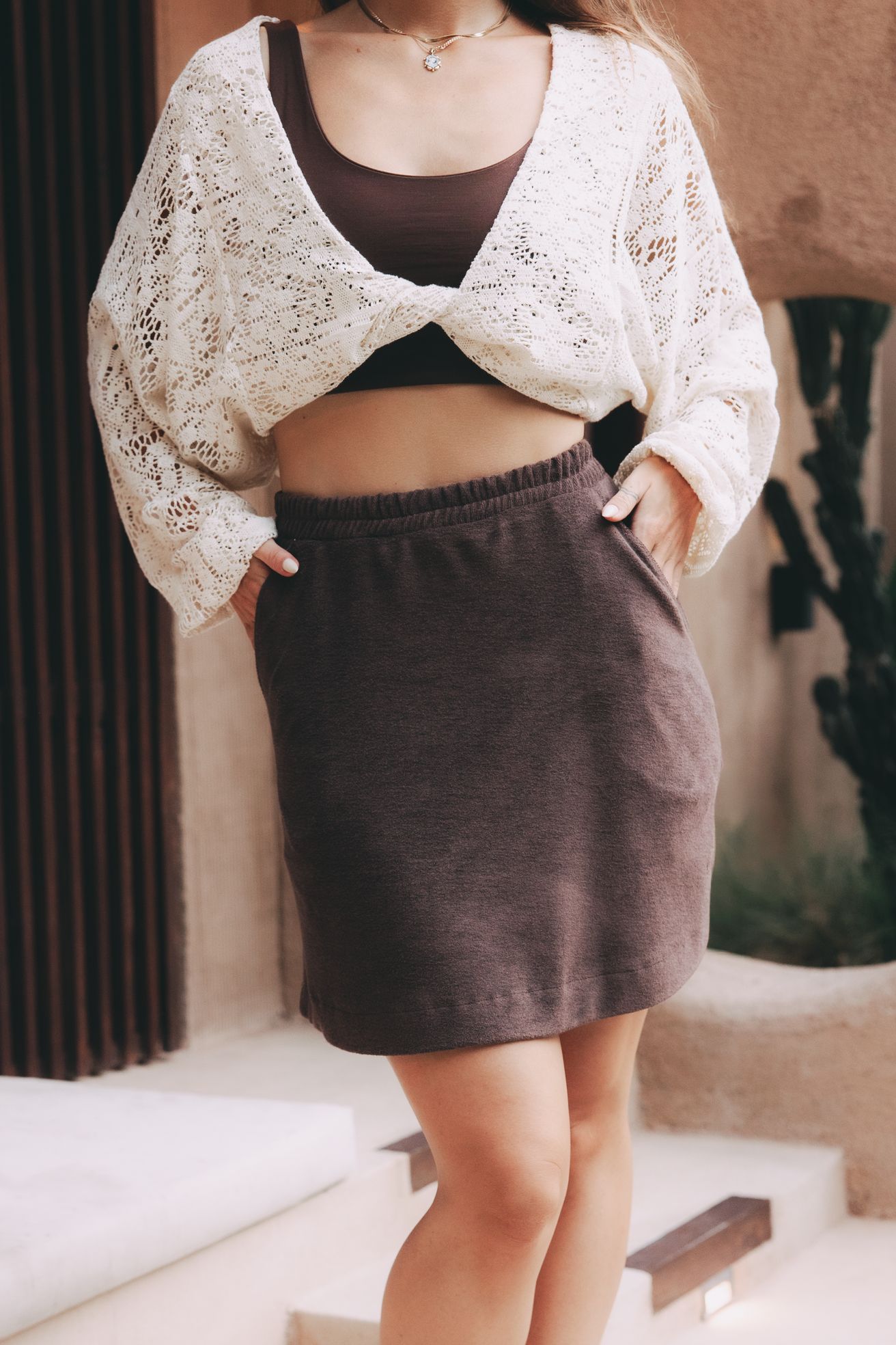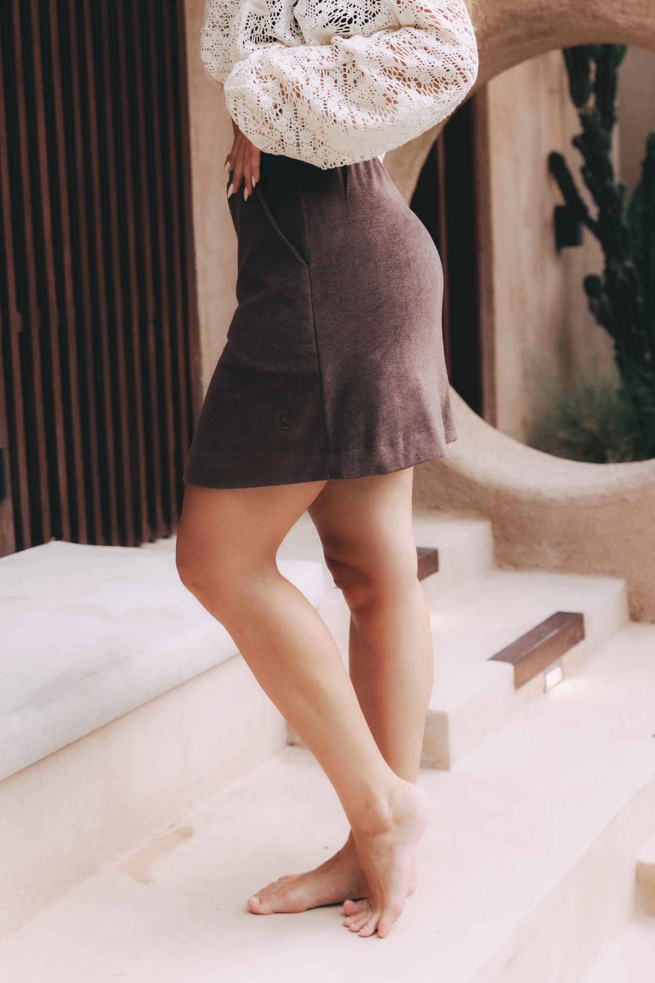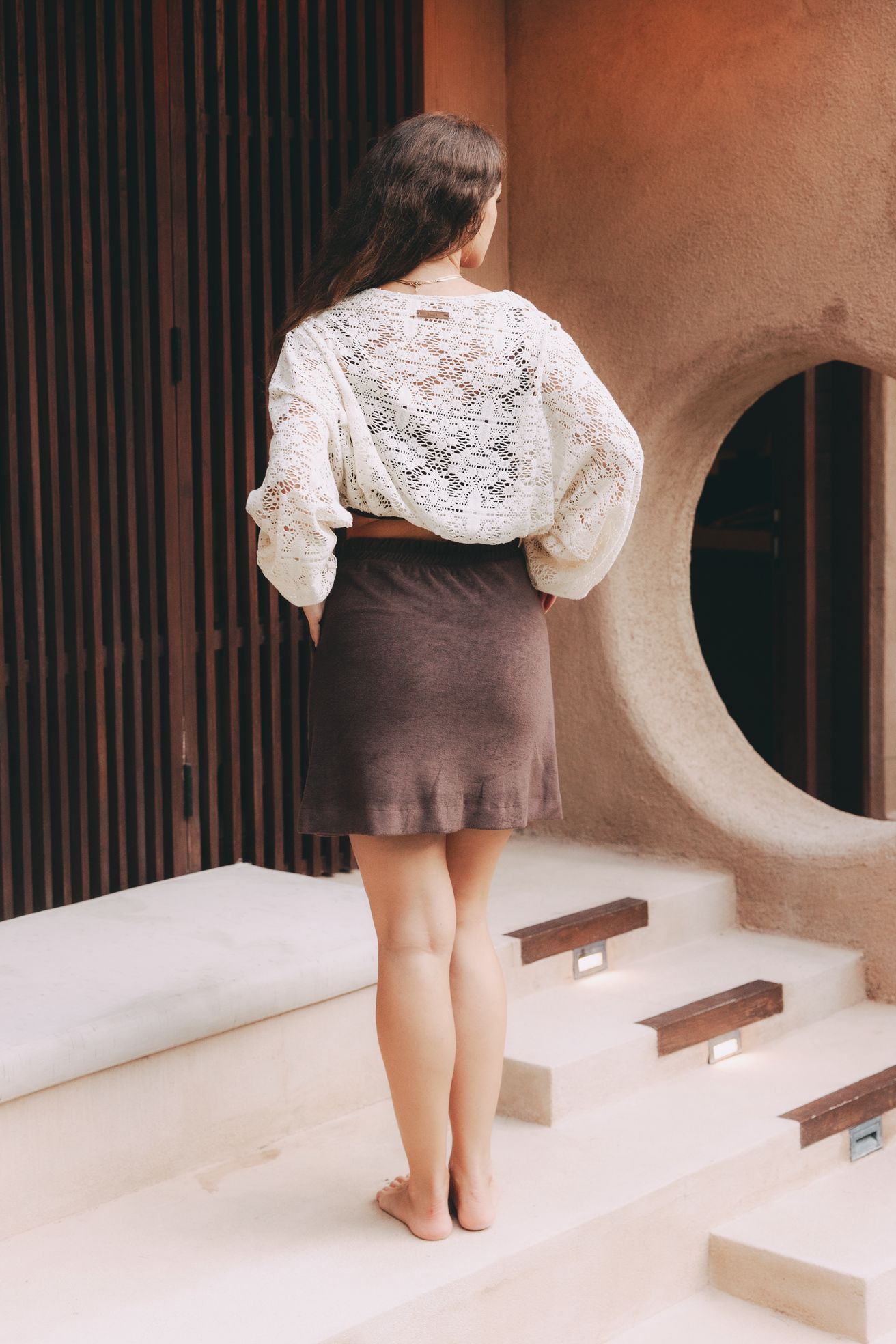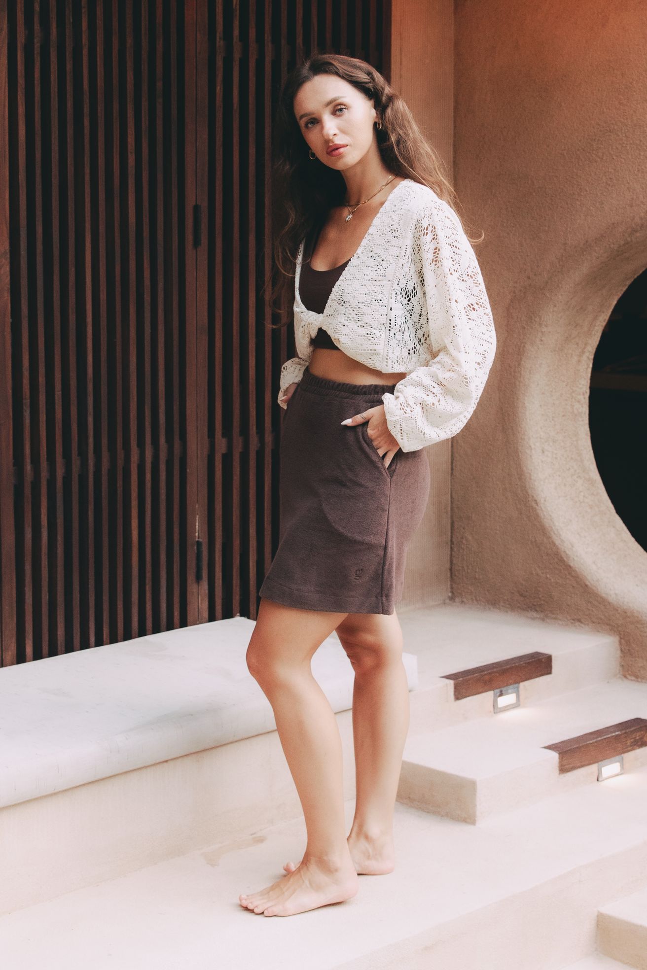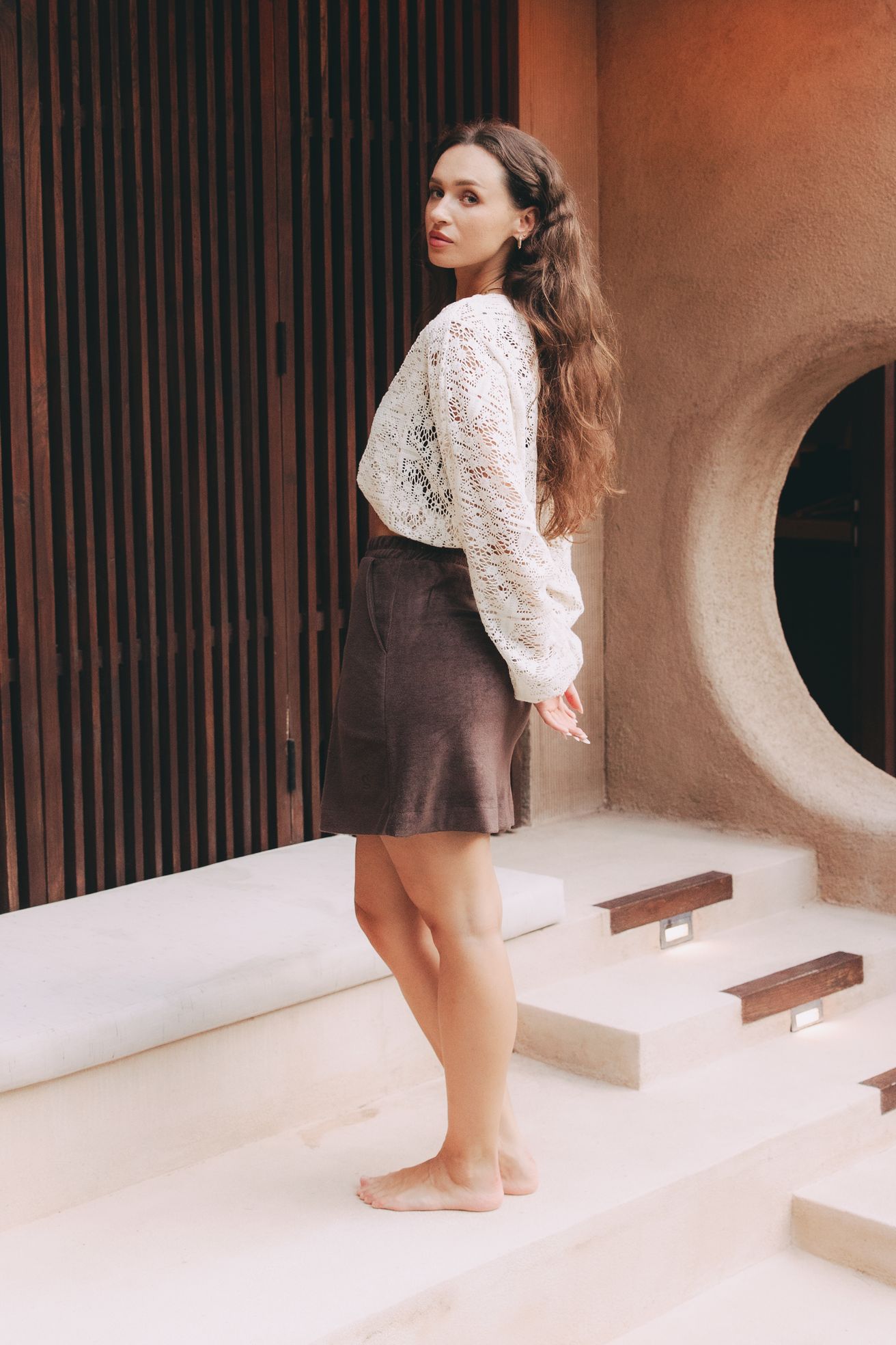 Krátká sukně z bambusového froté je naším milostným dopisem Bali. Právě na ostrově bohů jsme objevili kouzlo této látky.