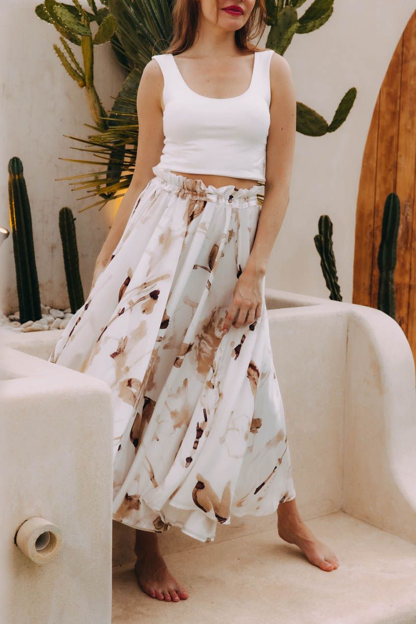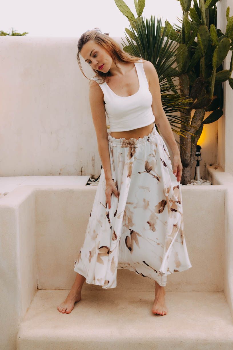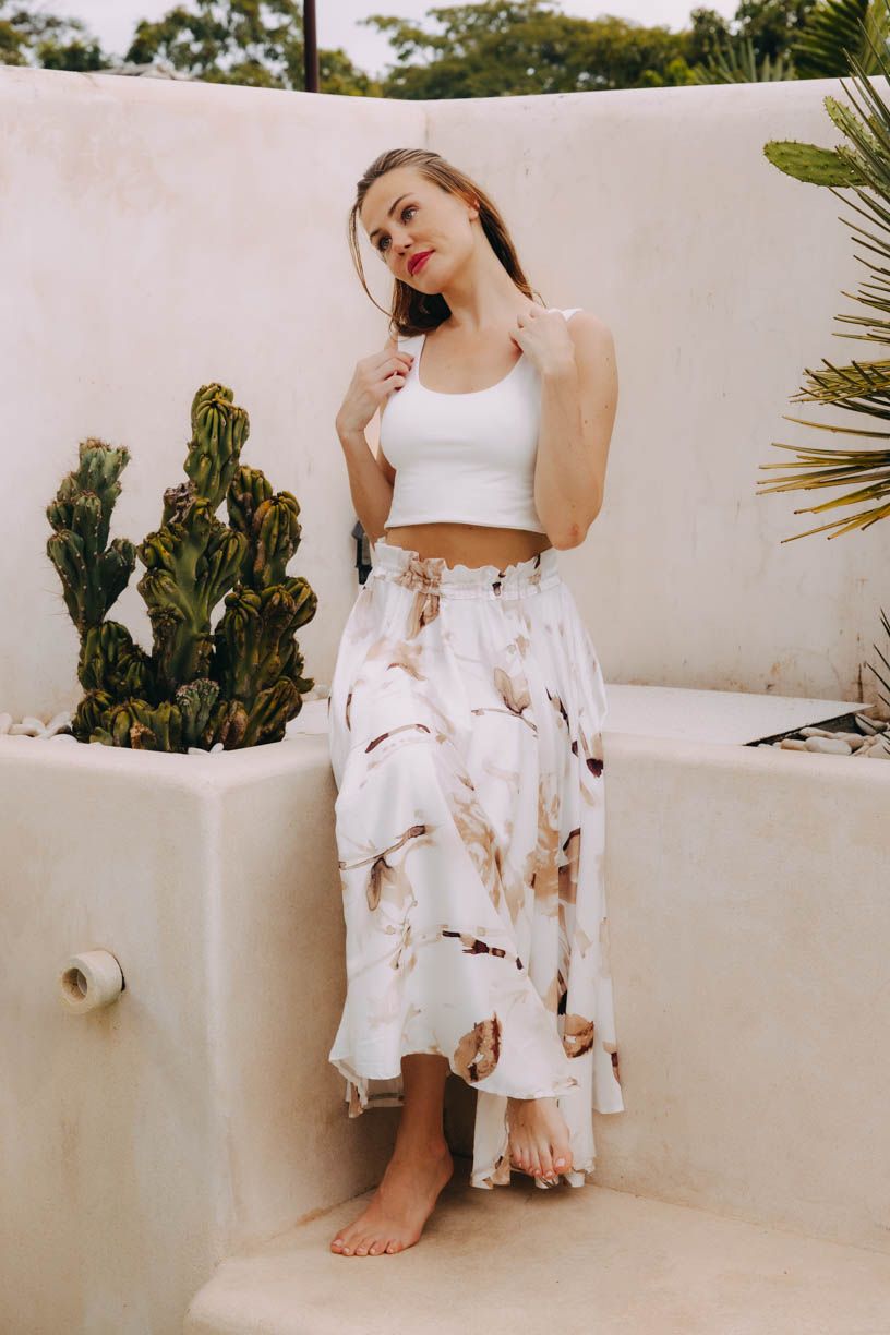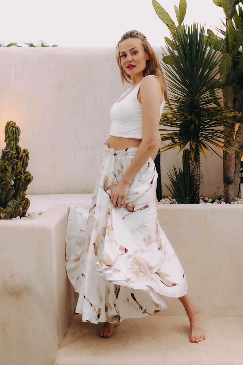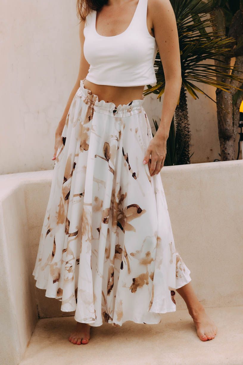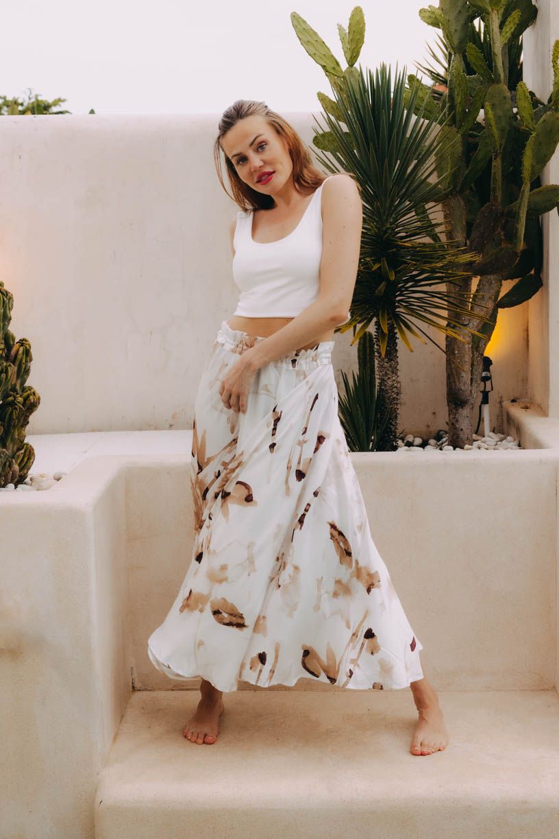 Maxi sukně, která se příjemně vlní kolem nohou při každém kroku po rozpáleném písku, přesně to je sukně Kokila. Lehká, vzdušná, otestovaná na Bali samotnými Balijkami.