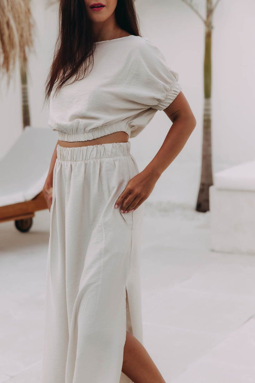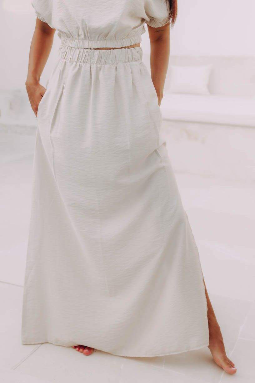 Minimalistická barva vám dovolí kombinovat s kdečím (zkuste třeba stejně dokonalý top Geeti). Tak se toho nebojte a vykročte vstříc slunným dobrodružstvím v téhle úchvatné maxi sukni z Bali kolekce.¨
