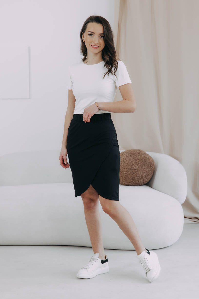 „Dva přední díly přeložené, ale zavinovačka to není, jasný pane,“ řekla by ve své hádance Popelka, kdyby vyprávěla o sukni Mali. Sice se tak tváří, ale nenechte se zmást prvním pohledem. Absolutní pravdou je však její pohodlí, o které se stará pevnější materiál ze směsi viskózy, nylonu a trošky spandexu.