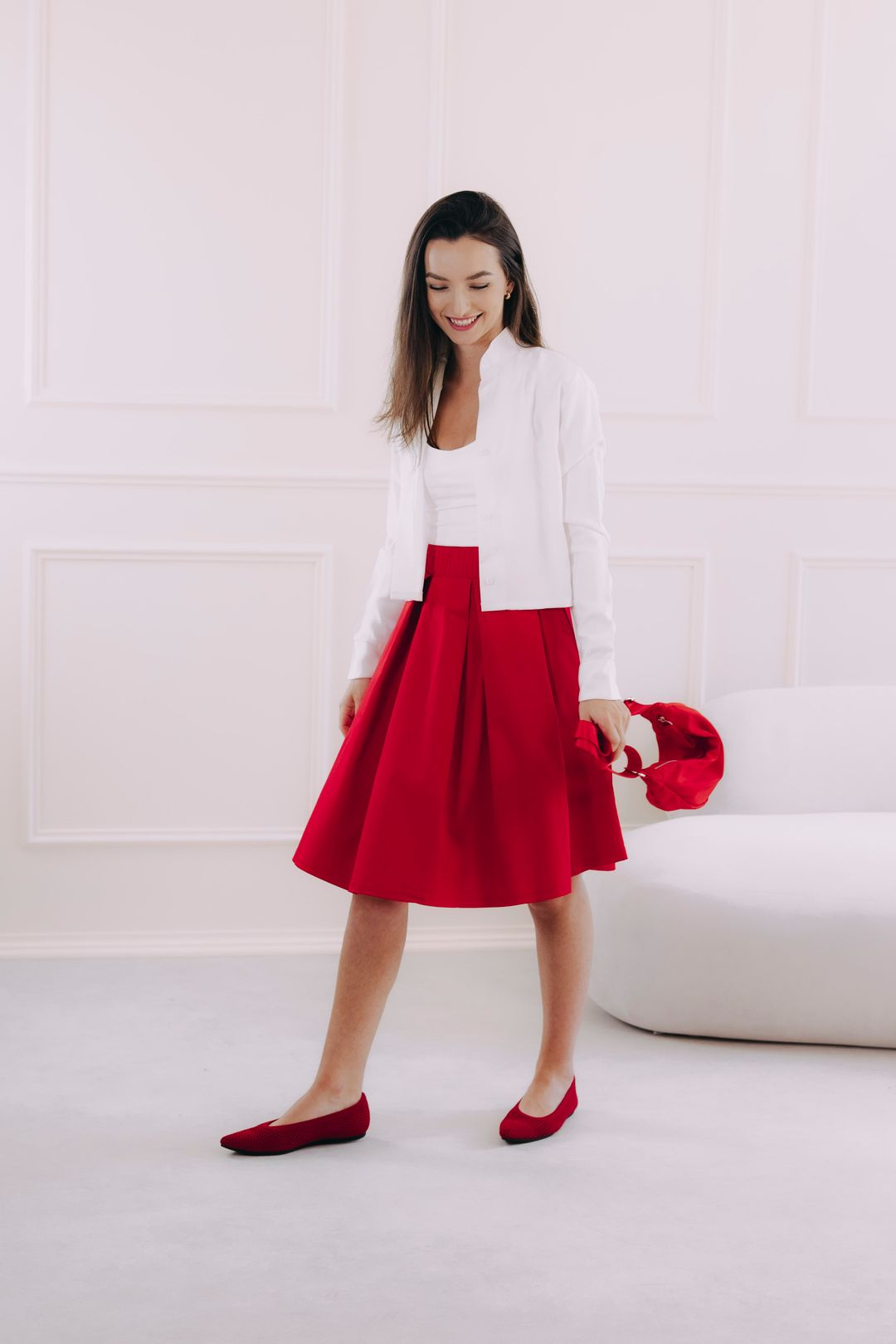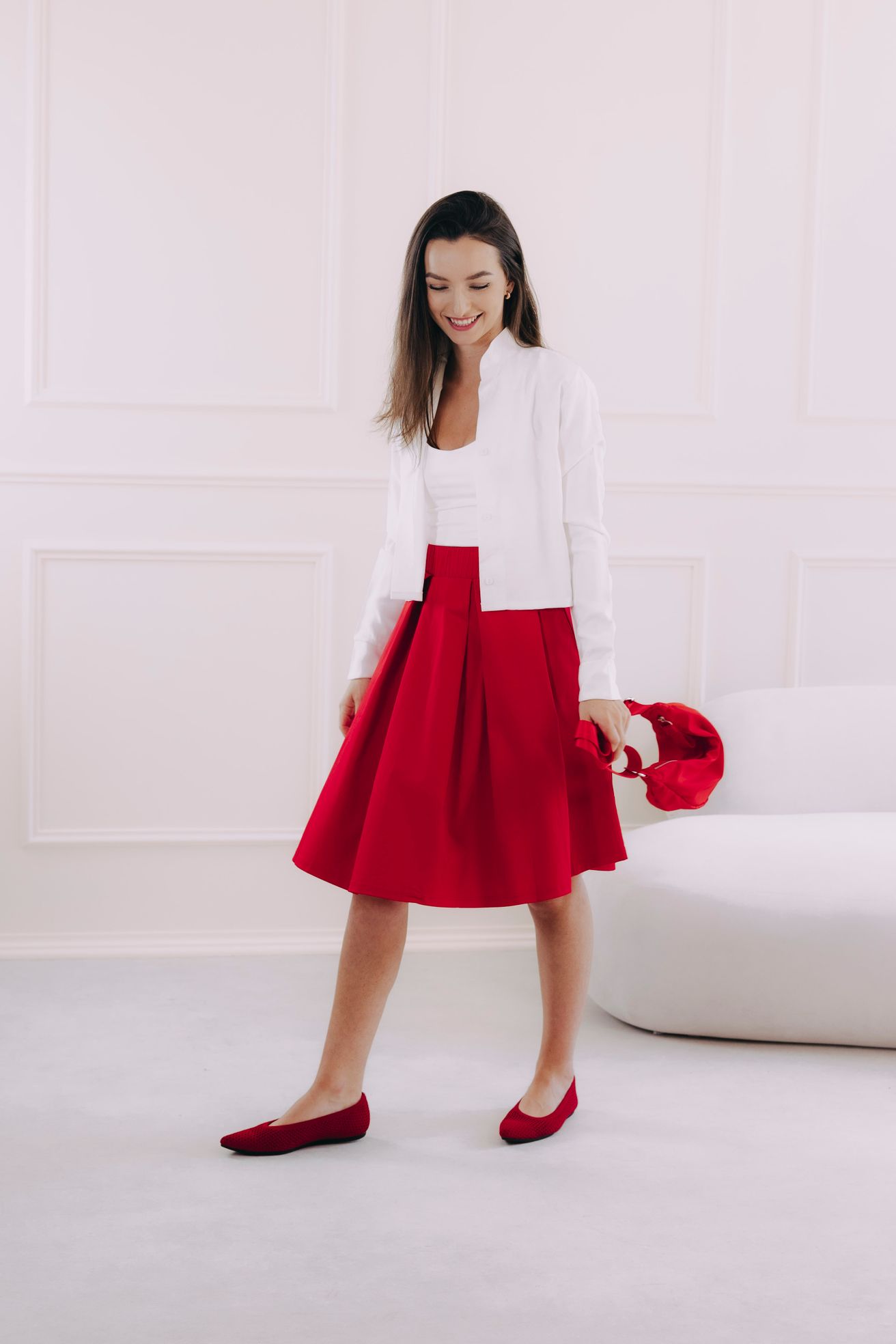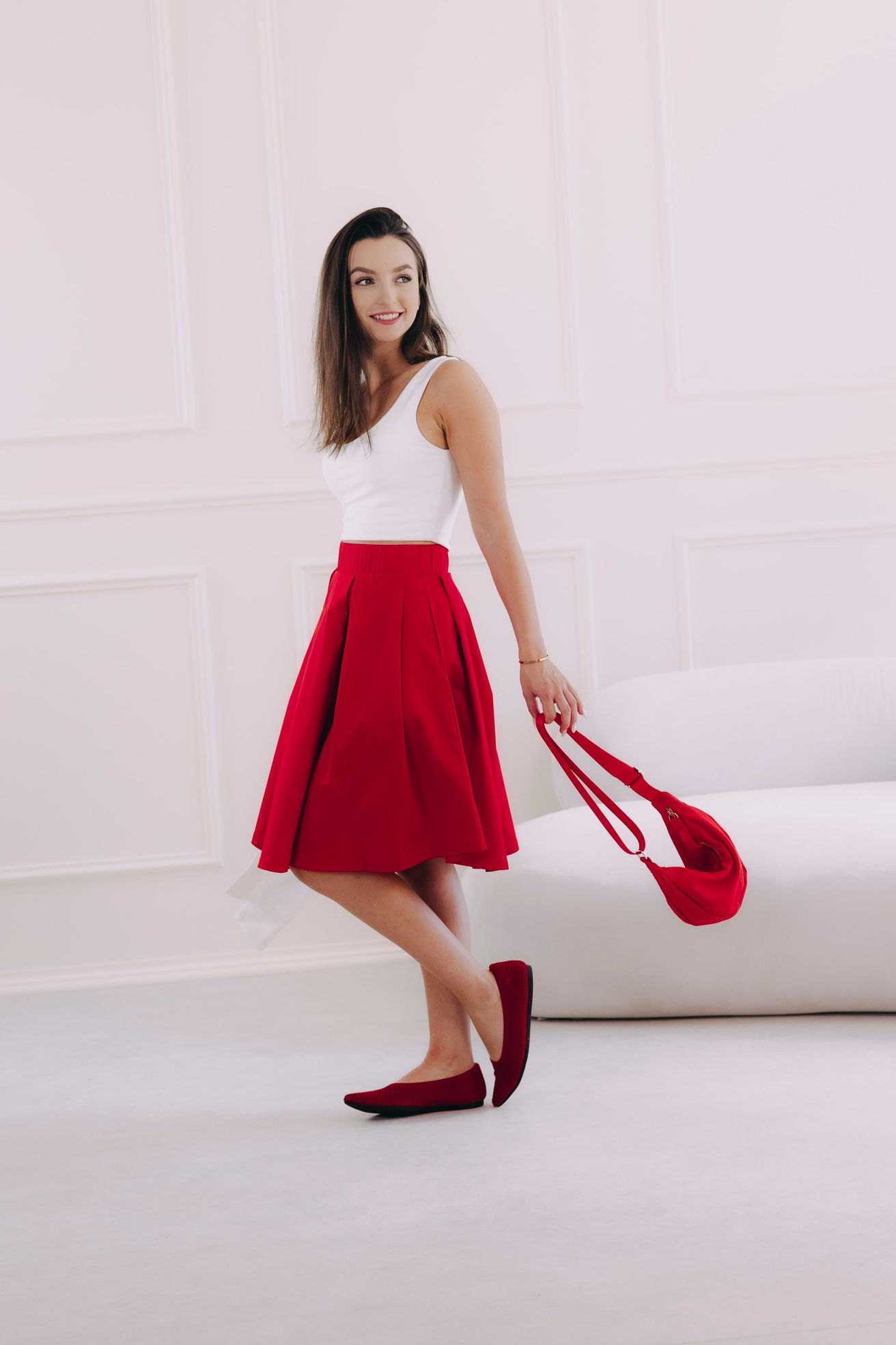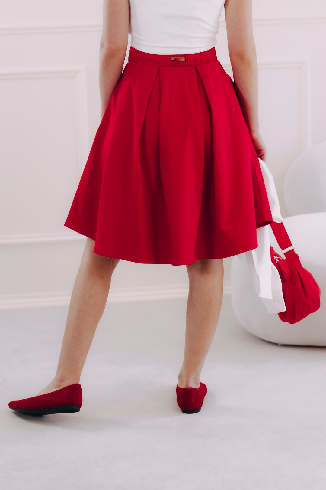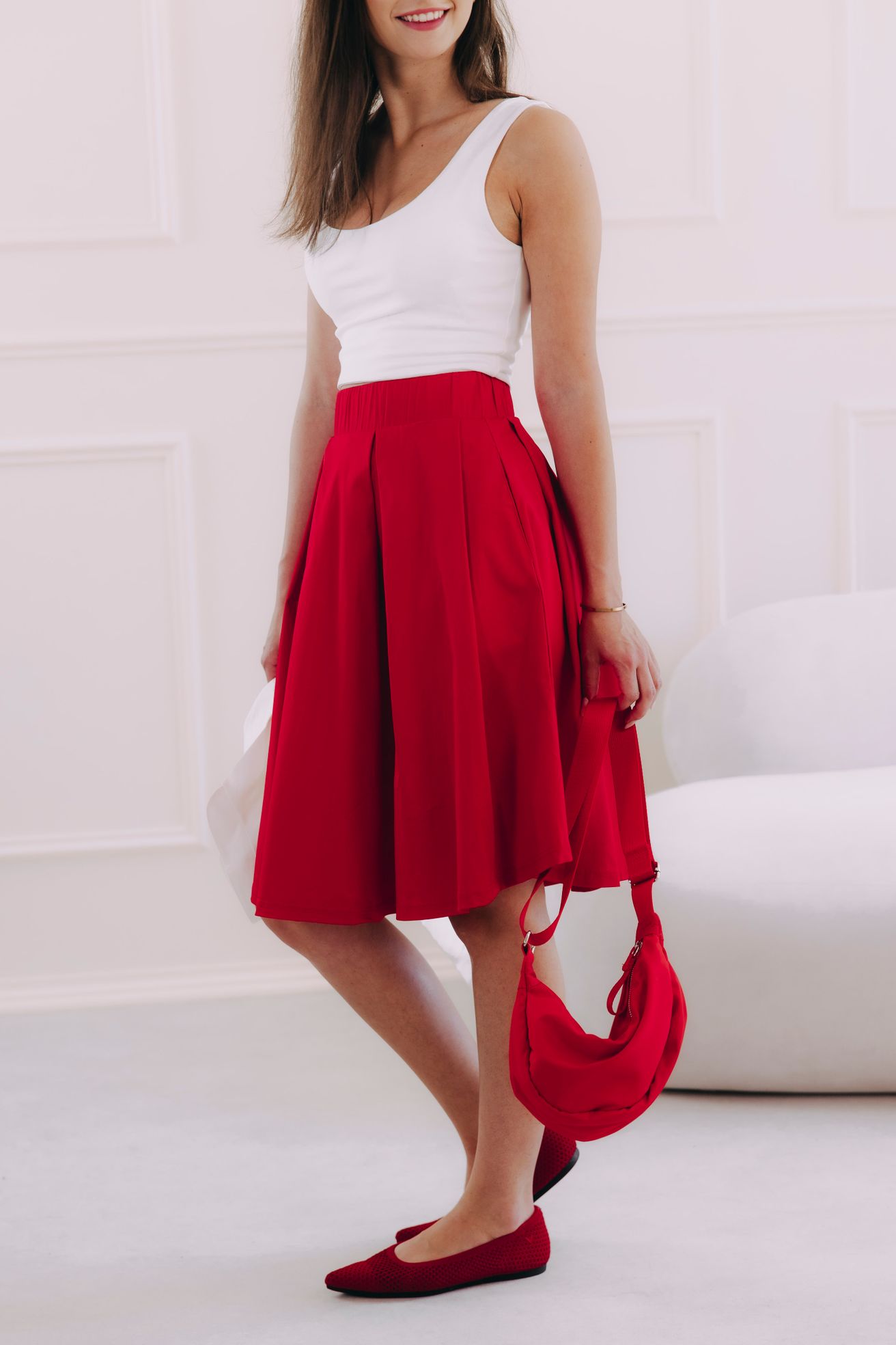 Červená sukně v délce ke kolenům je bezvadná univerzálka. Stačí nazout podpatky, natáhnout lesklé punčochy a doplnit přiléhavým elegantním topem a můžete v ní vyrazit třeba i na ples. Jindy zas oceníte pohodlné tenisky, ležérní mikču nebo odrbanou džísku.