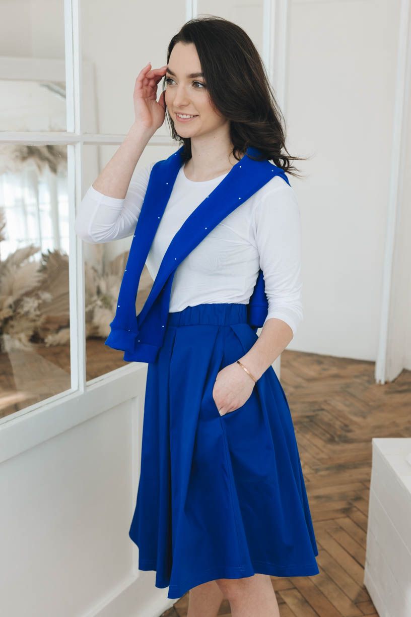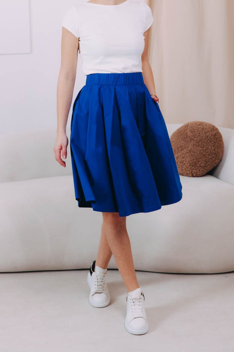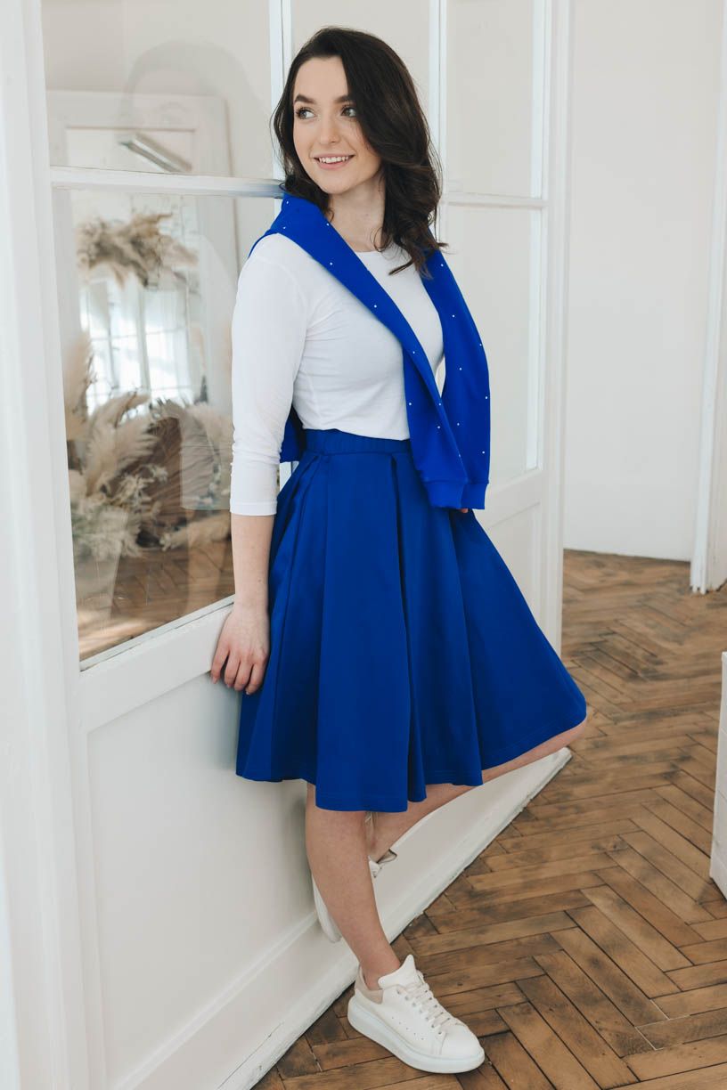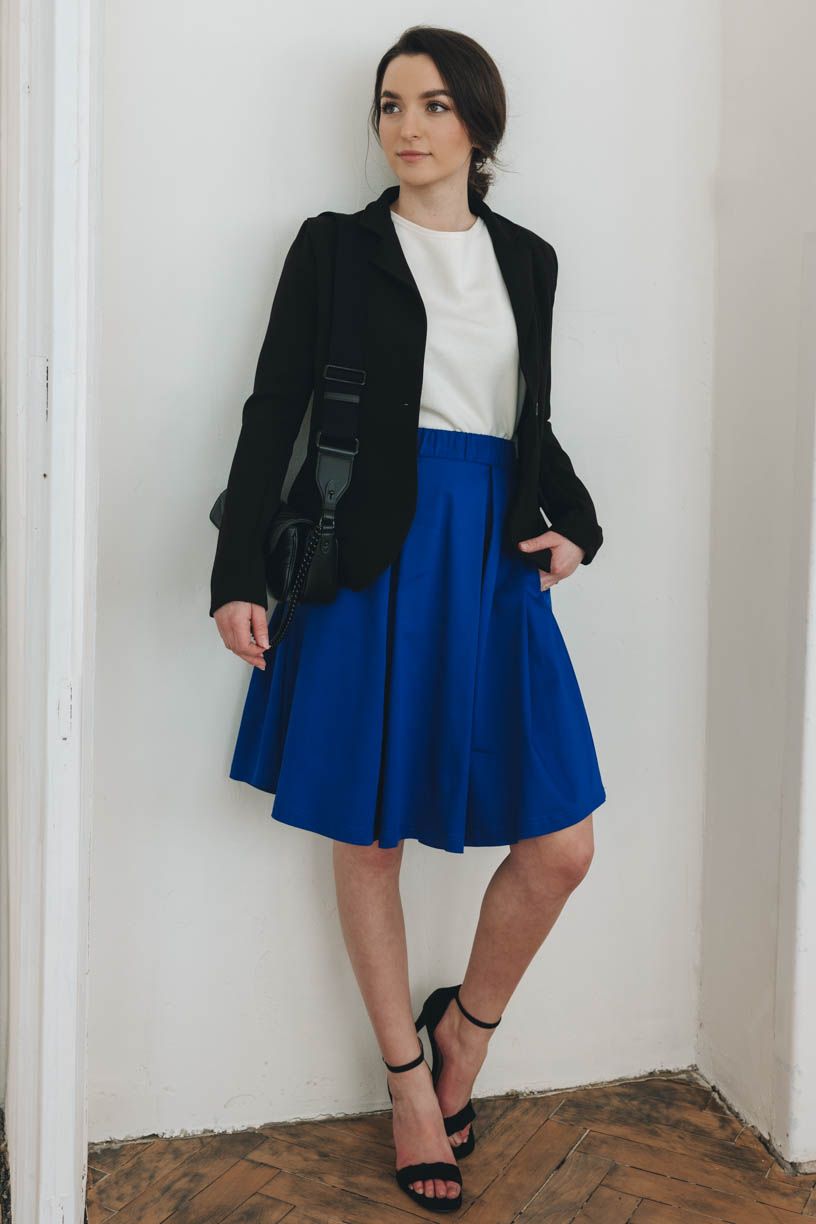 Modrá sukně v délce ke kolenům je bezvadná univerzálka. Stačí nazout podpatky, natáhnout lesklé punčochy a doplnit přiléhavým elegantním topem a můžete v ní vyrazit třeba i na ples. Jindy zas oceníte pohodlné tenisky, ležérní mikču nebo odrbanou džísku.