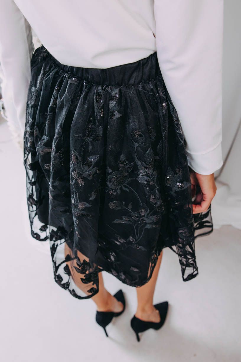 Sukně Mara je přímo ztělesněním sváteční elegance s kouzelným nádechem. Černá látka je zahalena závojem tylu s výraznými květy a třpytkami, který jí propůjčuje lehce záhadný podtón. Jemné řasení sukni dodává vzdušnost a díky gumě v pase se můžete volně pohybovat celým večerem.