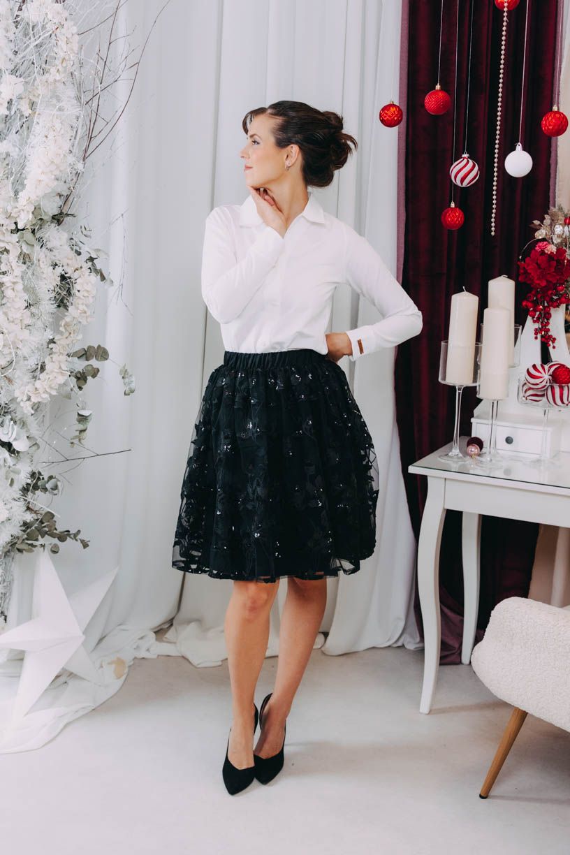 Mara je díky zdobenému tylu sama o sobě výrazným prvkem, proto stačí minimalističtější svršek v podobě košile, svetru či efektní halenky. Hravě vytvoříte efektní black&white look, nebo zvolte typicky vánoční bordó, zlatou či tmavě zelenou. Ty si získají každé oko a přinesou vám do šatníku kouzlo, které k Vánocům patří.