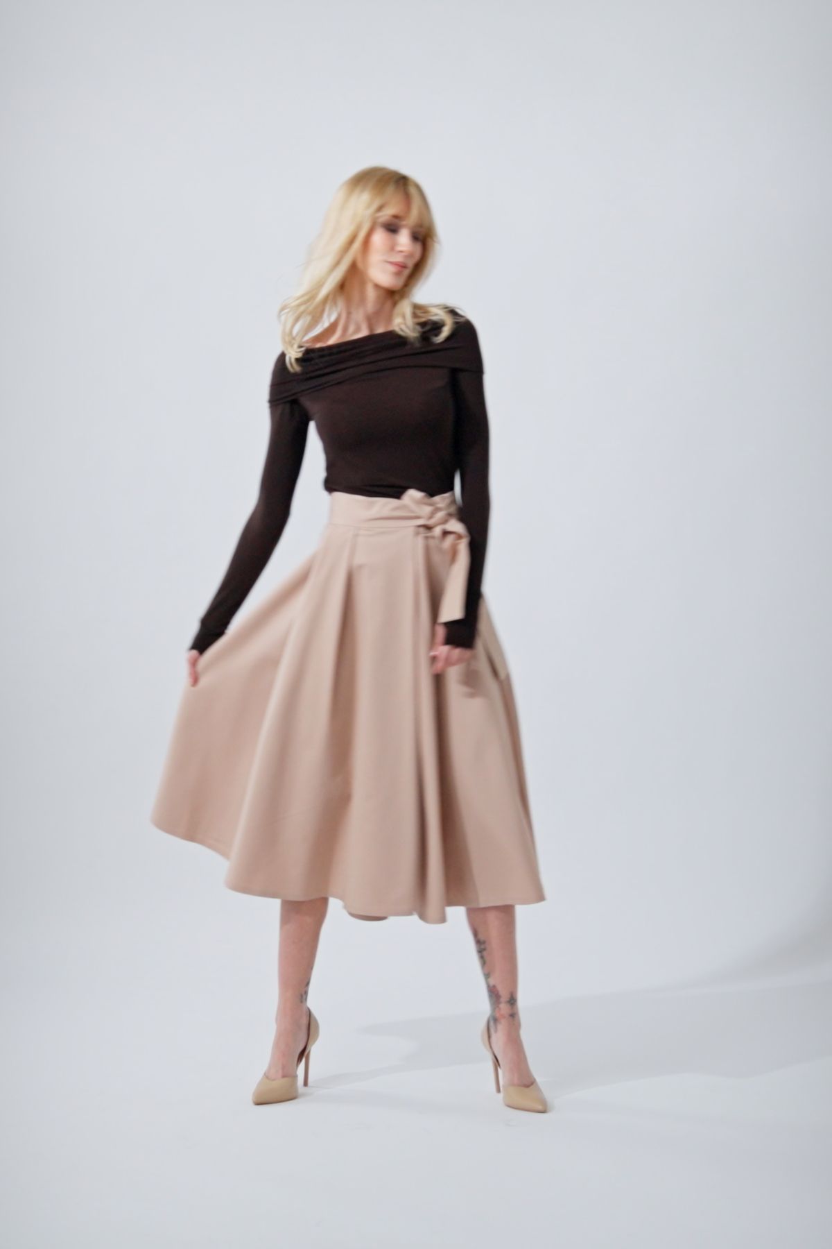 Sukně se zapíná pomocí čtyř knoflíčků a dvou dírek, což umožňuje nastavení pasu přesně na míru a zajišťuje, že krásně drží tam, kde má. Mašle v pase není jen na ozdobu, ale slouží i jako praktická pojistka pro maximální pohodlí a sebevědomí.