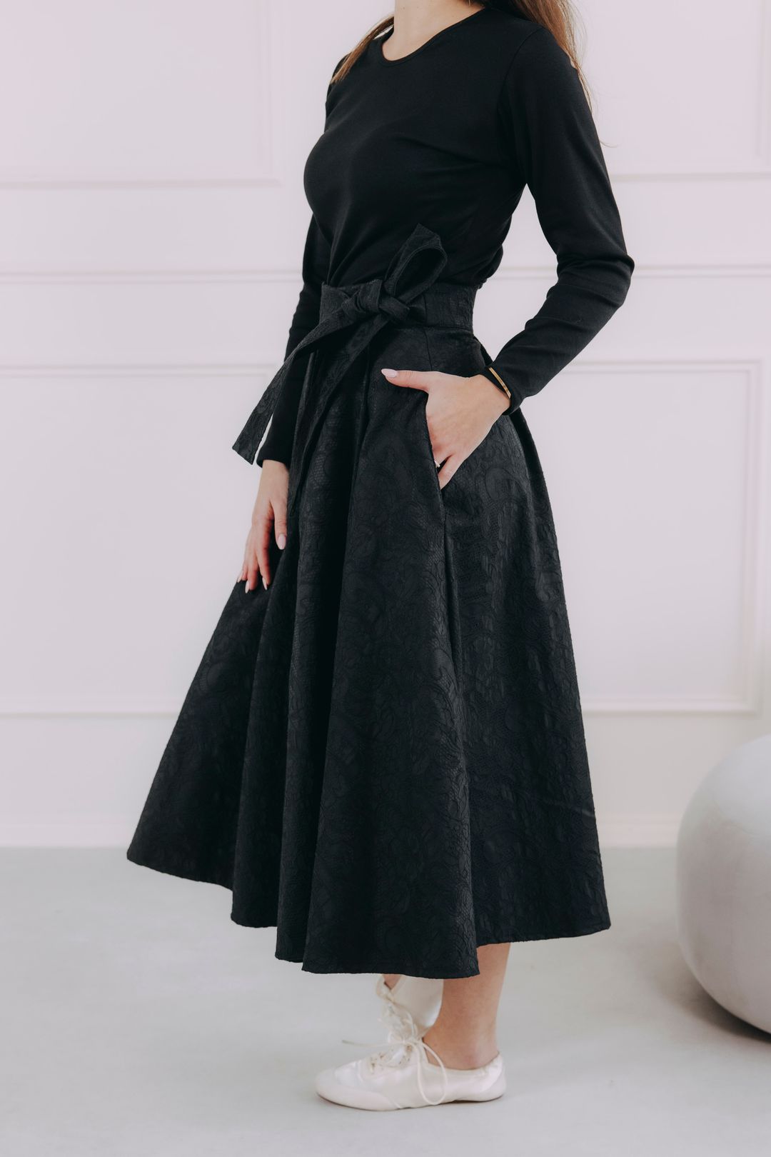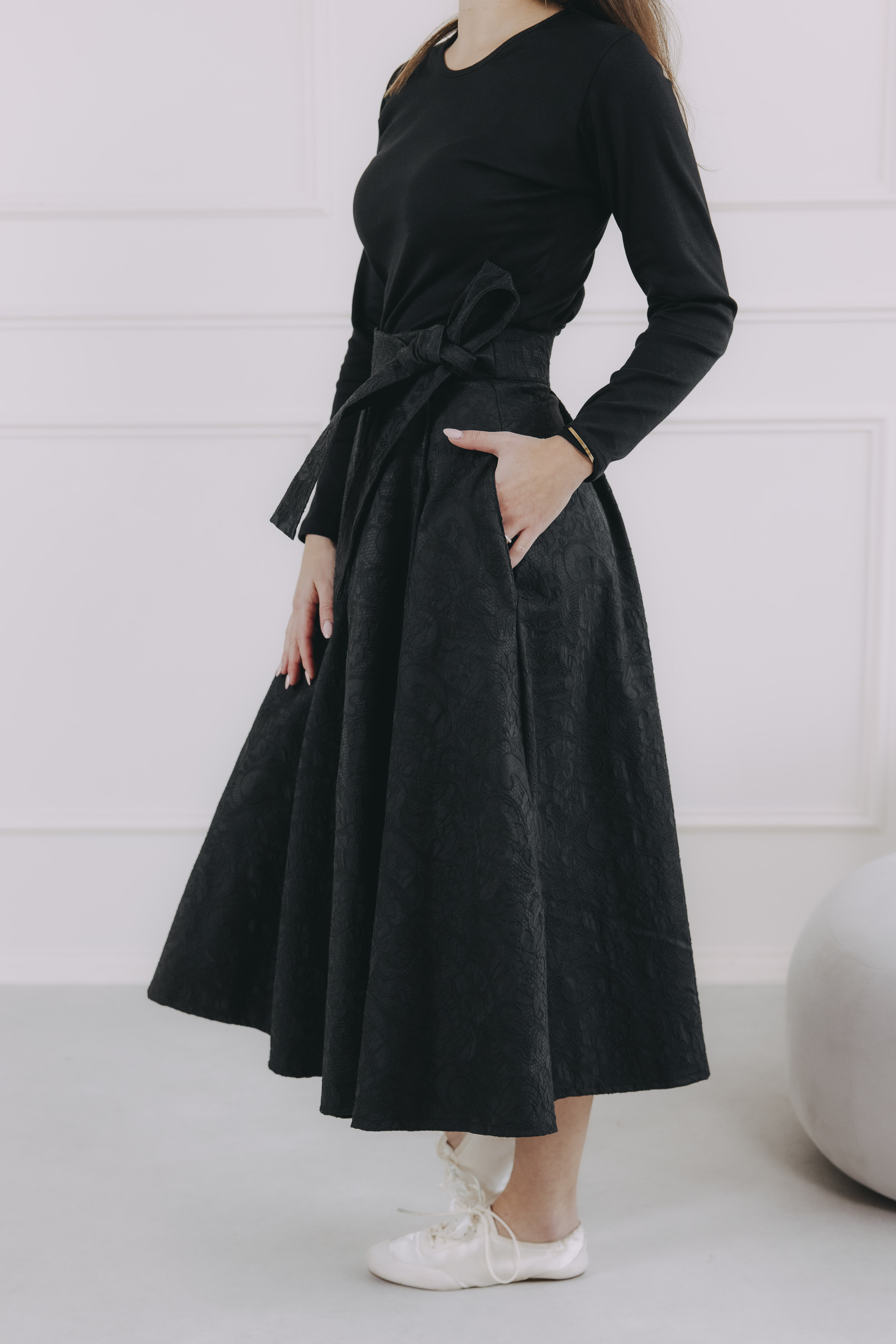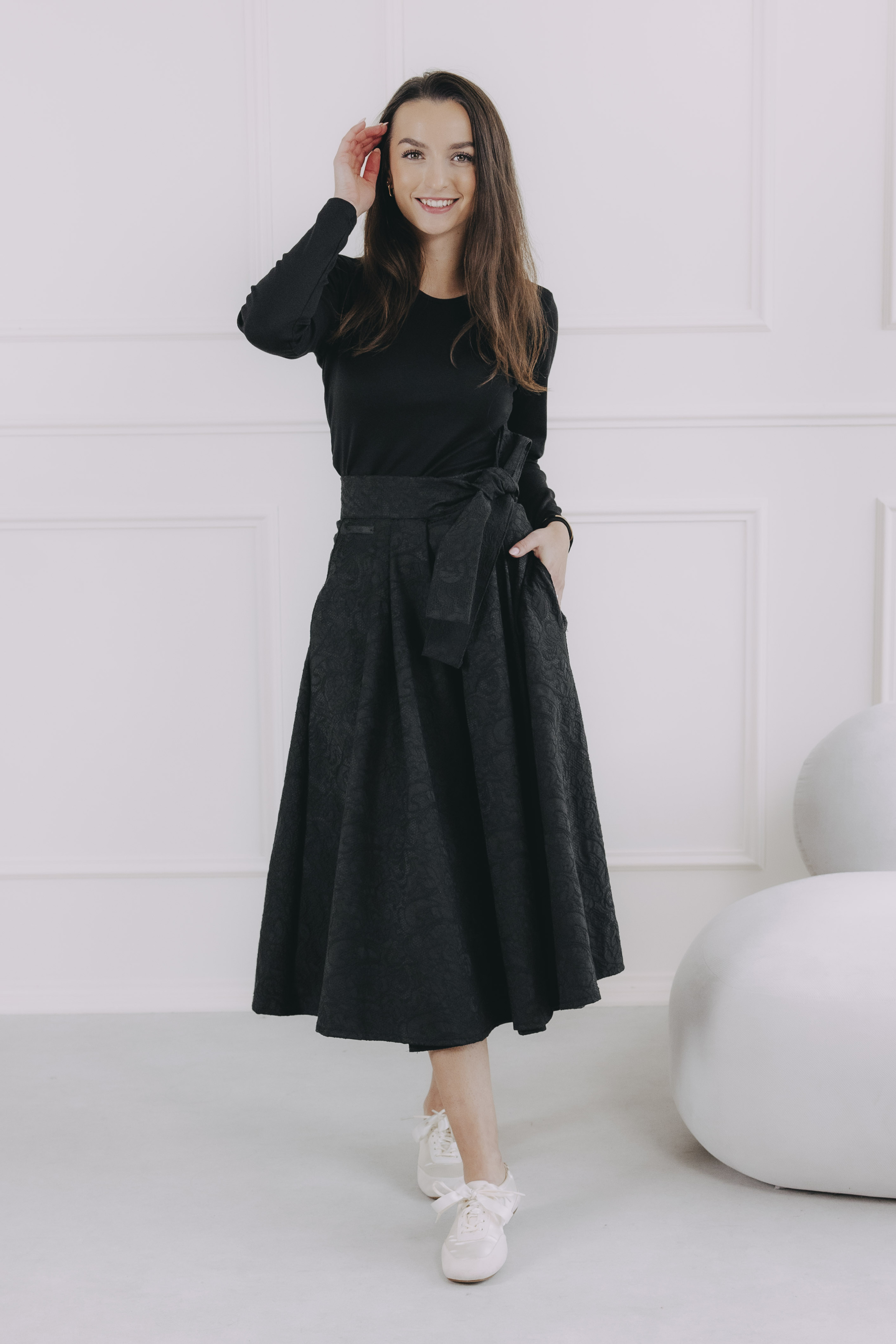 - Materiál: Žakár. Látka, která působí skoro jako šperk. Vzory nejsou tištěné, ale vetkané přímo do látky, díky čemuž mají hloubku, vydrží dlouho krásné a dodávají sukni originální strukturovaný vzhled.