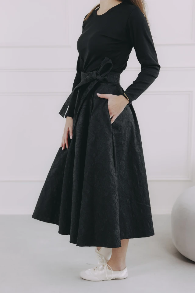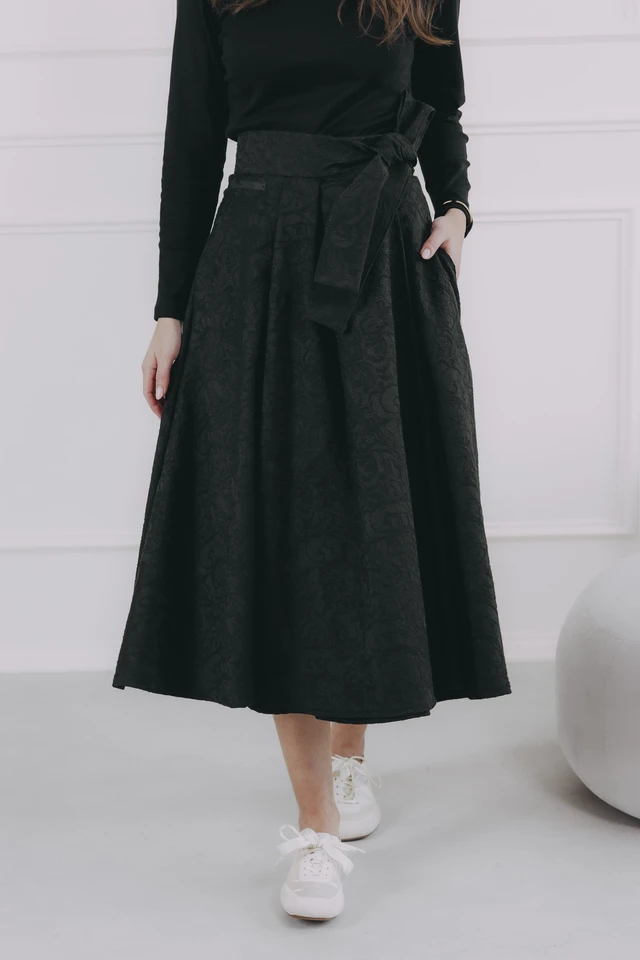 Sukně se zapíná pomocí čtyř knoflíčků a dvou dírek, což umožňuje nastavení pasu přesně na míru a zajišťuje, že krásně drží tam, kde má. Mašle v pase není jen na ozdobu, ale slouží i jako praktická pojistka pro maximální pohodlí a sebevědomí.