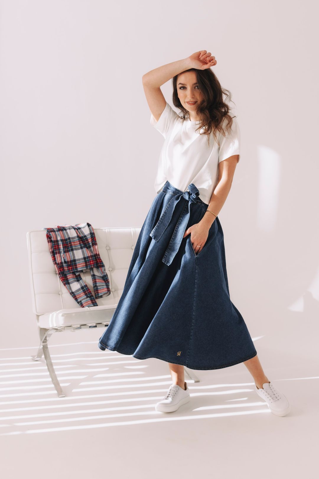Co denimové sukni Mawe obzvlášť sluší, to jsou bílé vršky, které vytvoří neodolatelný a svěží kontrast. V kombinaci s bílou košilí, topem nebo body získáte okamžitě koukavý a romantický outfit s denimovým šmrncem.