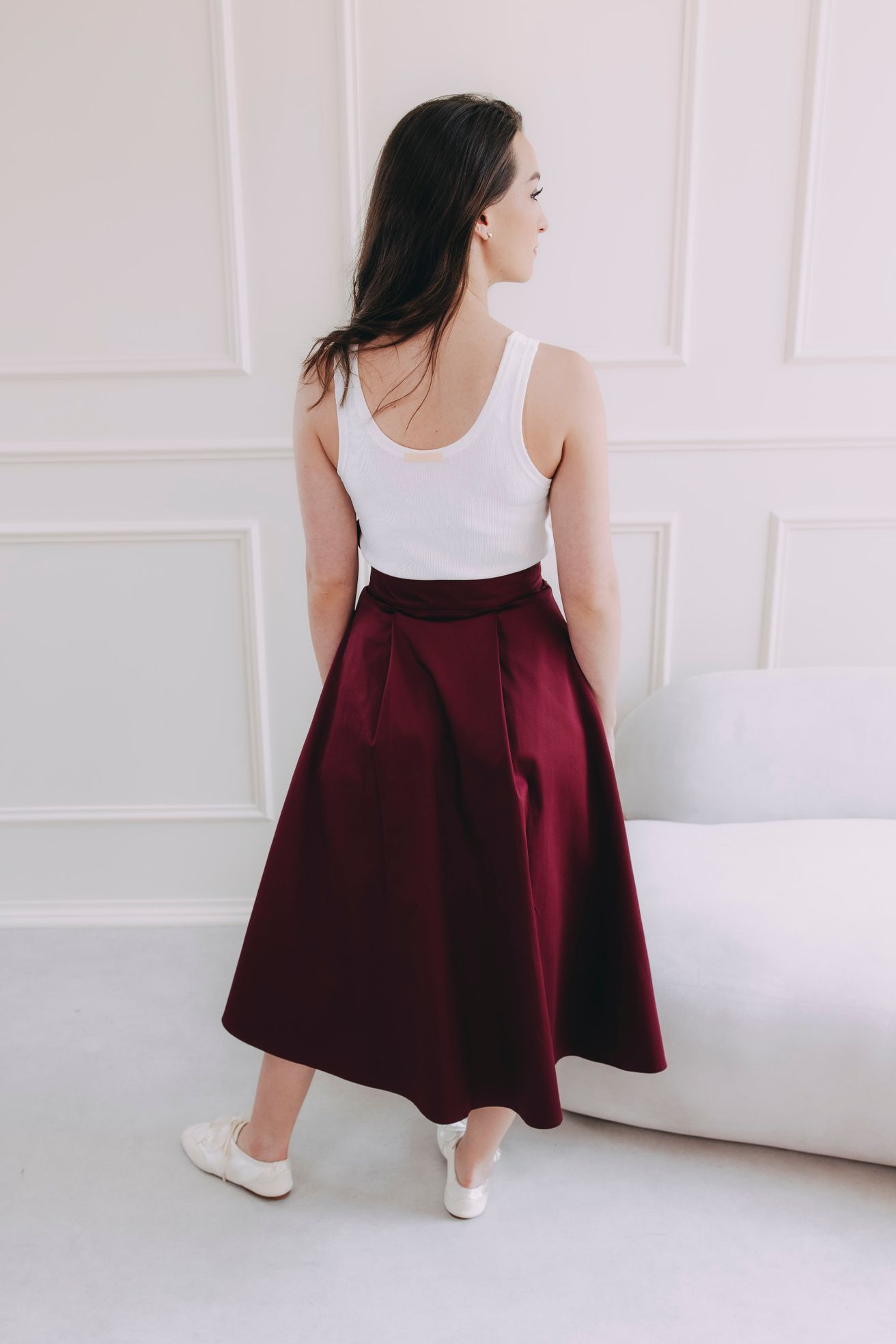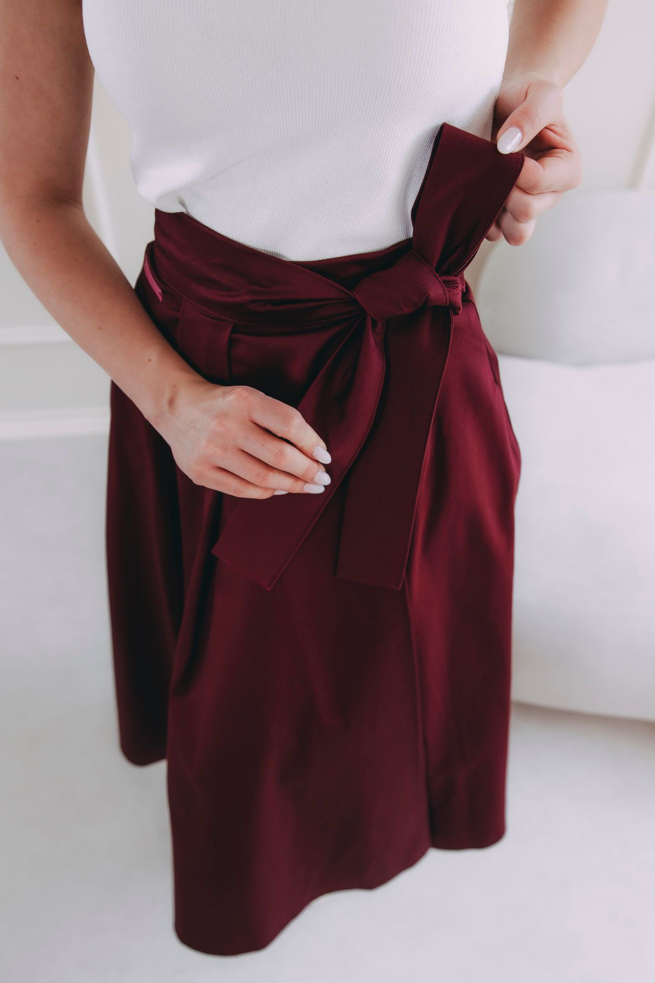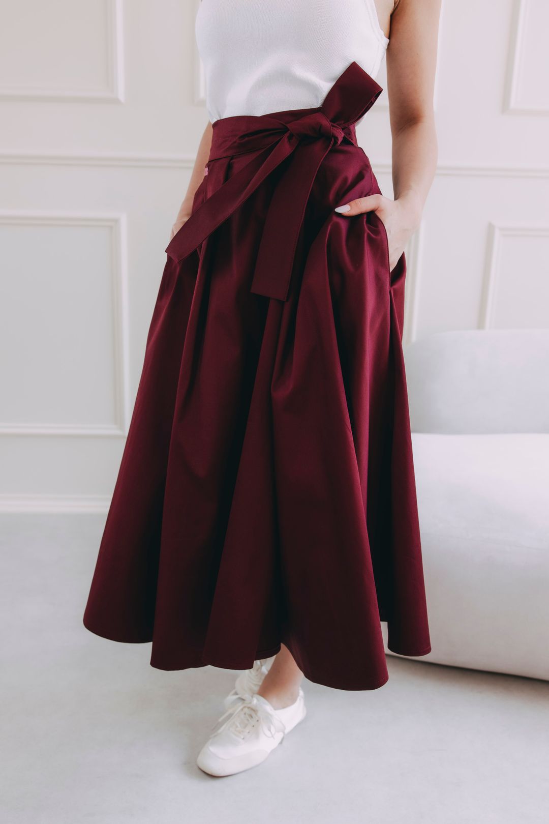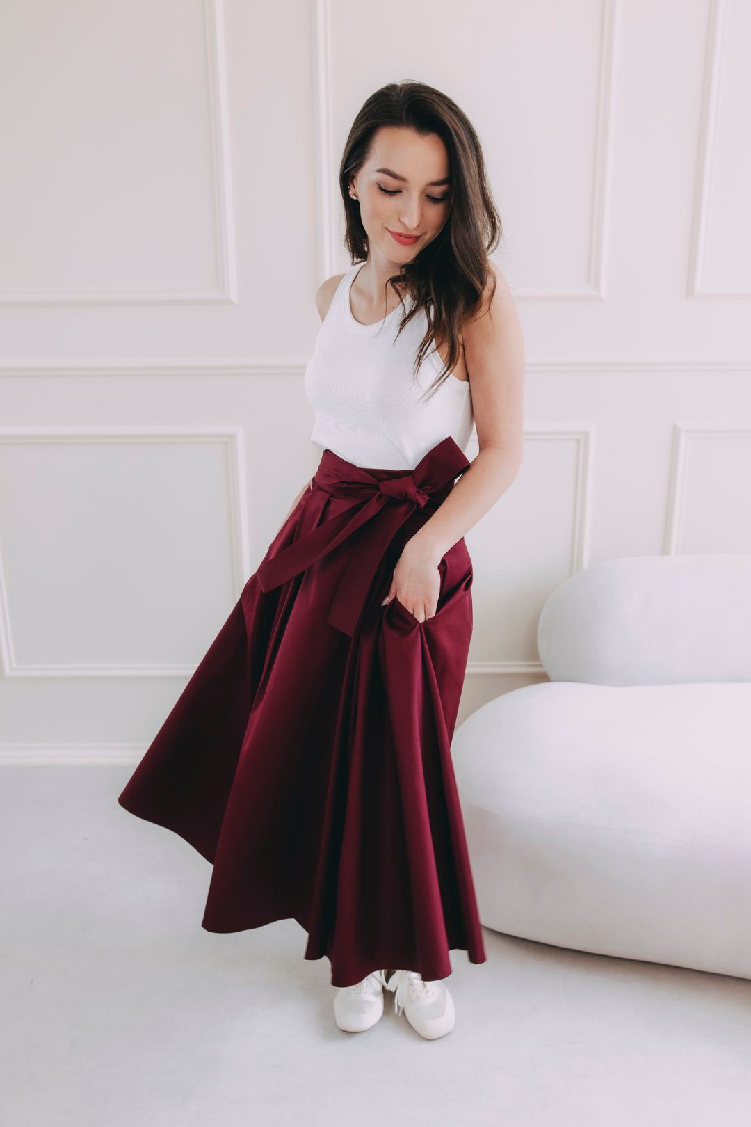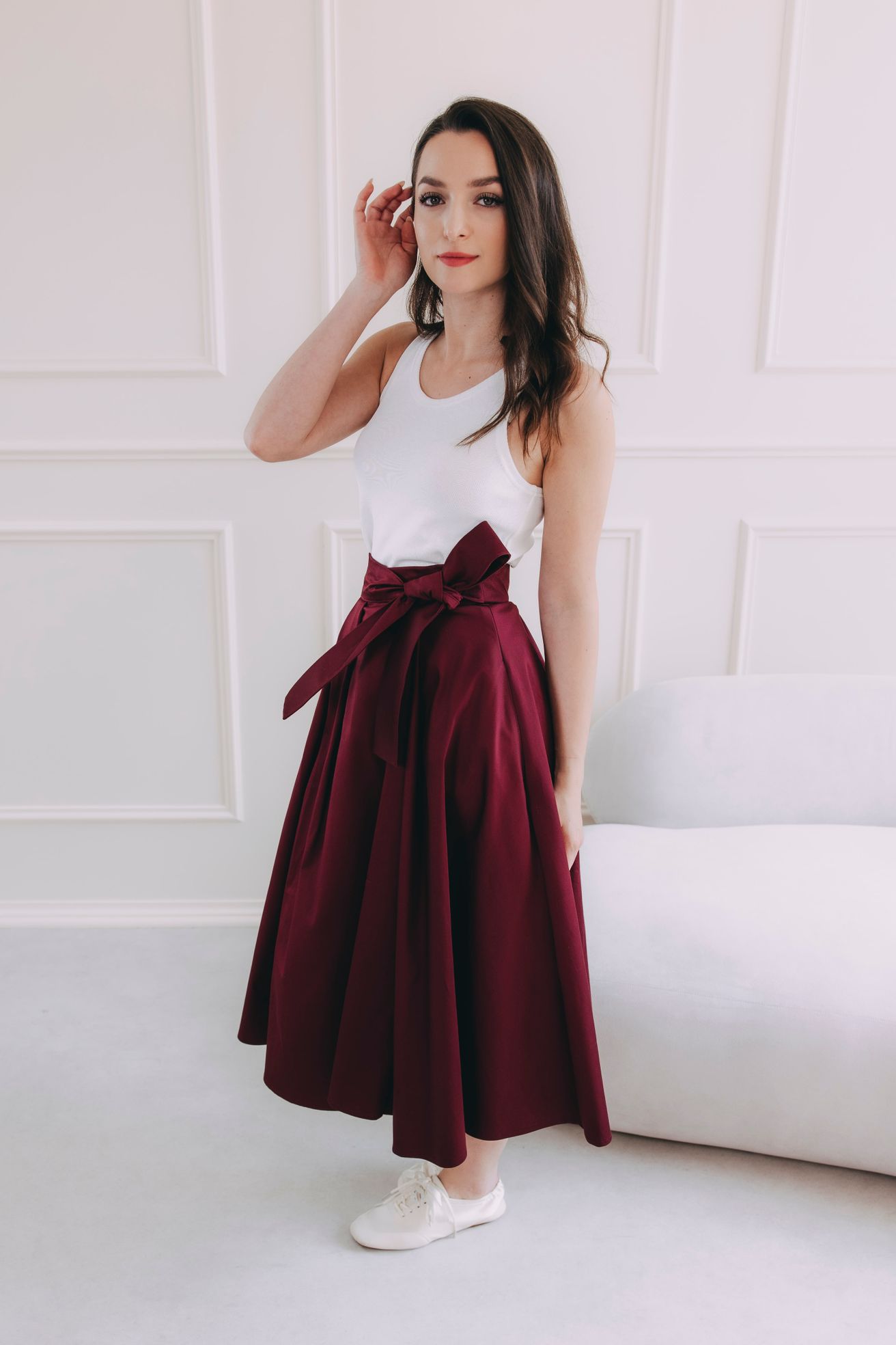 Fantazii se meze nekladou. Mawe se snadno kombinuje s tím, co už máte v šatníku. V létě ji zkombinujte s crop topem, elegantní košilí nebo s body. Až se ochladí, nebojte se ji vrstvit – skvěle vypadá s punčoškami, rolákem a koženou bundou. Stuha v pase je dokonalým detailem pro uvázání mašle, která celý outfit posune na vyšší úroveň.