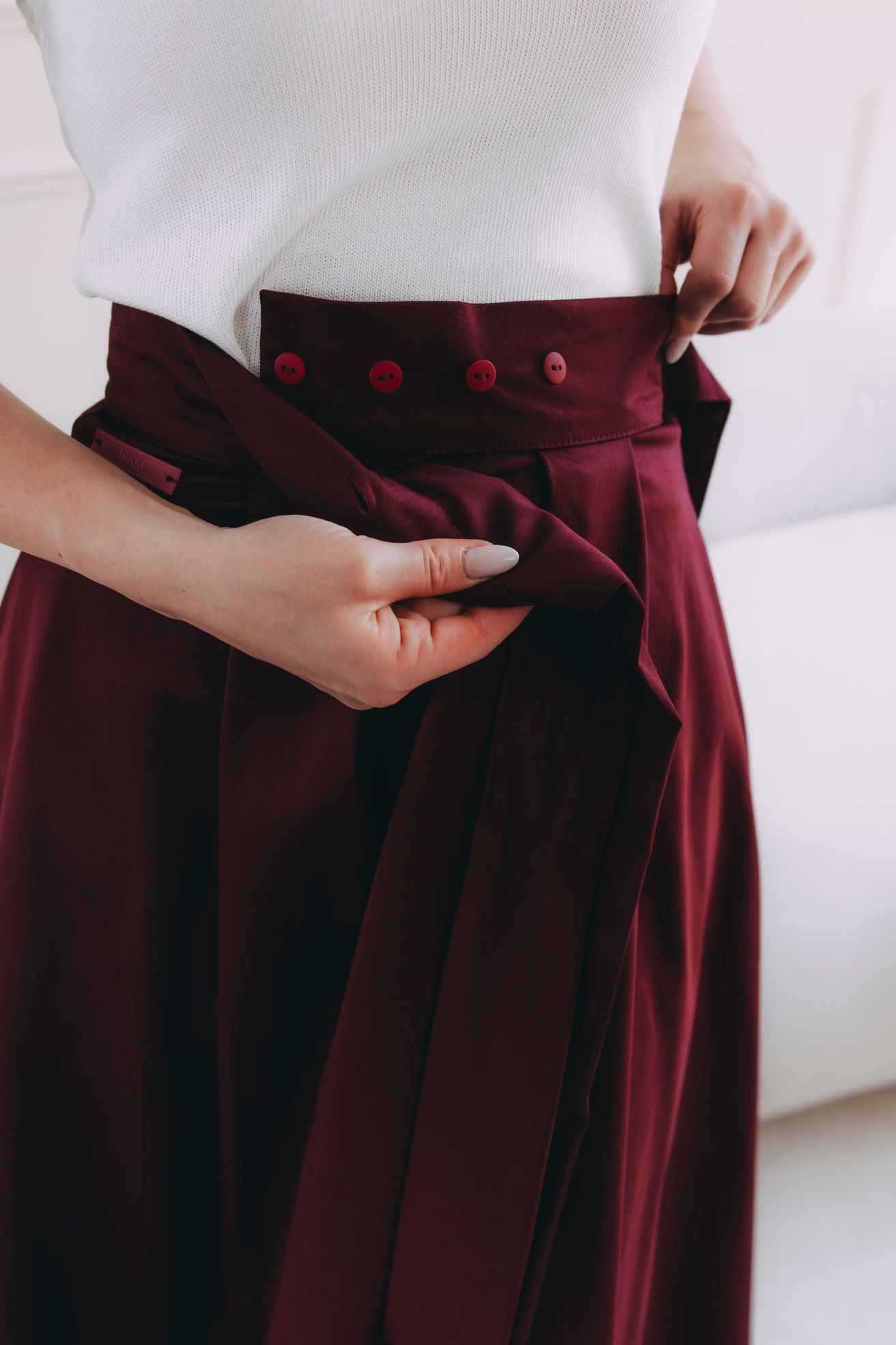 Sukně se zapíná pomocí čtyř knoflíčků a dvou dírek, což umožňuje nastavení pasu přesně na míru a zajišťuje, že krásně drží tam, kde má. Mašle v pase není jen na ozdobu, ale slouží i jako praktická pojistka pro maximální pohodlí a sebevědomí.