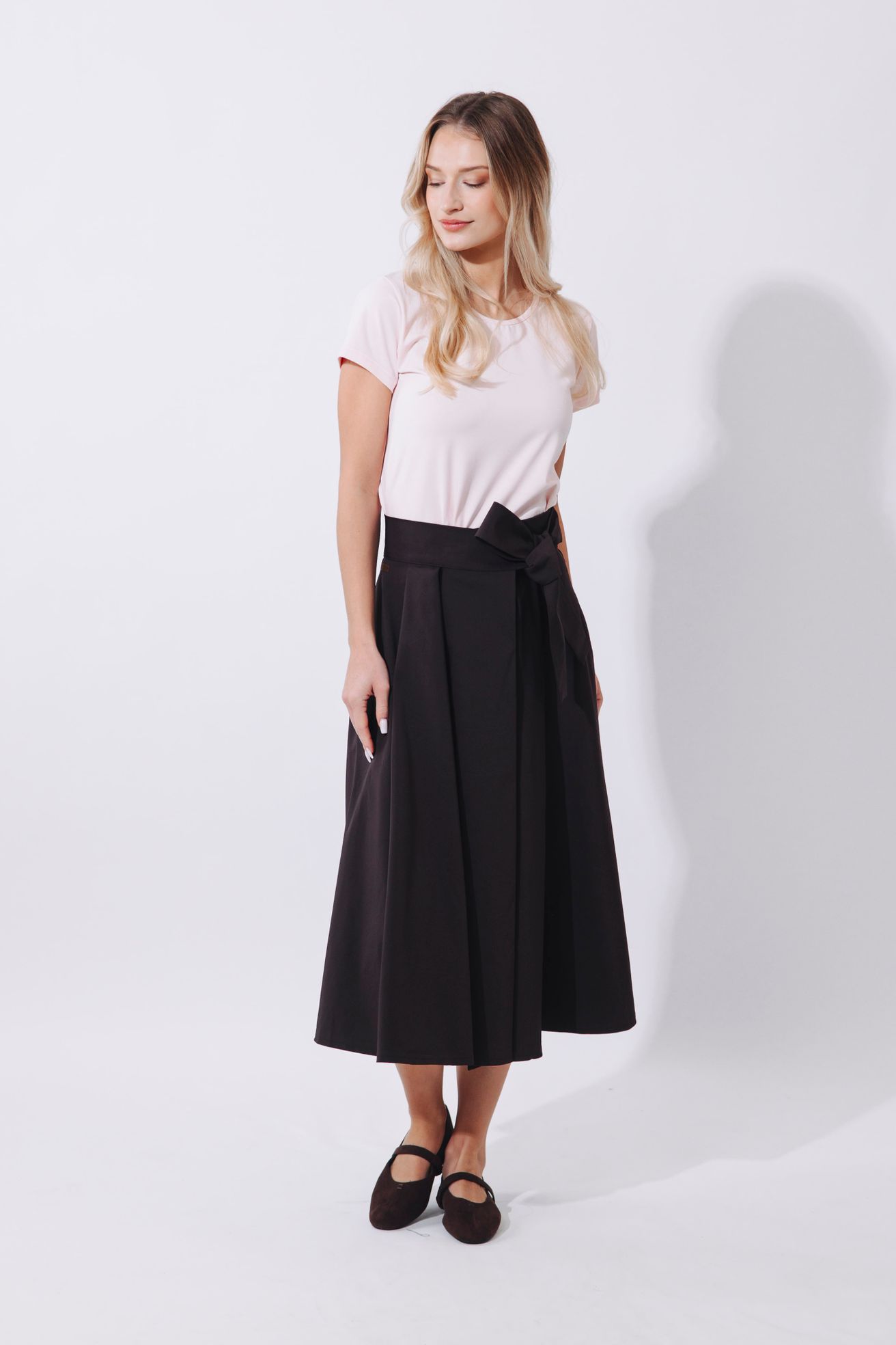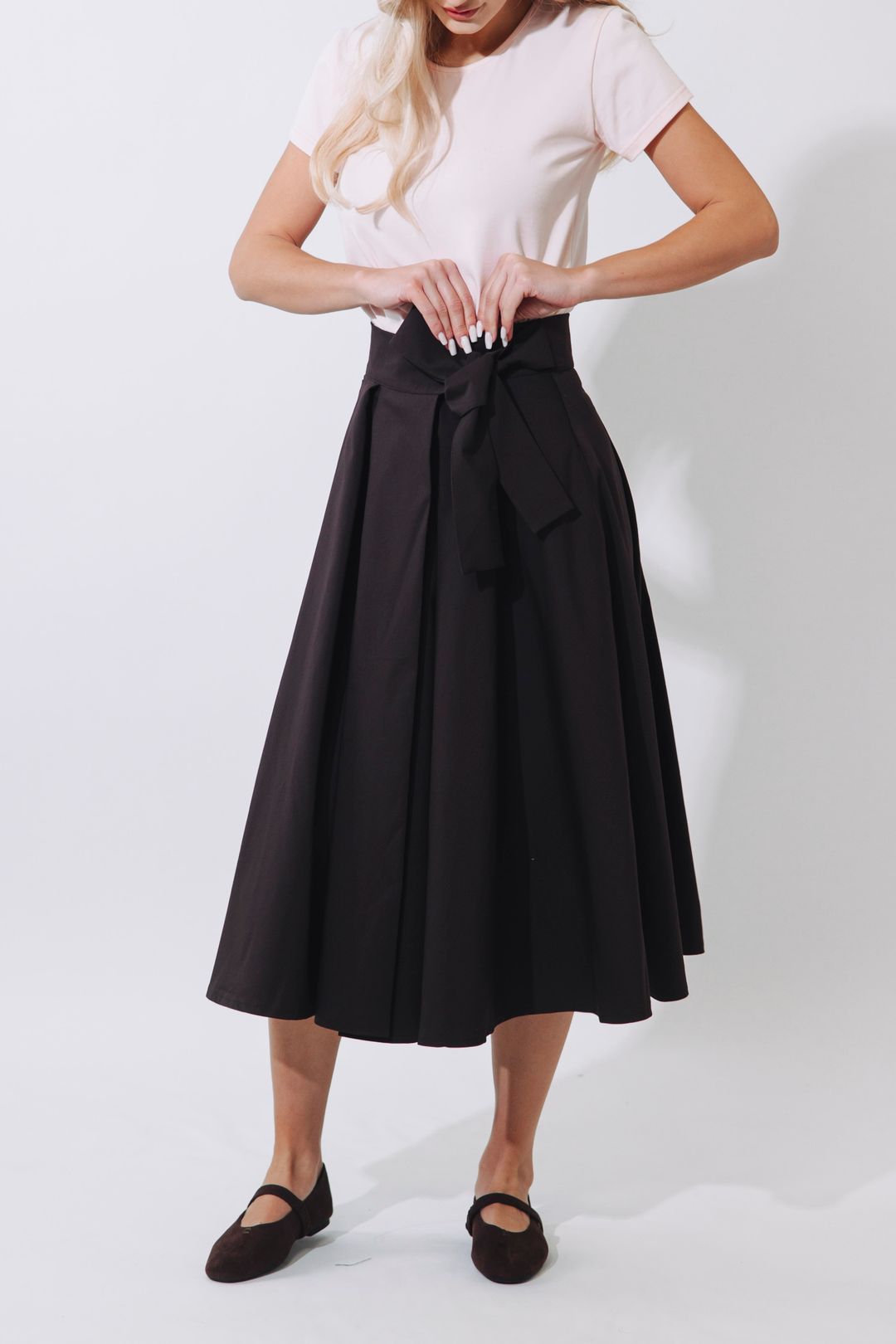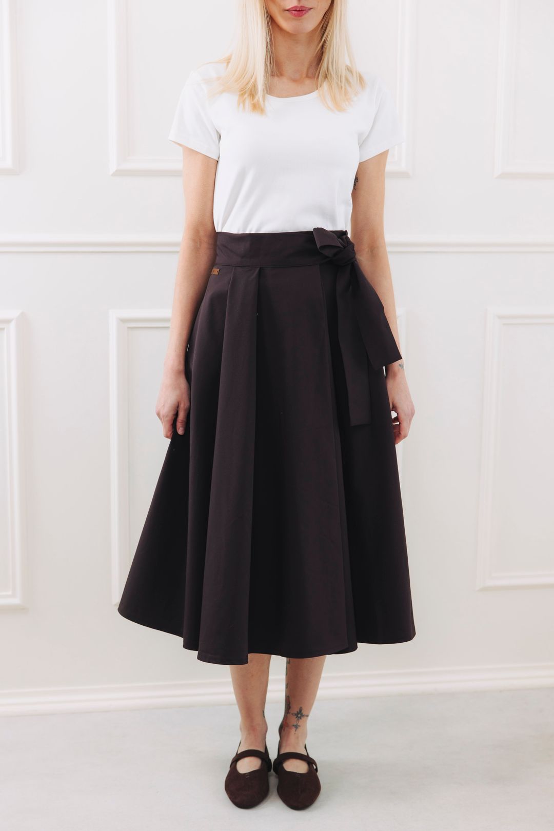 Sukně se zapíná pomocí čtyř knoflíčků a dvou dírek, což umožňuje nastavení pasu přesně na míru a zajišťuje, že krásně drží tam, kde má. Mašle v pase není jen na ozdobu, ale slouží i jako praktická pojistka pro maximální pohodlí a sebevědomí.