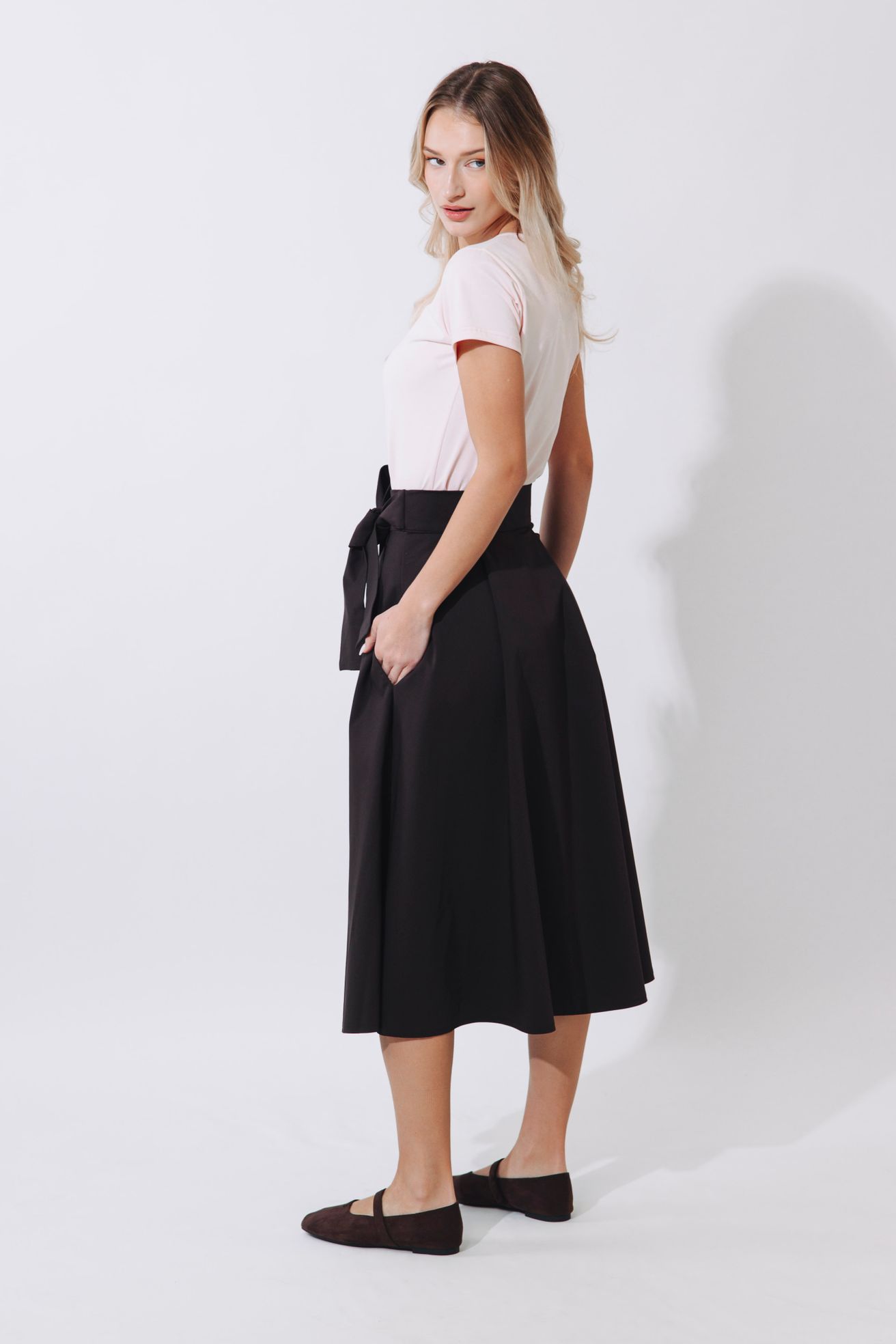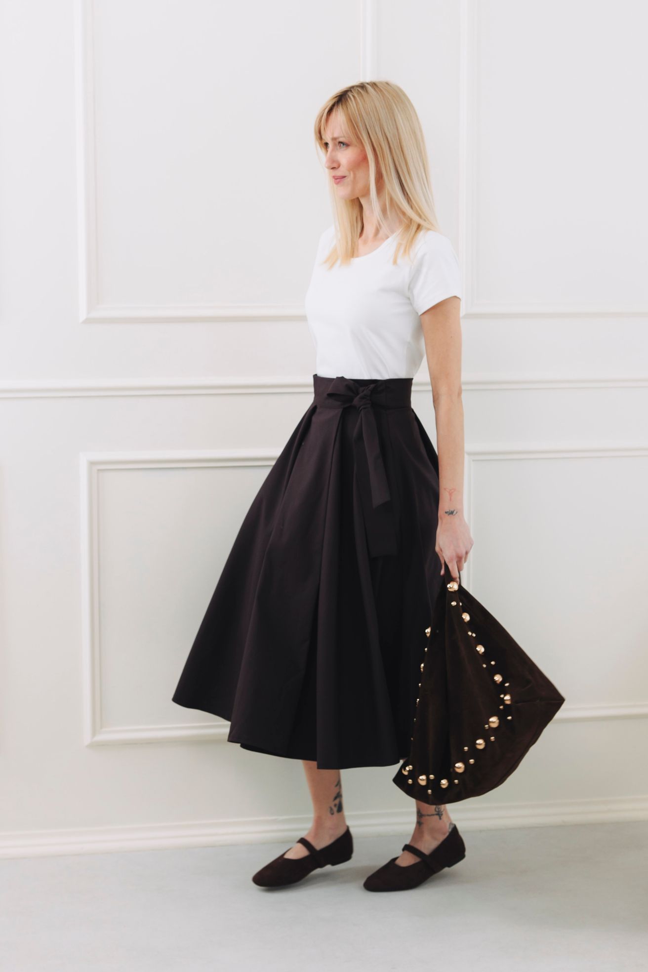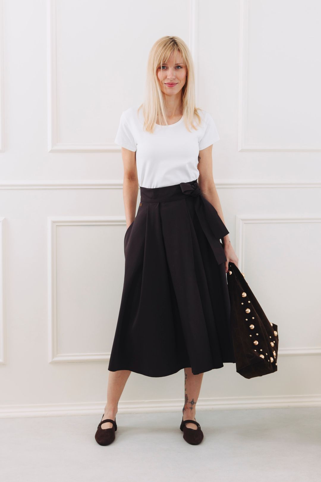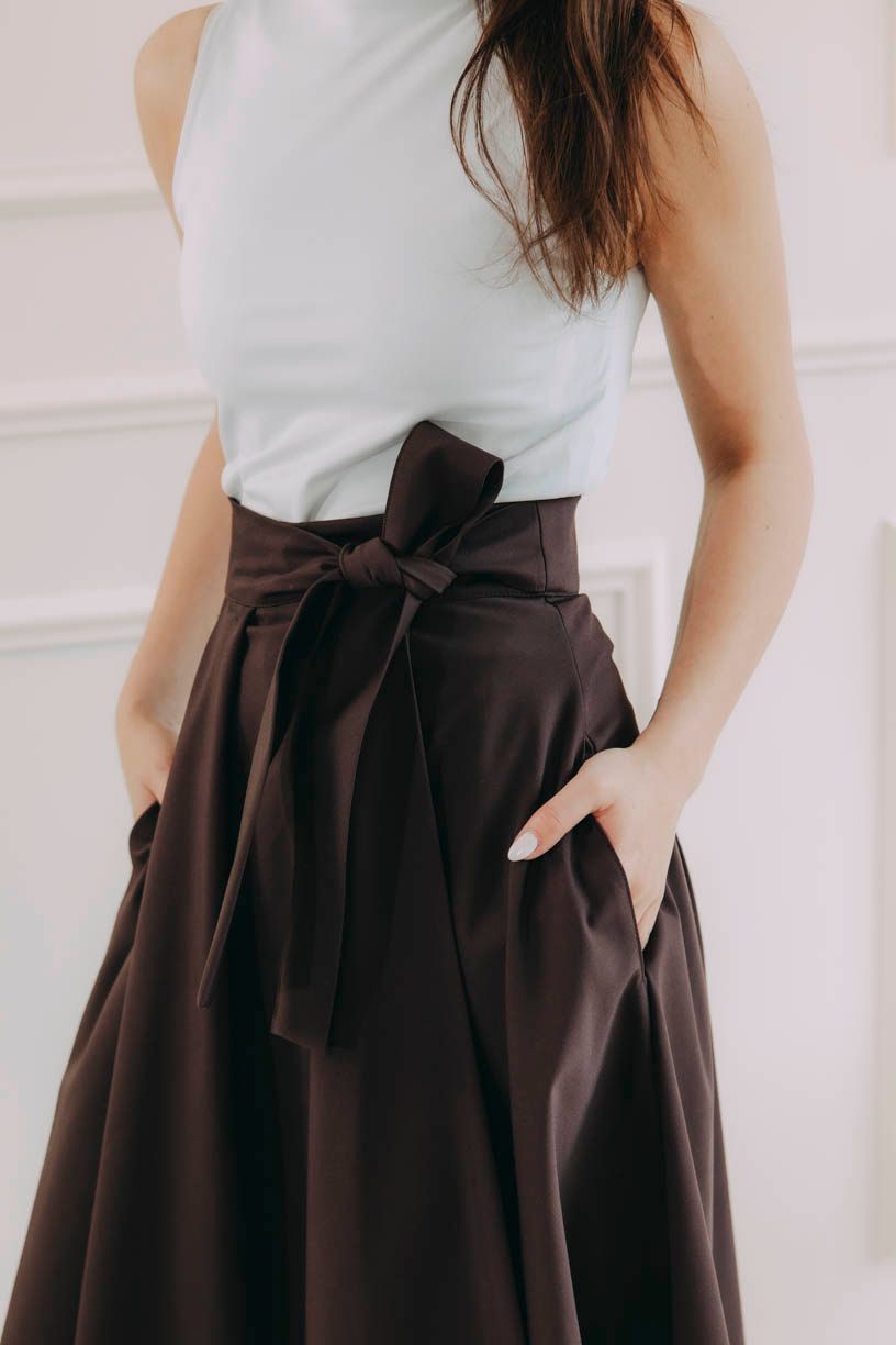 Fantazii se meze nekladou. Mawe se snadno kombinuje s tím, co už máte v šatníku. V létě ji zkombinujte s crop topem, elegantní košilí nebo s body. Až se ochladí, nebojte se ji vrstvit – skvěle vypadá s punčoškami, rolákem a koženou bundou. Stuha v pase je dokonalým detailem pro uvázání mašle, která celý outfit posune na vyšší úroveň.