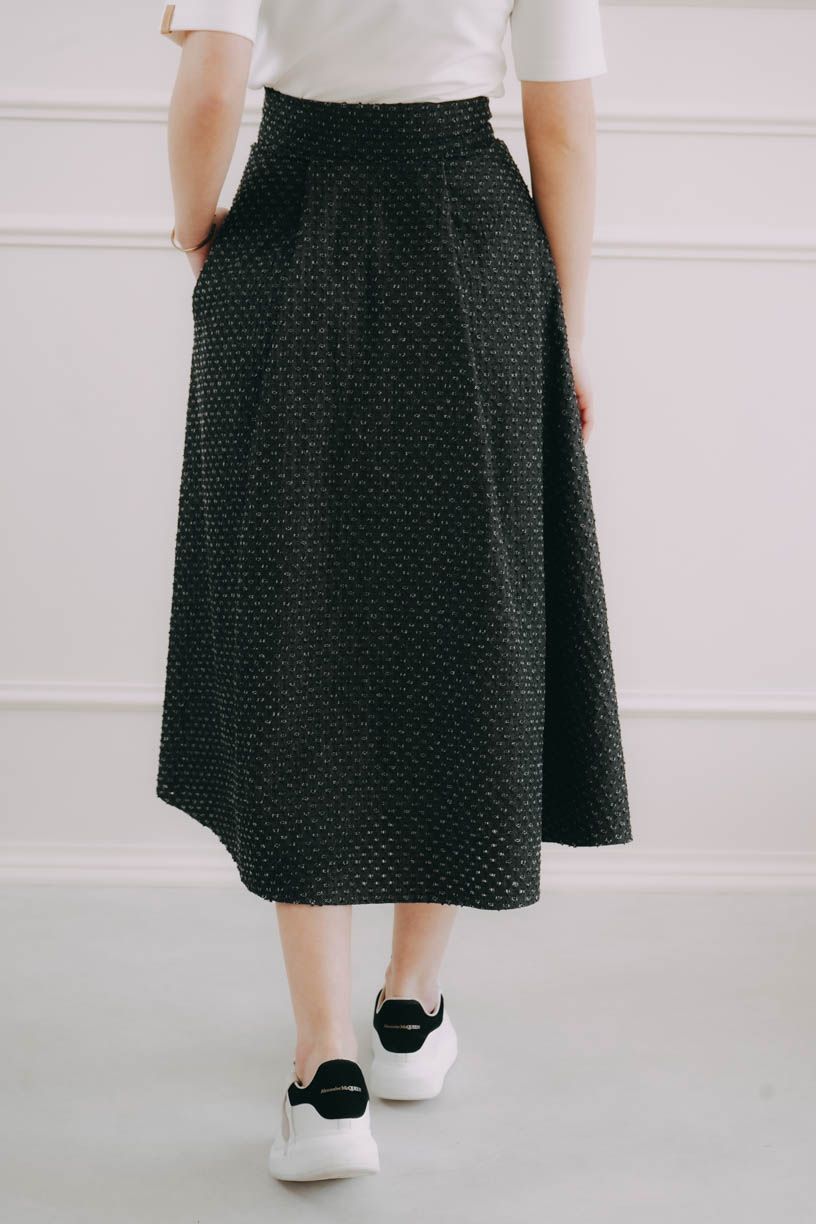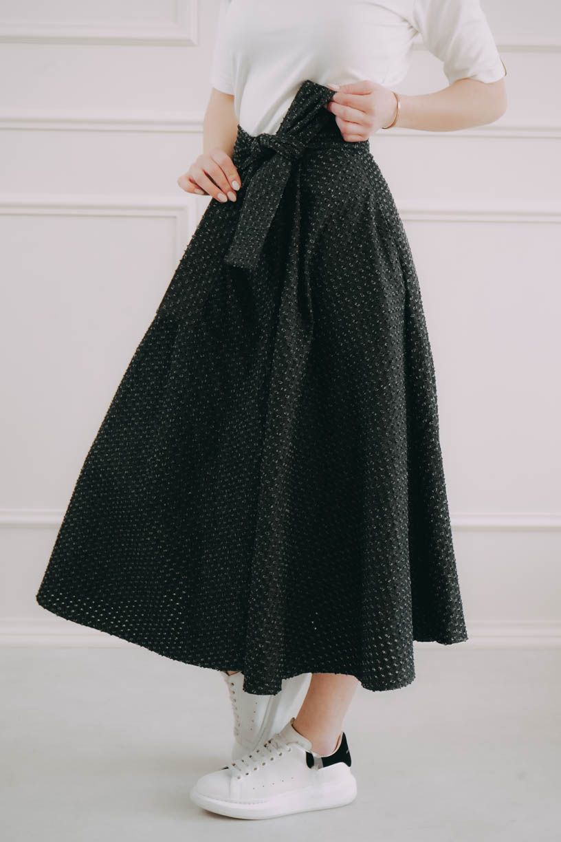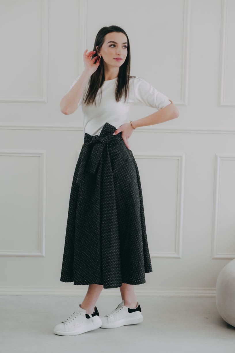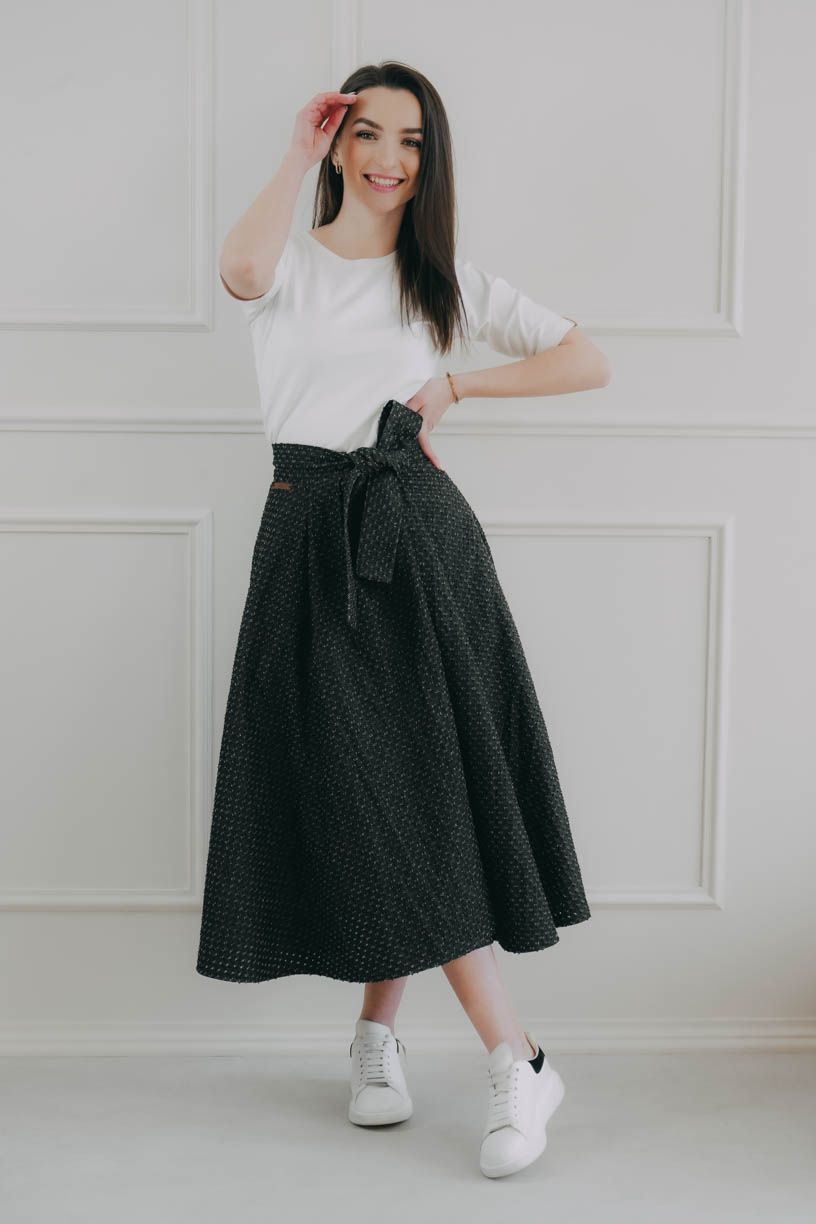 Sukně se zapíná pomocí čtyř knoflíčků a dvou dírek, což umožňuje nastavení pasu přesně na míru a zajišťuje, že krásně drží tam, kde má. Mašle v pase není jen na ozdobu, ale slouží i jako praktická pojistka pro maximální pohodlí a sebevědomí.