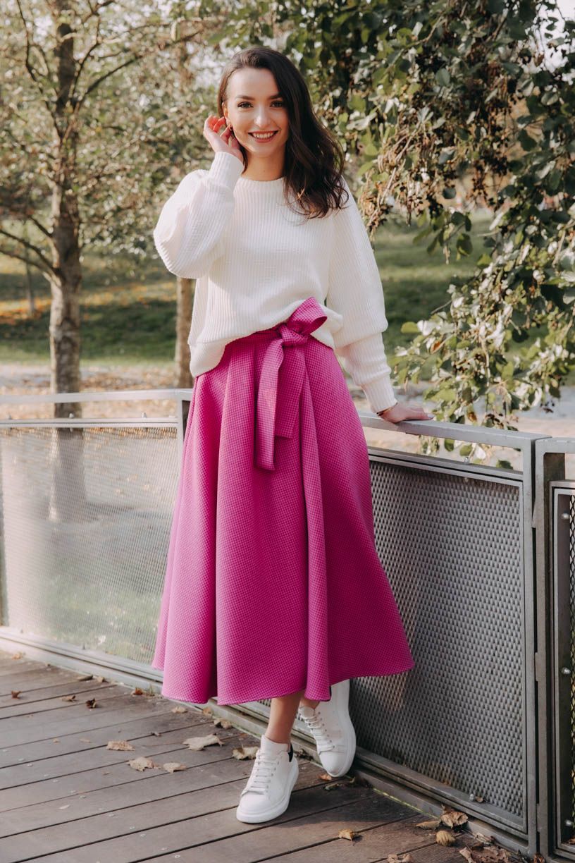 Sukně má 4 knoflíky, kterými se přichytí zavinovací přední díl. Nastavení těsnosti pasu je tak plně ve vaší režii. Aby bylo maskování případných nedostatků dokonalé, našili jsme v linii pasu dlouhou stuhu na uvázání efektní mašle.