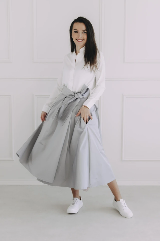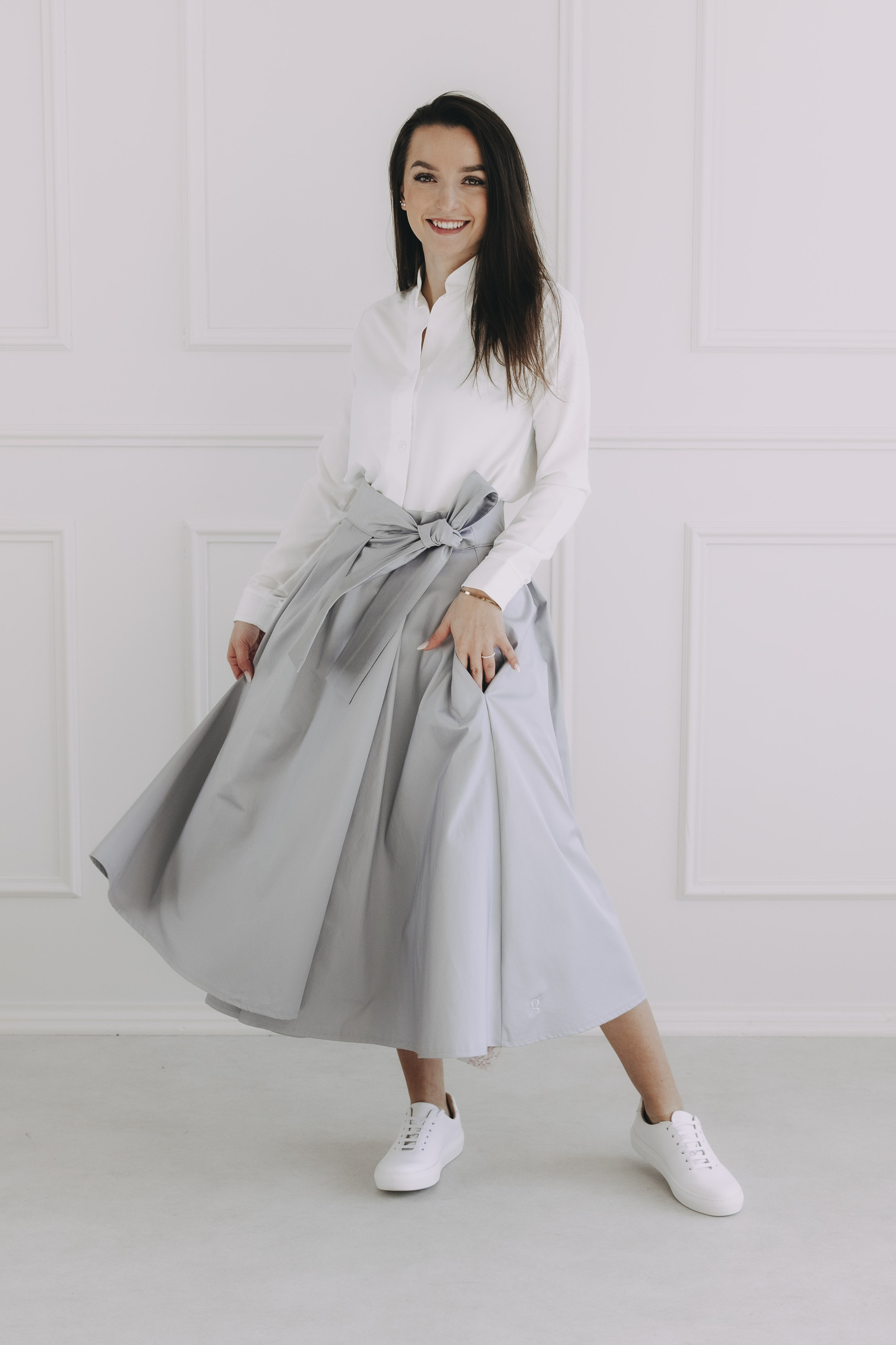 Fantazii se meze nekladou. Mawe se snadno kombinuje s tím, co už máte v šatníku. V létě ji zkombinujte s crop topem, elegantní košilí nebo s body. Až se ochladí, nebojte se ji vrstvit – skvěle vypadá s punčoškami, rolákem a koženou bundou. Stuha v pase je dokonalým detailem pro uvázání mašle, která celý outfit posune na vyšší úroveň.