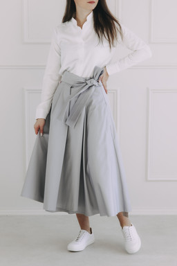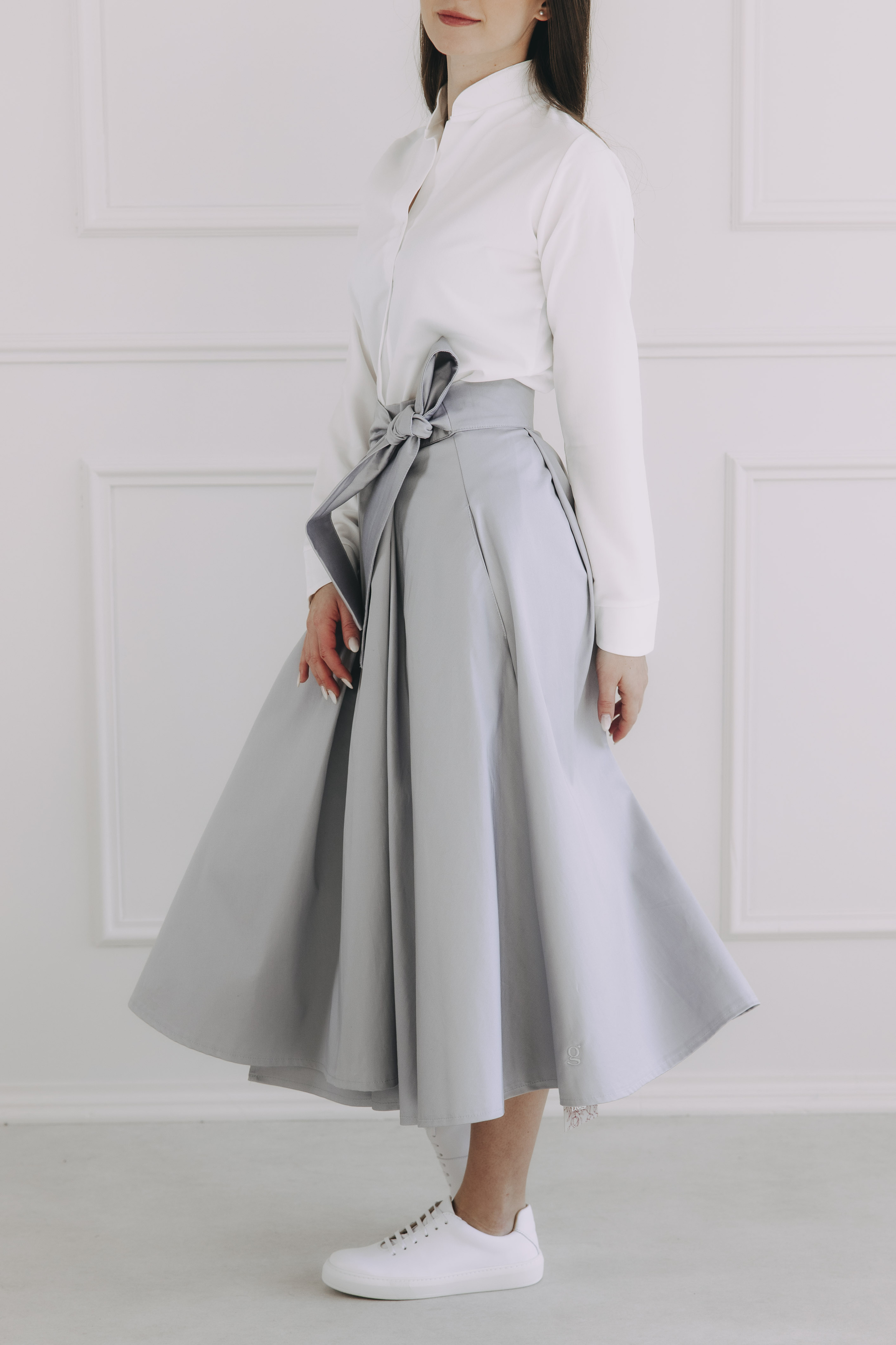 Sukně se zapíná pomocí čtyř knoflíčků a dvou dírek, což umožňuje nastavení pasu přesně na míru a zajišťuje, že krásně drží tam, kde má. Mašle v pase není jen na ozdobu, ale slouží i jako praktická pojistka pro maximální pohodlí a sebevědomí.