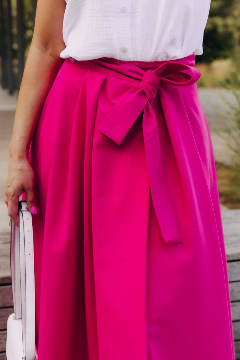 Sukně má 4 knoflíky, kterými se přichytí zavinovací přední díl. Nastavení těsnosti pasu je tak plně ve vaší režii. Aby bylo maskování případných nedostatků dokonalé, našili jsme v linii pasu dlouhou stuhu na uvázání efektní mašle.