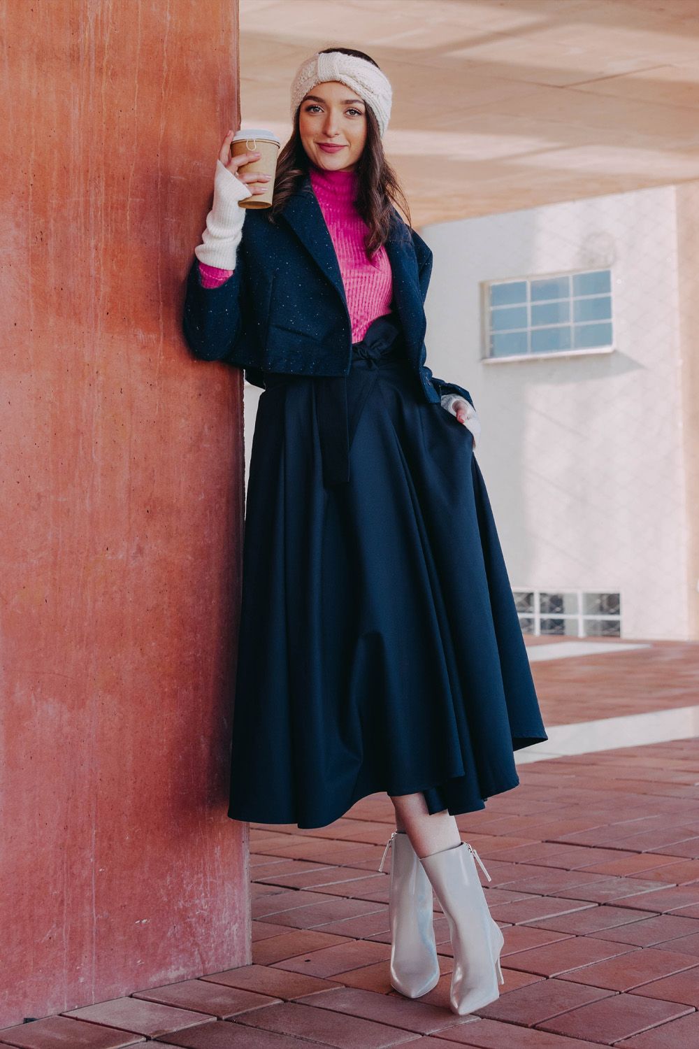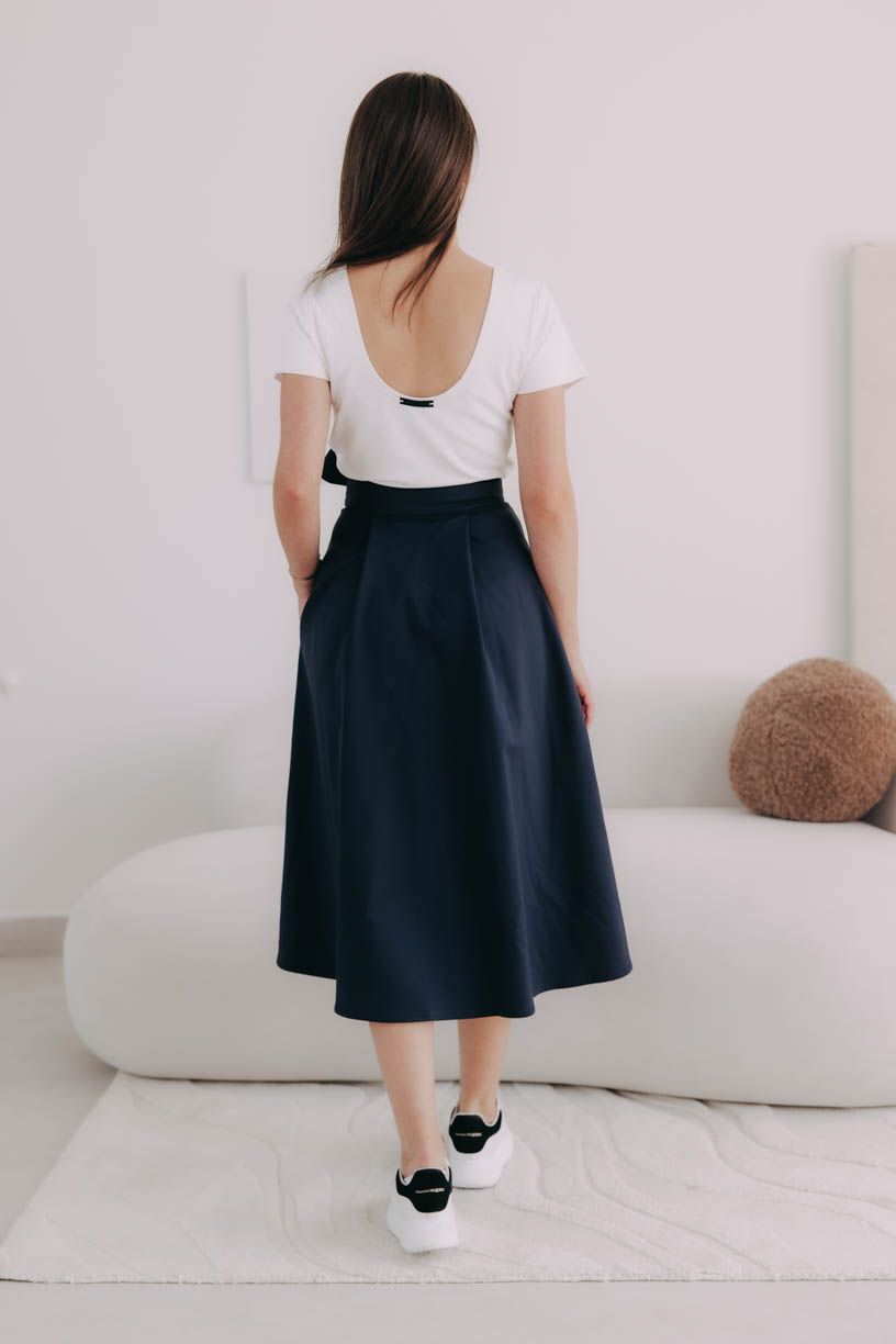 Sukně se zapíná pomocí čtyř knoflíčků a dvou dírek, což umožňuje nastavení pasu přesně na míru a zajišťuje, že krásně drží tam, kde má. Mašle v pase není jen na ozdobu, ale slouží i jako praktická pojistka pro maximální pohodlí a sebevědomí.