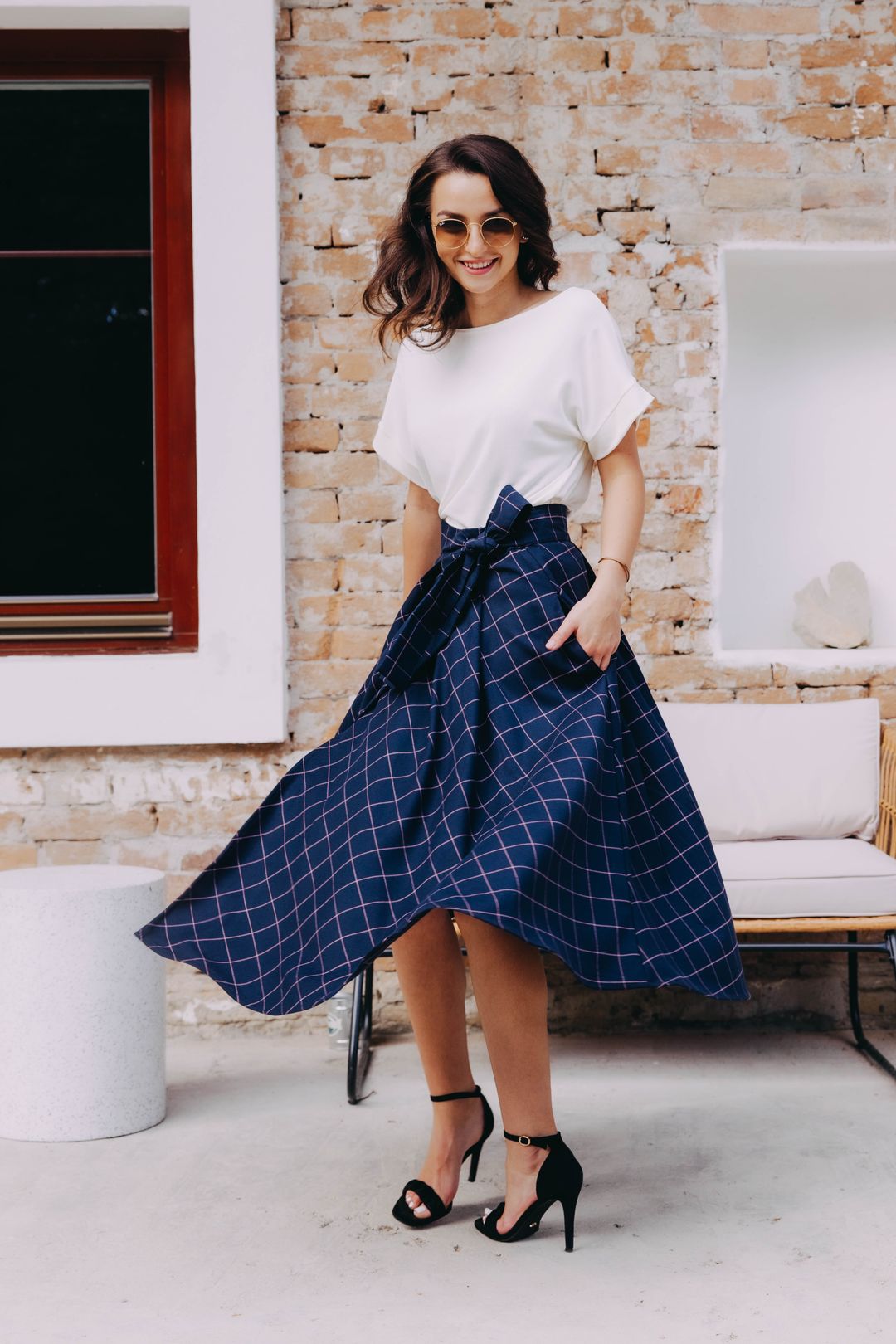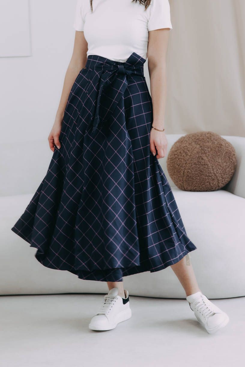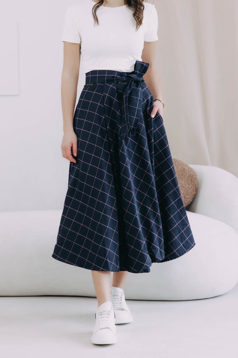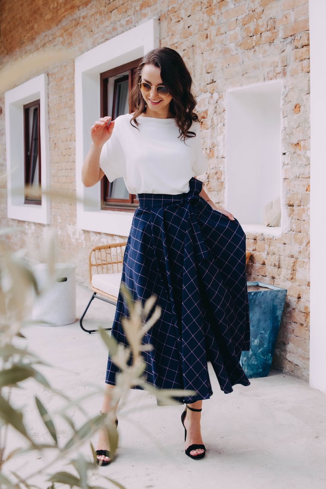 Sukně se zapíná pomocí čtyř knoflíčků a dvou dírek, což umožňuje nastavení pasu přesně na míru a zajišťuje, že krásně drží tam, kde má. Mašle v pase není jen na ozdobu, ale slouží i jako praktická pojistka pro maximální pohodlí a sebevědomí.