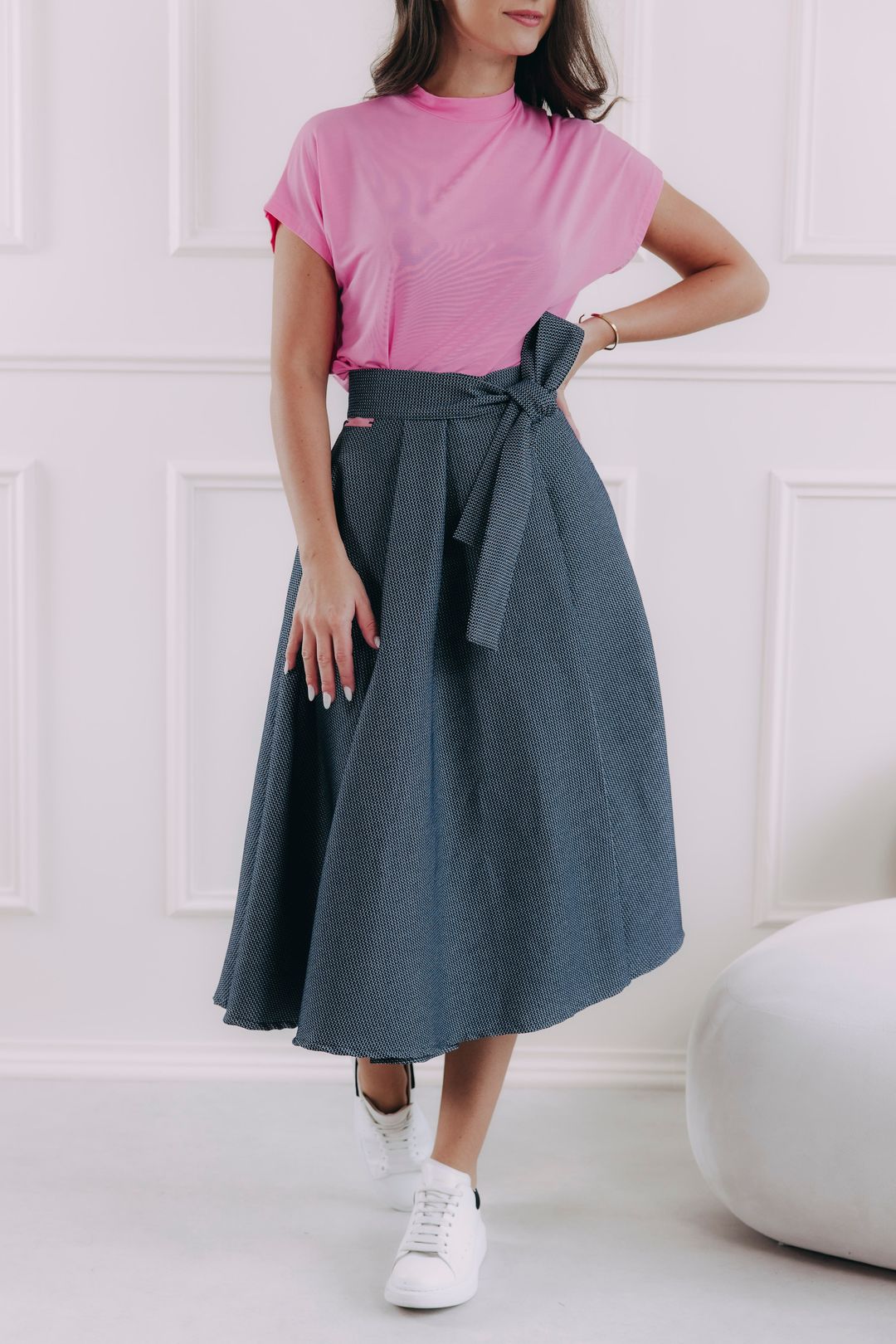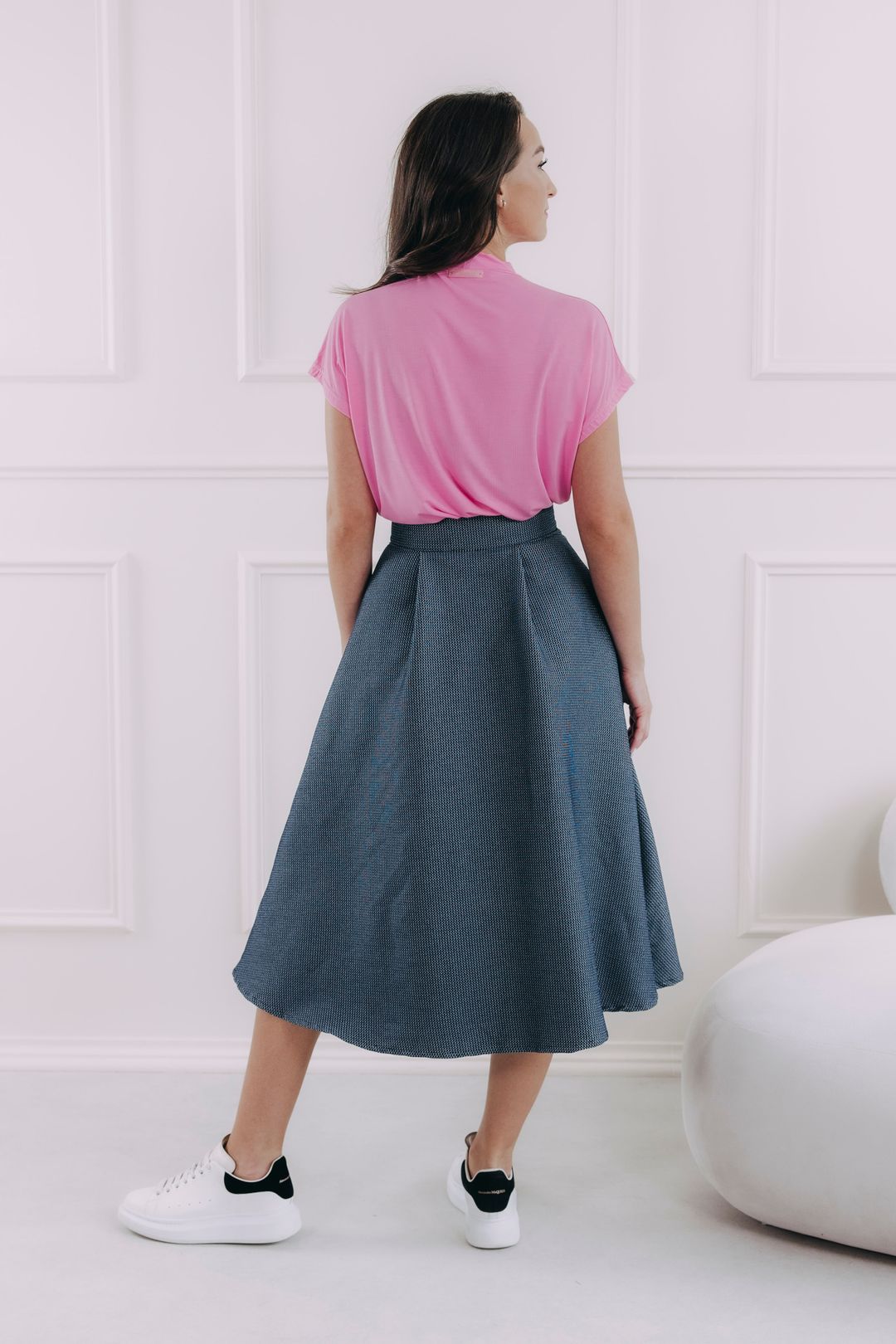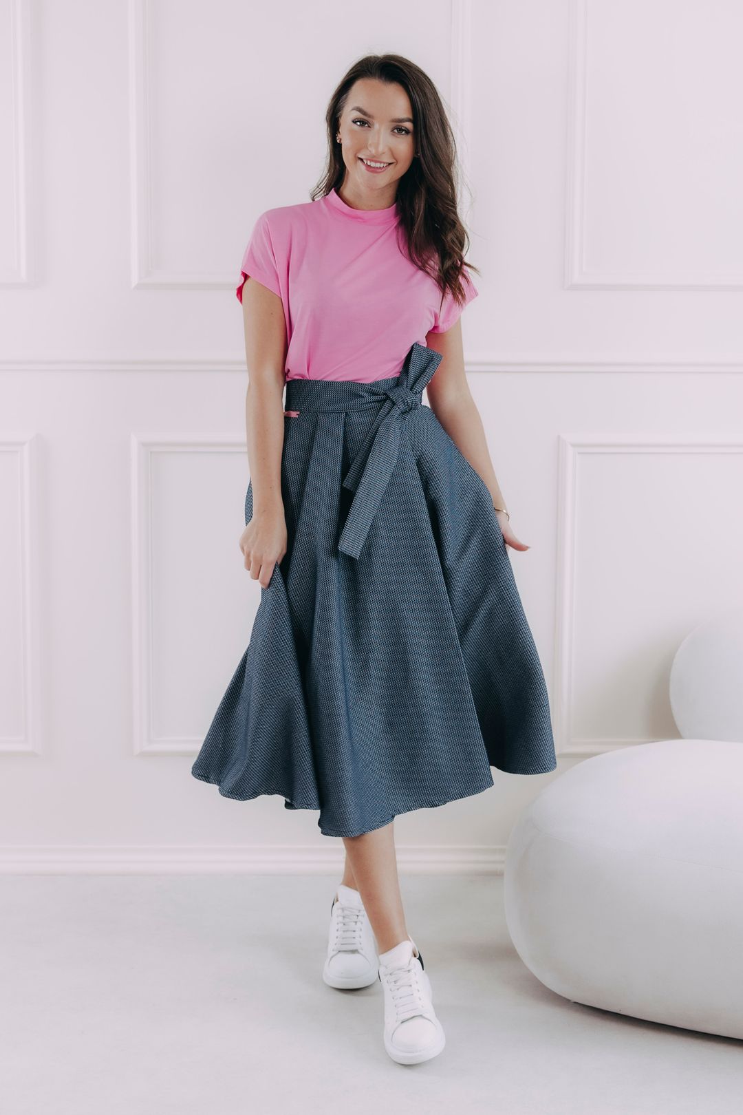 Sukně se zapíná pomocí čtyř knoflíčků a dvou dírek, což umožňuje nastavení pasu přesně na míru a zajišťuje, že krásně drží tam, kde má. Mašle v pase není jen na ozdobu, ale slouží i jako praktická pojistka pro maximální pohodlí a sebevědomí.