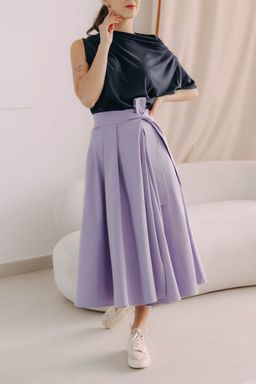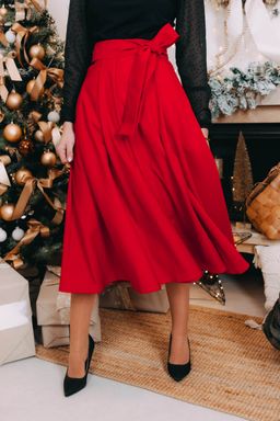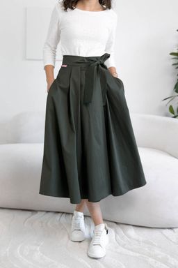 Sukně se zapíná pomocí čtyř knoflíčků a dvou dírek, což umožňuje nastavení pasu přesně na míru a zajišťuje, že krásně drží tam, kde má. Mašle v pase není jen na ozdobu, ale slouží i jako praktická pojistka pro maximální pohodlí a sebevědomí.