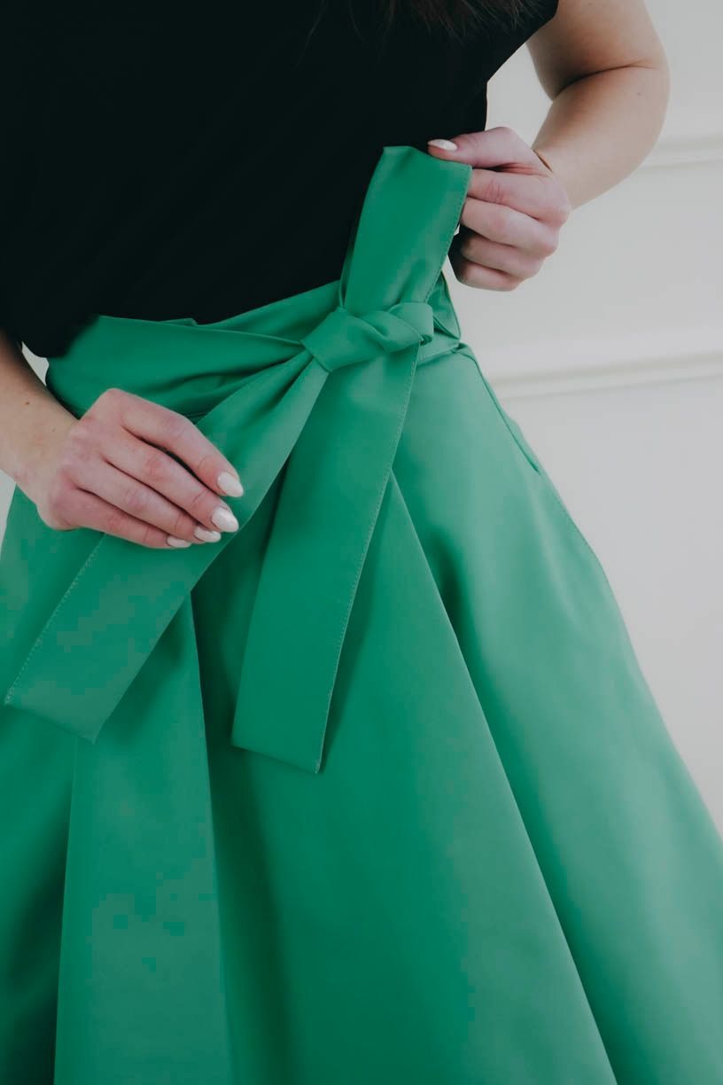 Sukně se zapíná pomocí čtyř knoflíčků a dvou dírek, což umožňuje nastavení pasu přesně na míru a zajišťuje, že krásně drží tam, kde má. Mašle v pase není jen na ozdobu, ale slouží i jako praktická pojistka pro maximální pohodlí a sebevědomí.