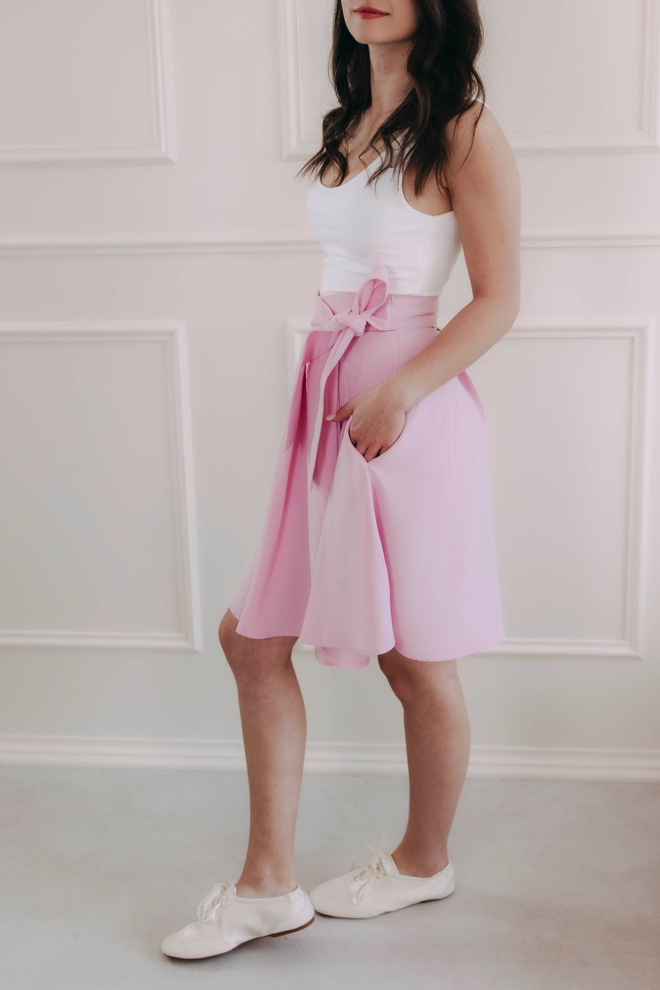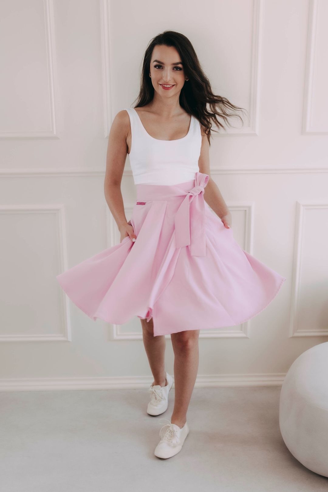 Sukně se zapíná pomocí čtyř knoflíčků a dvou dírek, což umožňuje nastavení pasu přesně na míru a zajišťuje, že krásně drží tam, kde má. Mašle v pase není jen na ozdobu, ale slouží i jako praktická pojistka pro maximální pohodlí a sebevědomí.
