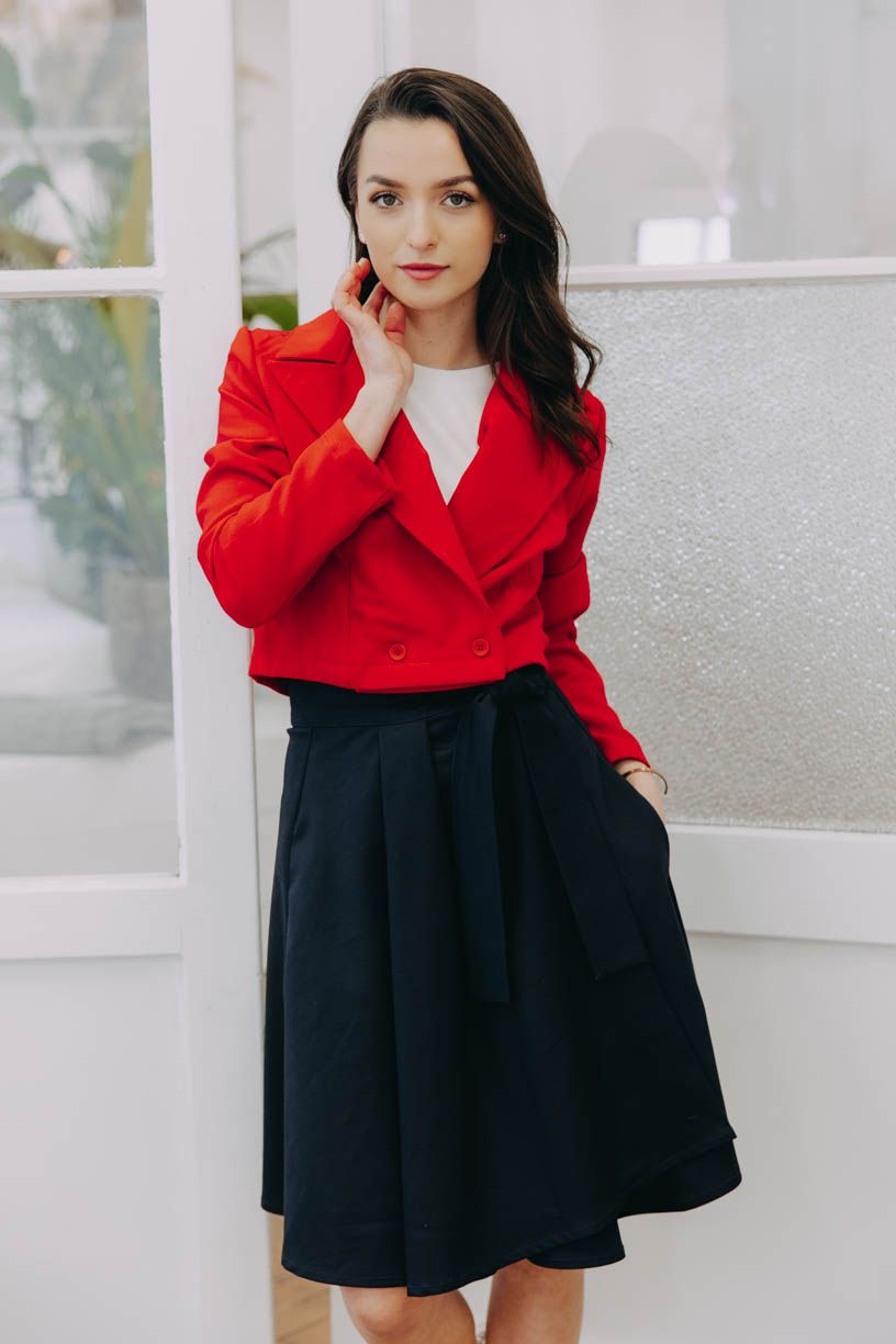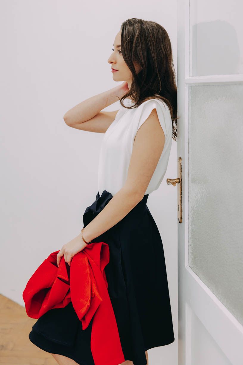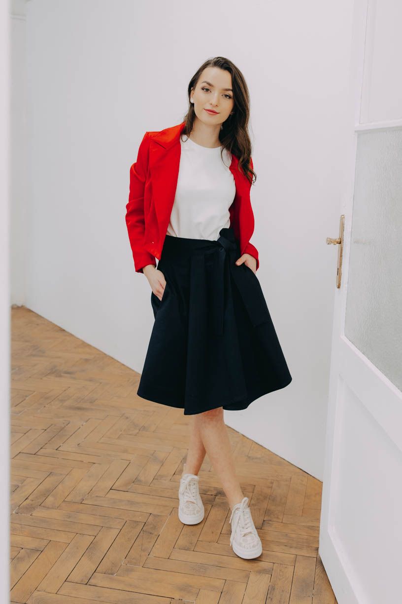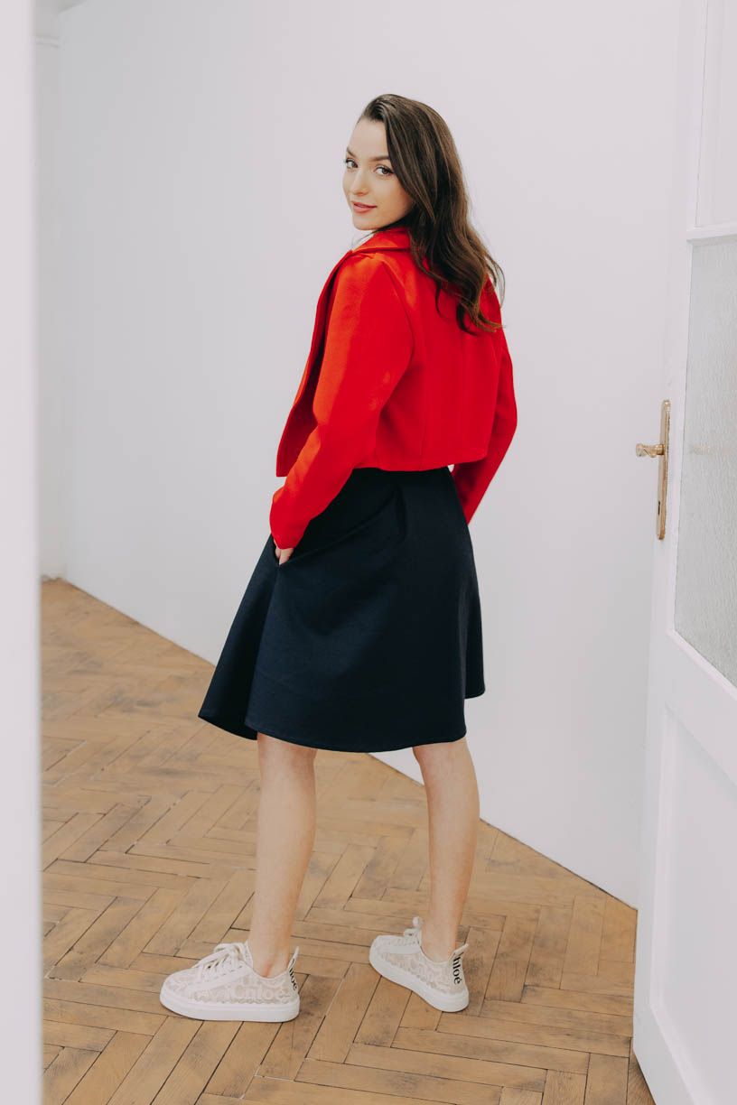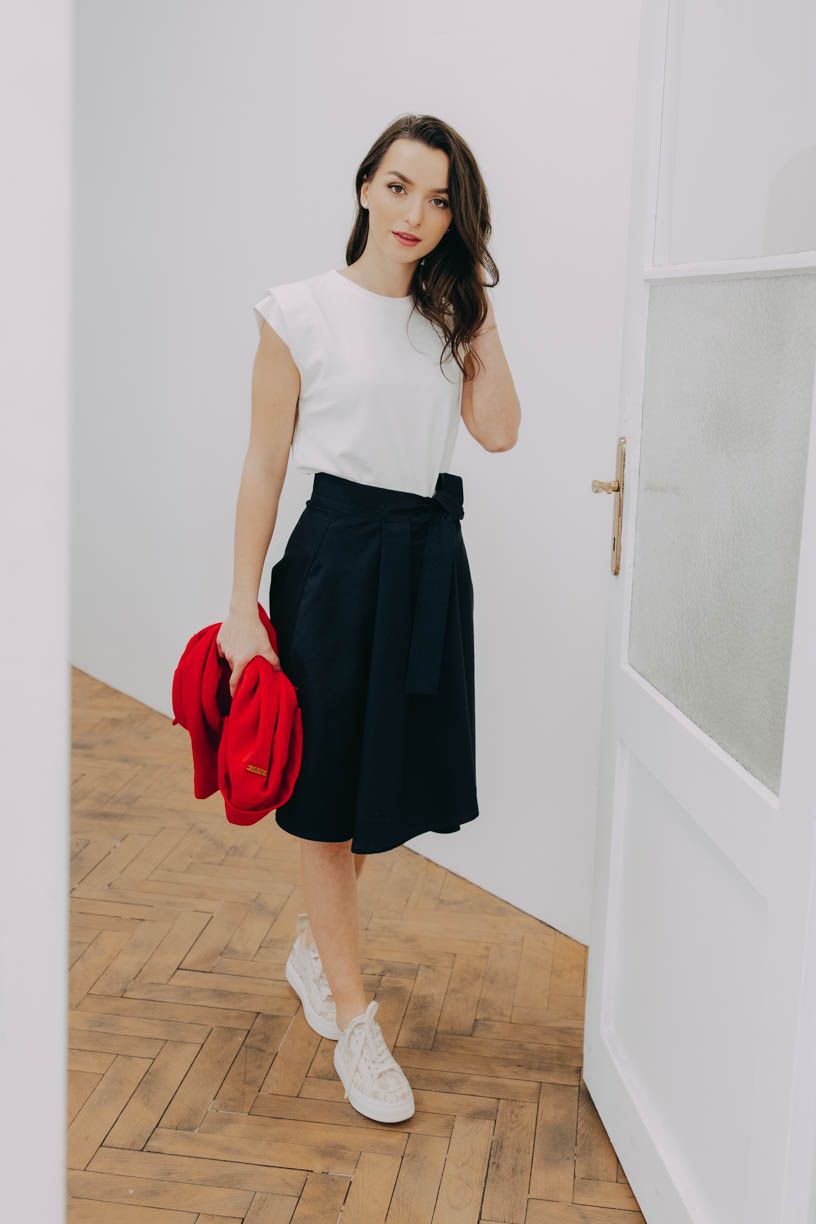 Sukně se zapíná pomocí čtyř knoflíčků a dvou dírek, což umožňuje nastavení pasu přesně na míru a zajišťuje, že krásně drží tam, kde má. Mašle v pase není jen na ozdobu, ale slouží i jako praktická pojistka pro maximální pohodlí a sebevědomí.