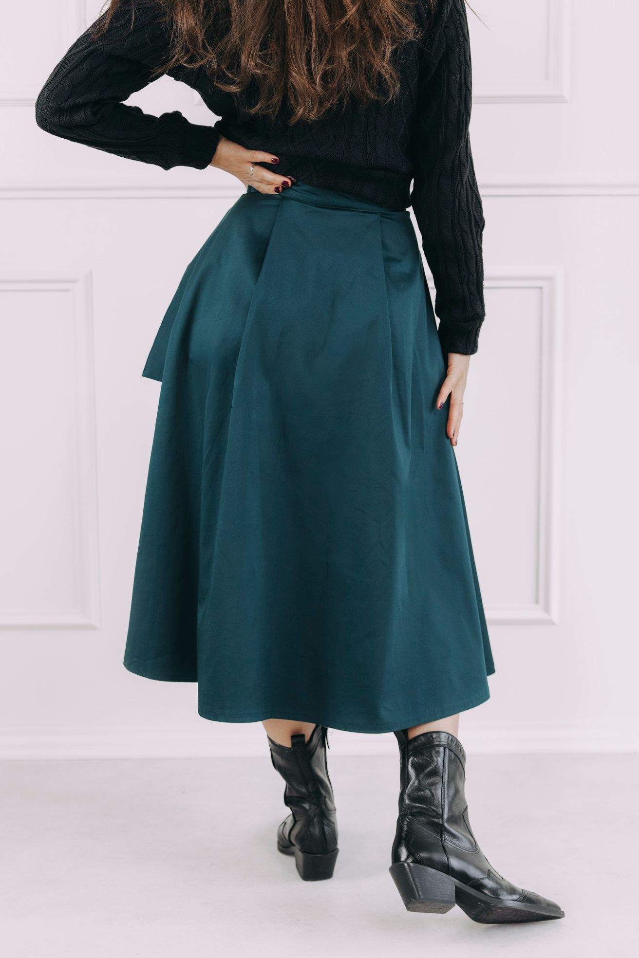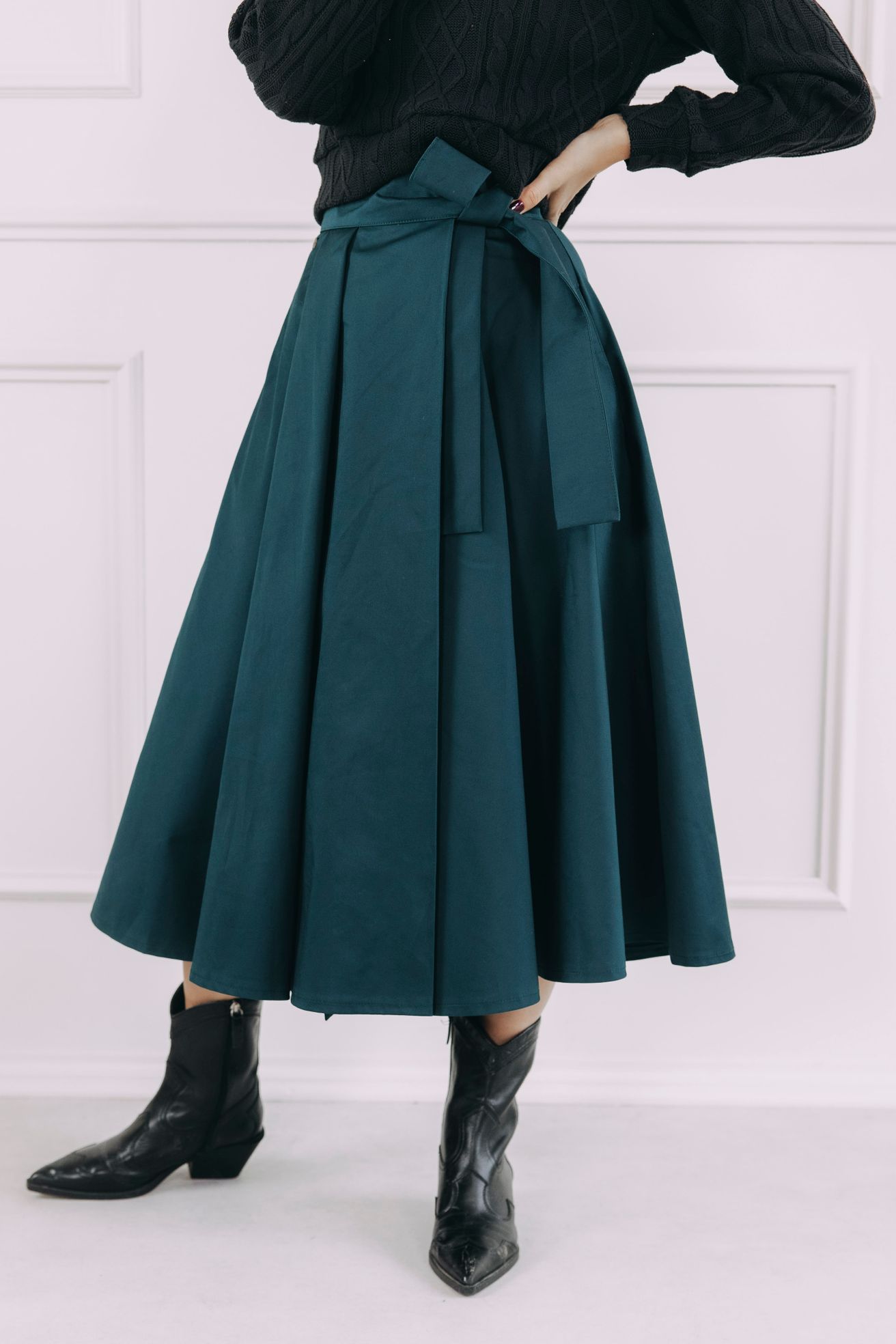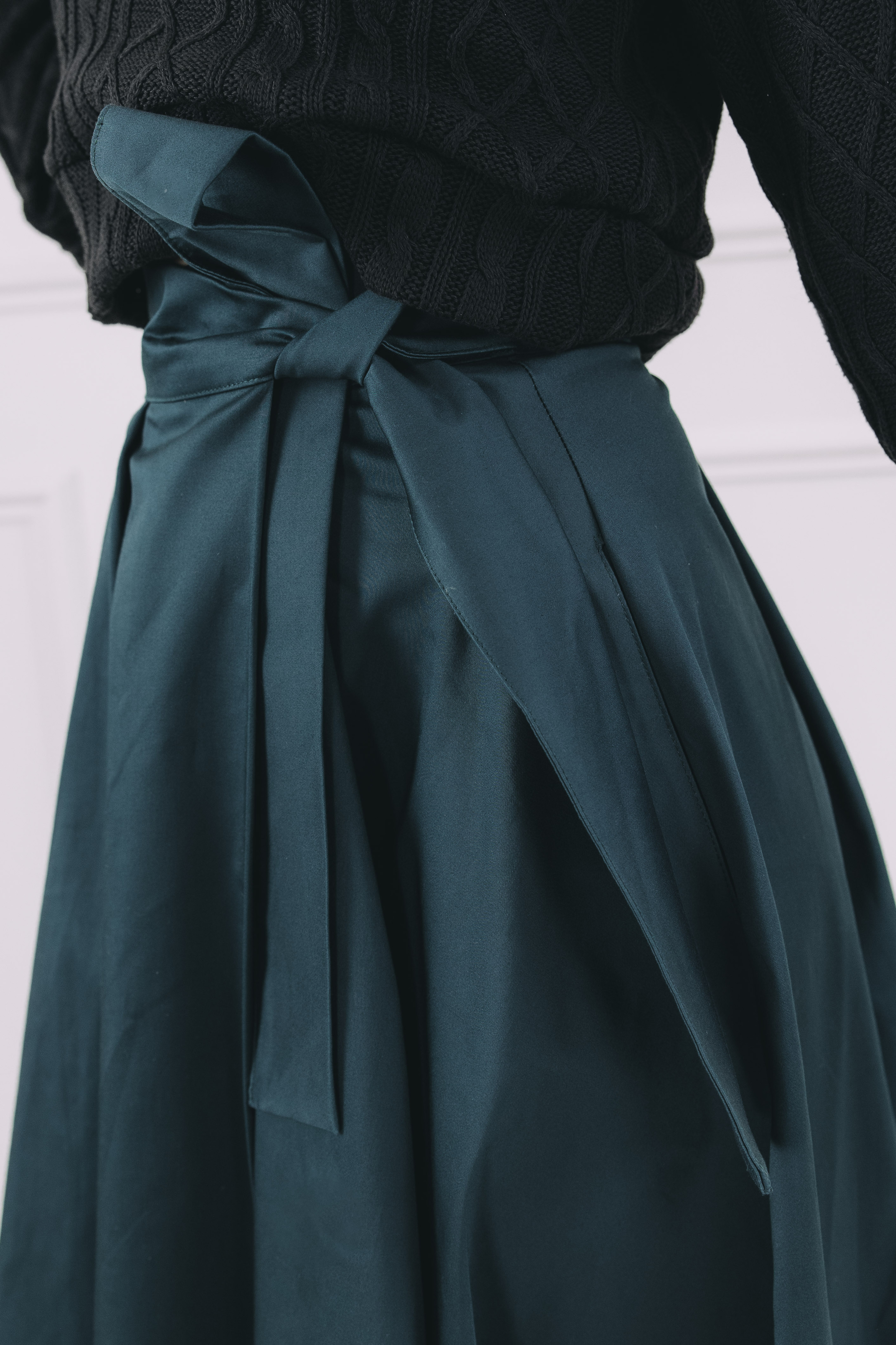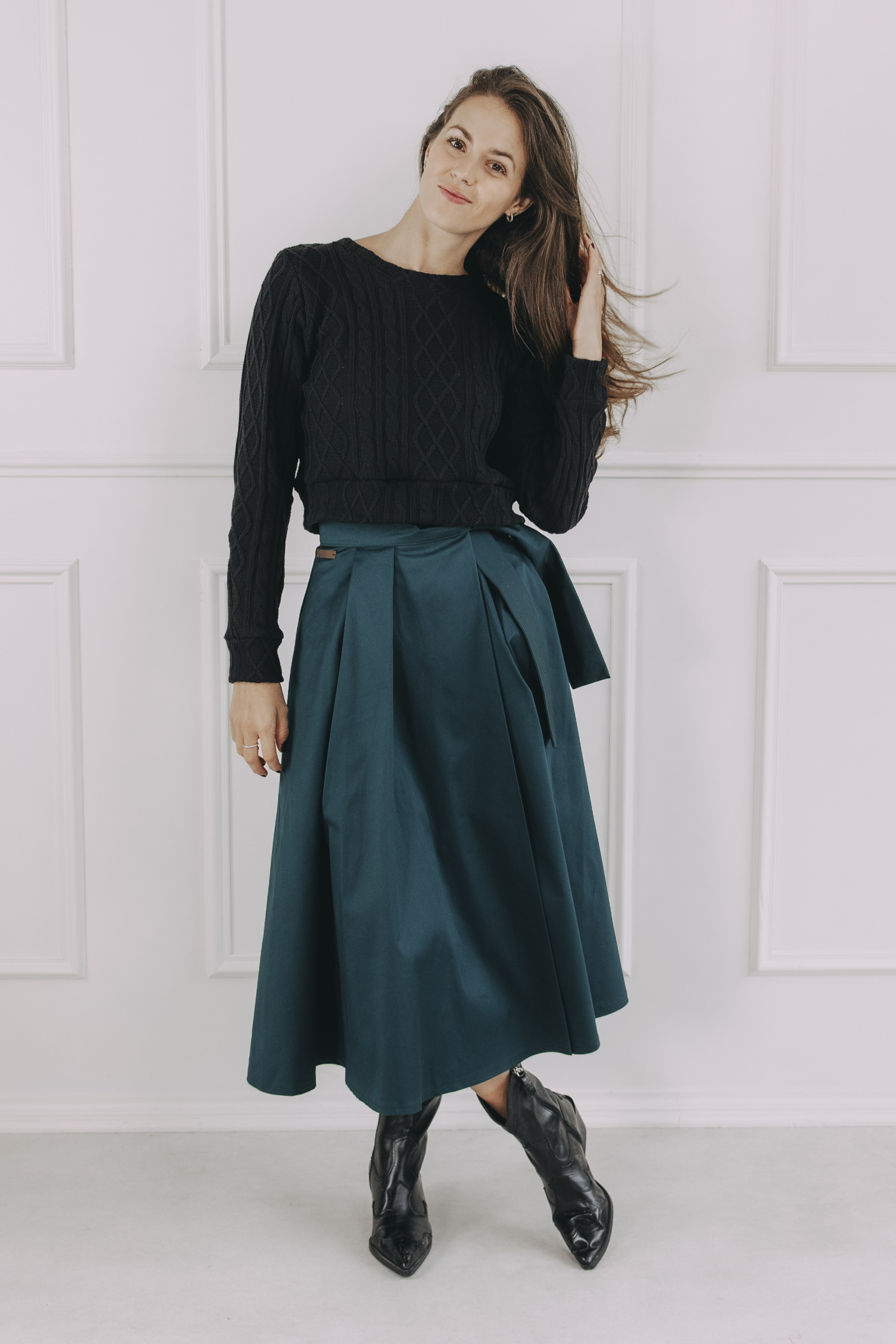 Sukně se zapíná pomocí čtyř knoflíčků a dvou dírek, což umožňuje nastavení pasu přesně na míru a zajišťuje, že krásně drží tam, kde má. Mašle v pase není jen na ozdobu, ale slouží i jako praktická pojistka pro maximální pohodlí a sebevědomí.