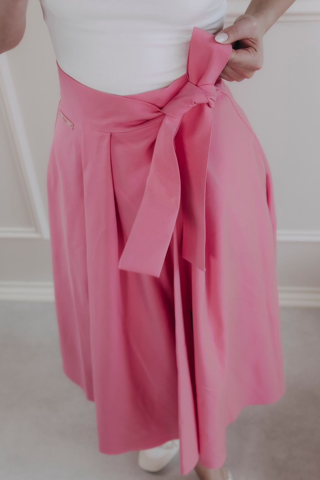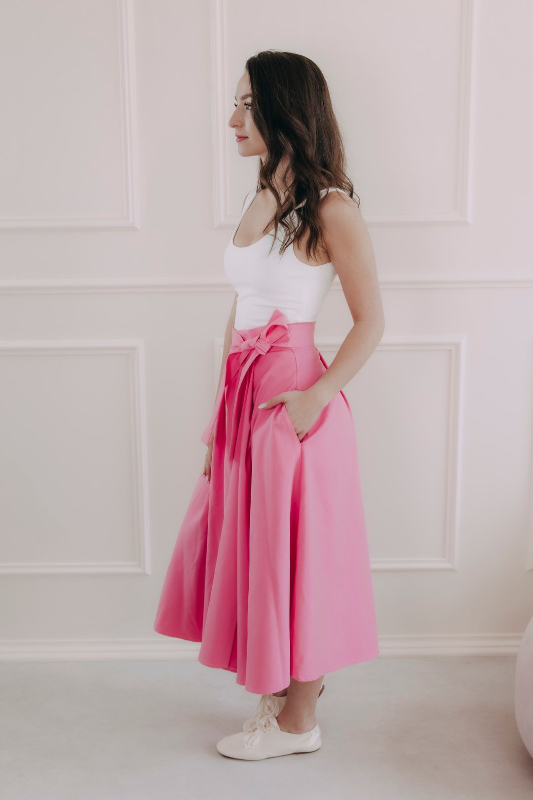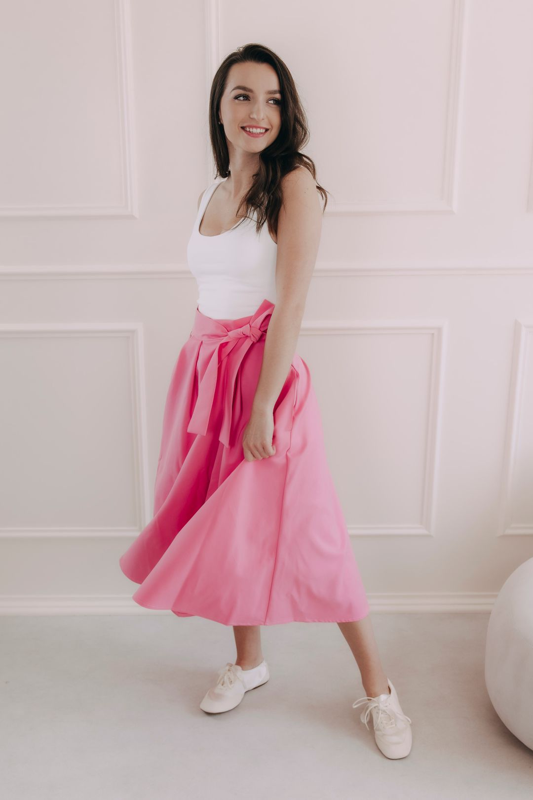 Sukně se zapíná pomocí čtyř knoflíčků a dvou dírek, což umožňuje nastavení pasu přesně na míru a zajišťuje, že krásně drží tam, kde má. Mašle v pase není jen na ozdobu, ale slouží i jako praktická pojistka pro maximální pohodlí a sebevědomí.