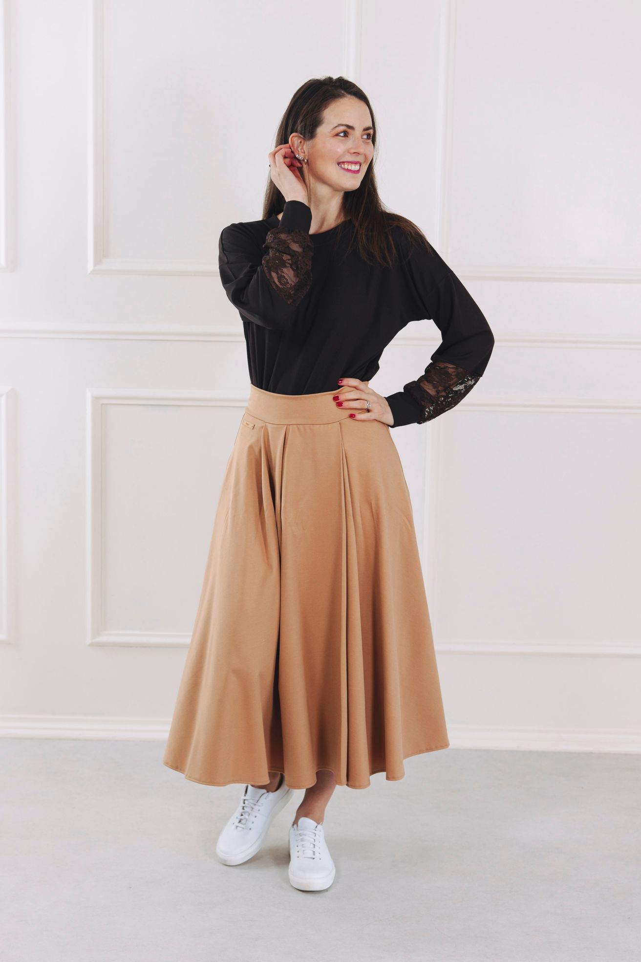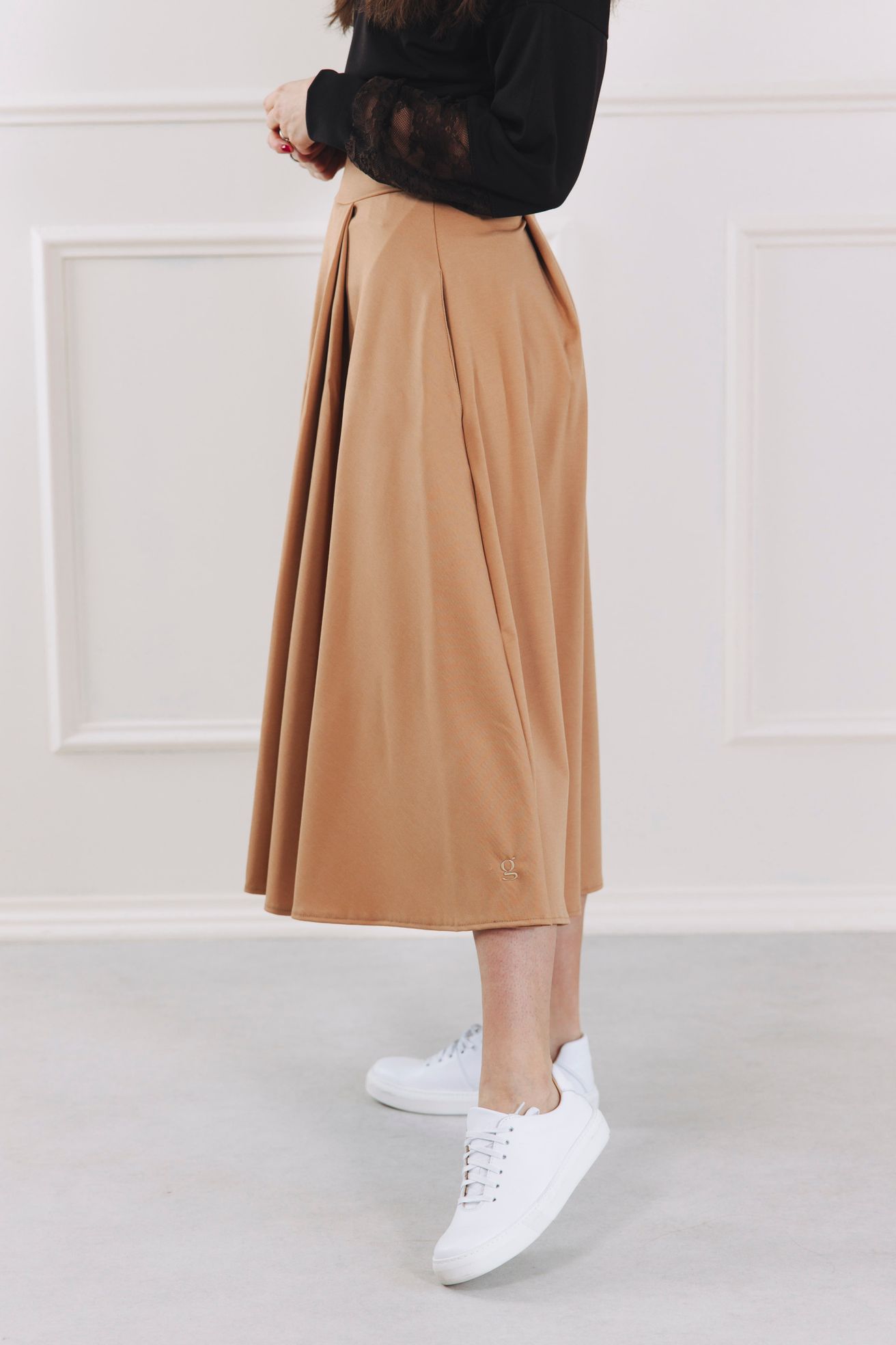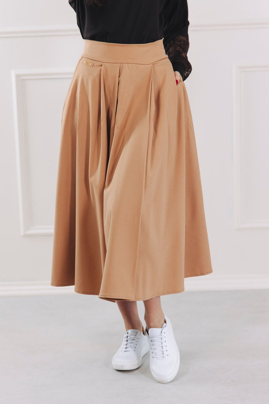 Karamelová midi sukně Mawi je navržena jako celoroční sukně.