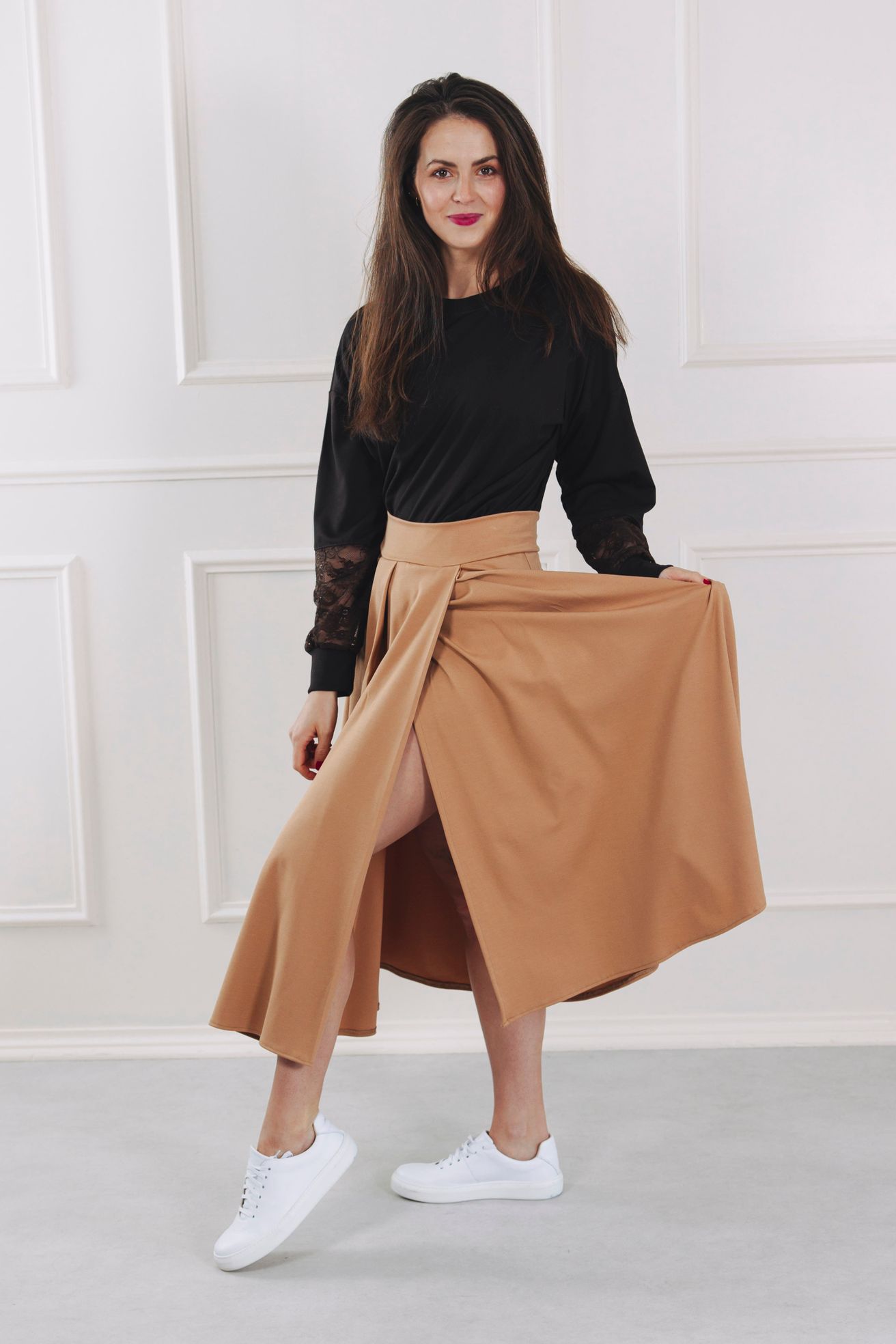Mawi není zavinovací. Rozparek pouze vytváří rafinovaný dojem překřížení, takže se nemusíte bát, že odkryjete něco navíc. Pokud jde o kapsy, ano, sukně má kapsy! Jsou nenápadné, ale praktické – přesně tam, kde je potřebujete. Skvěle doplňují elegantní střih a zajišťují pohodlí při každodenním nošení, aniž by narušily čistou linii sukně.