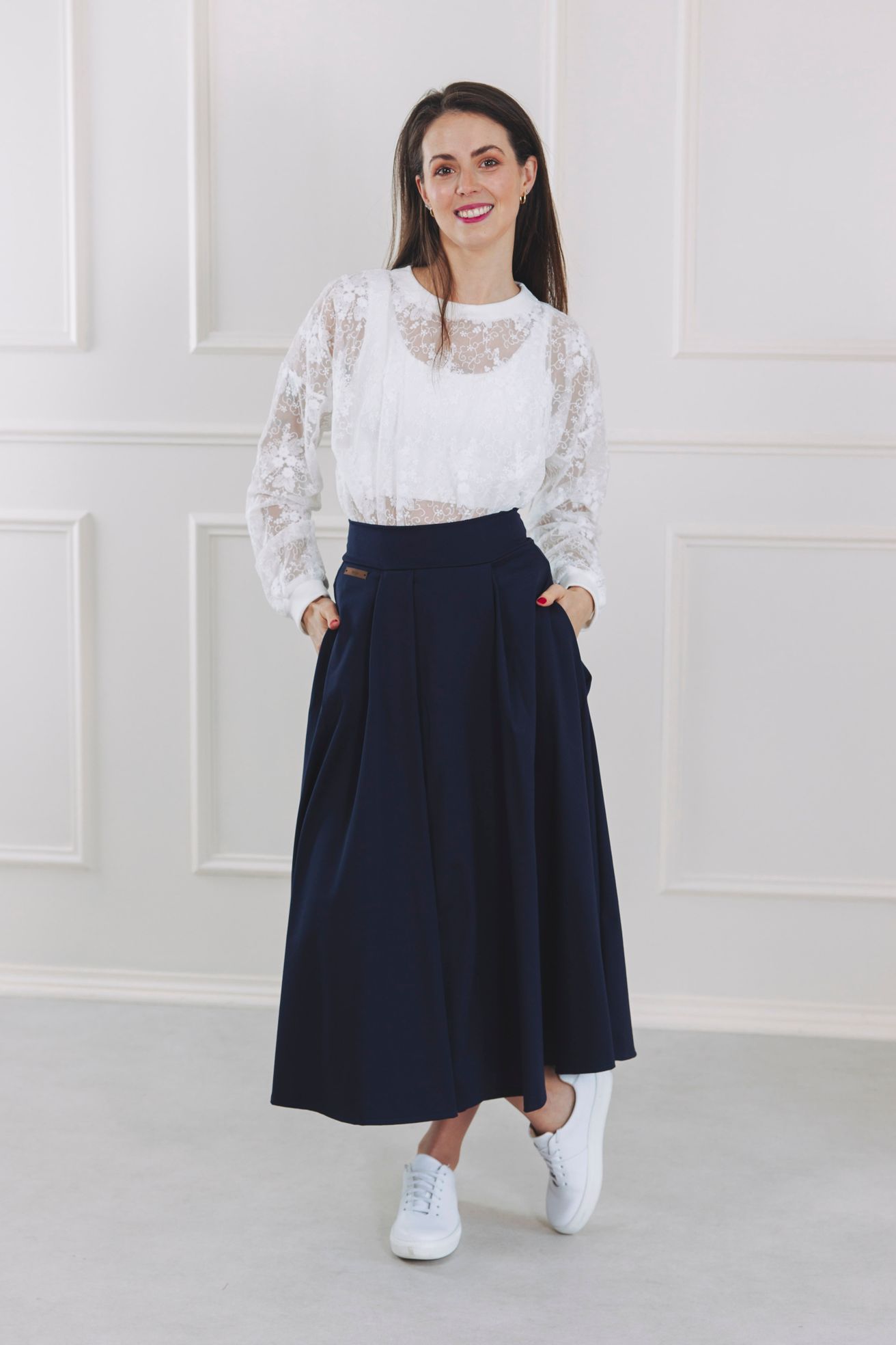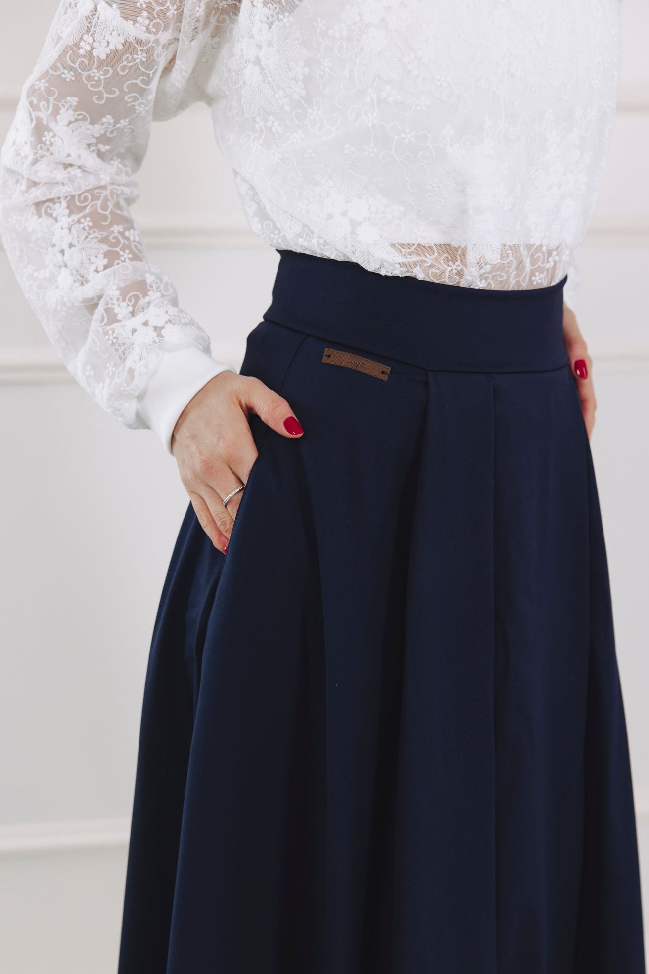 Mawi není zavinovací. Rozparek pouze vytváří rafinovaný dojem překřížení, takže se nemusíte bát, že odkryjete něco navíc. Pokud jde o kapsy, ano, sukně má kapsy! Jsou nenápadné, ale praktické – přesně tam, kde je potřebujete. Skvěle doplňují elegantní střih a zajišťují pohodlí při každodenním nošení, aniž by narušily čistou linii sukně.