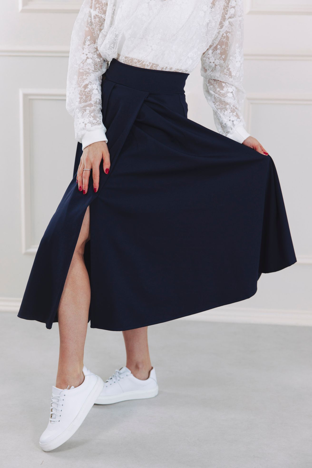 - Optická iluze zavinování: Rozparek vytváří luxusní dojem zavinování, ale sukně drží tvar a je zcela spolehlivá. Nemusíte se bát, že odkryjete něco navíc. Rozparek je rafinovaný, ale naprosto bezpečný.
