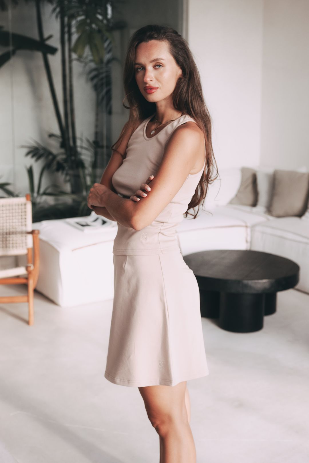 Vzali jsme bavlněnou áčkovou sukni Mosi, kterou tak dobře znáte z kolekce Comfy, a zkrátili ji přesně tak, aby s lehkostí zachytila každý teplý vánek. Představte si ten uvolněný vibe, když v ní kráčíte sluncem zalitými uličkami města nebo večer bosá po pláži.
