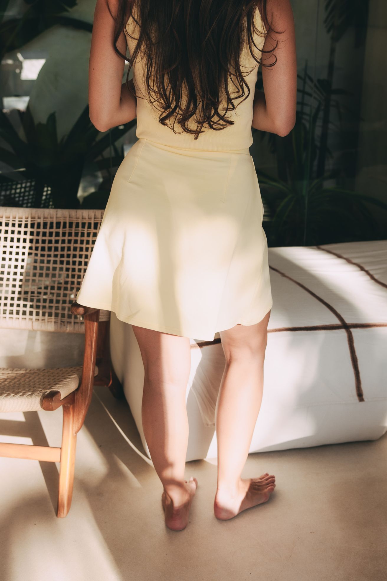 Vzali jsme bavlněnou áčkovou sukni Mosi, kterou tak dobře znáte z kolekce Comfy, a zkrátili ji přesně tak, aby s lehkostí zachytila každý teplý vánek. Představte si ten uvolněný vibe, když v ní kráčíte sluncem zalitými uličkami města nebo večer bosá po pláži.