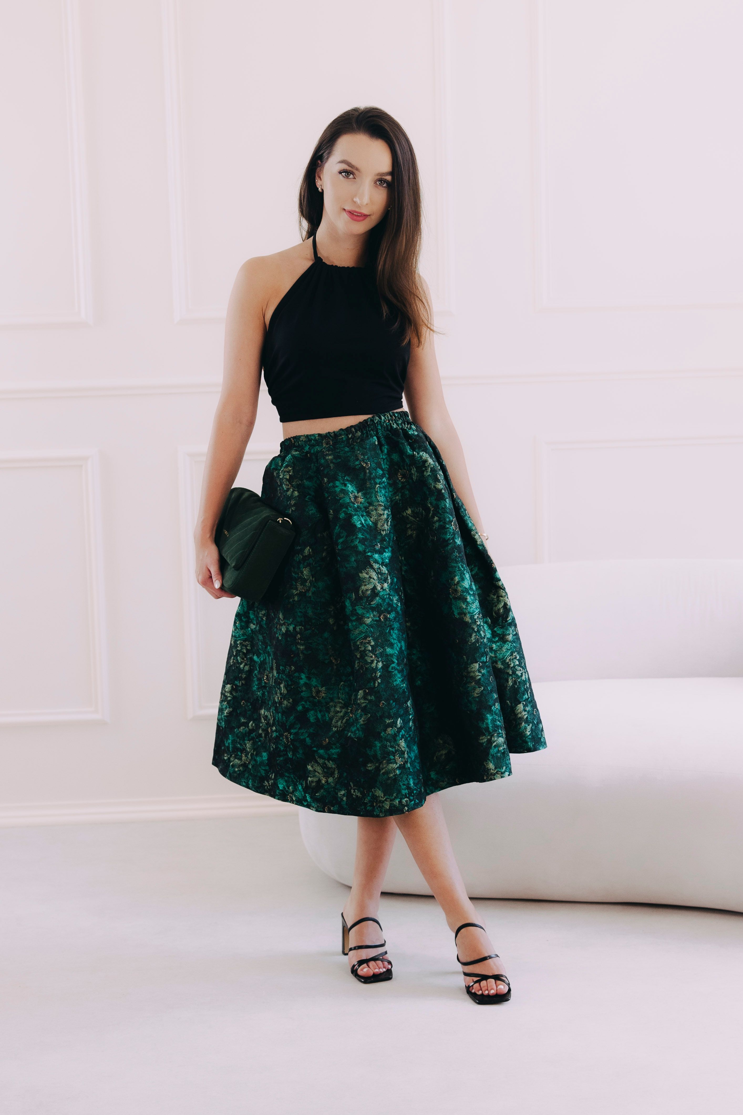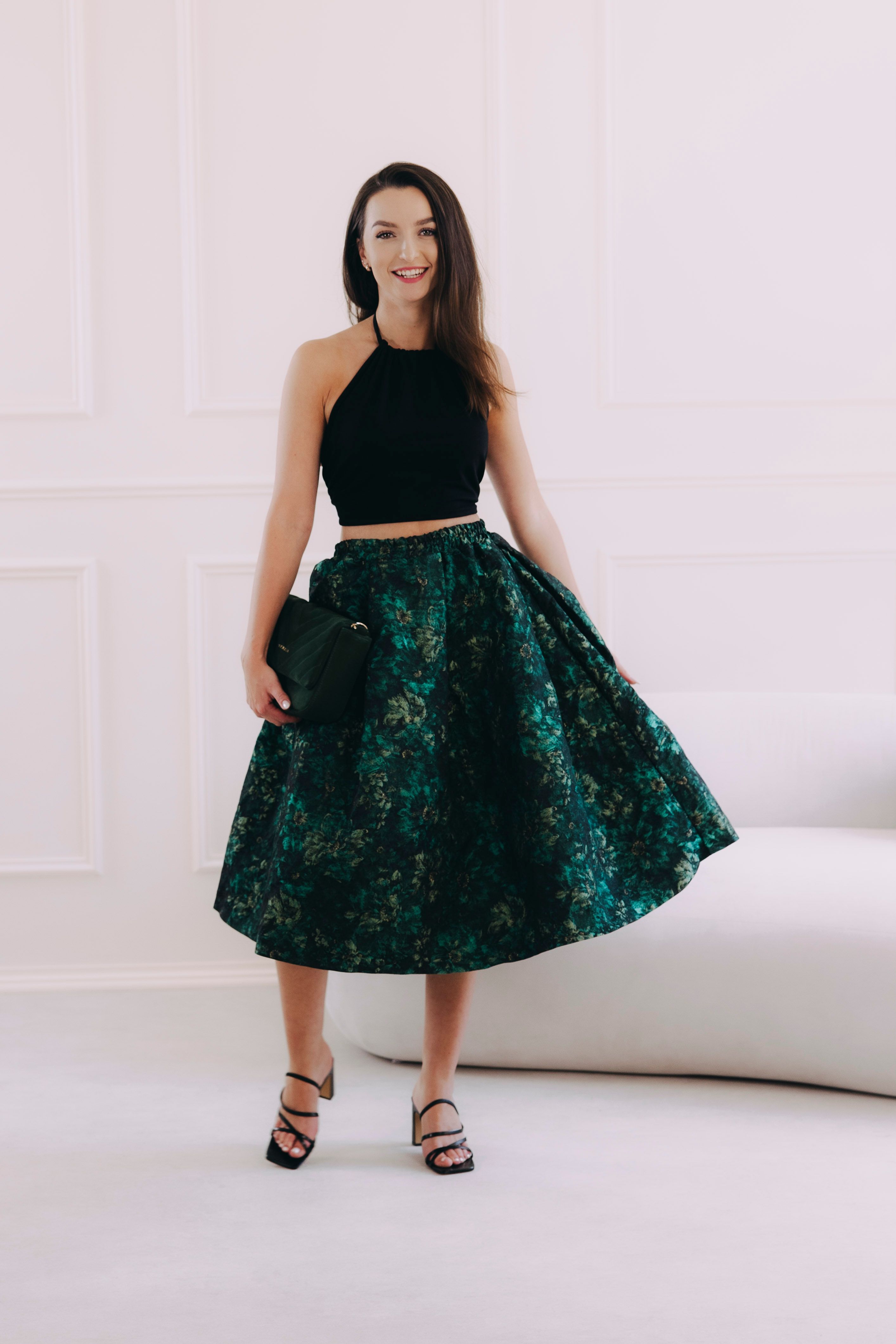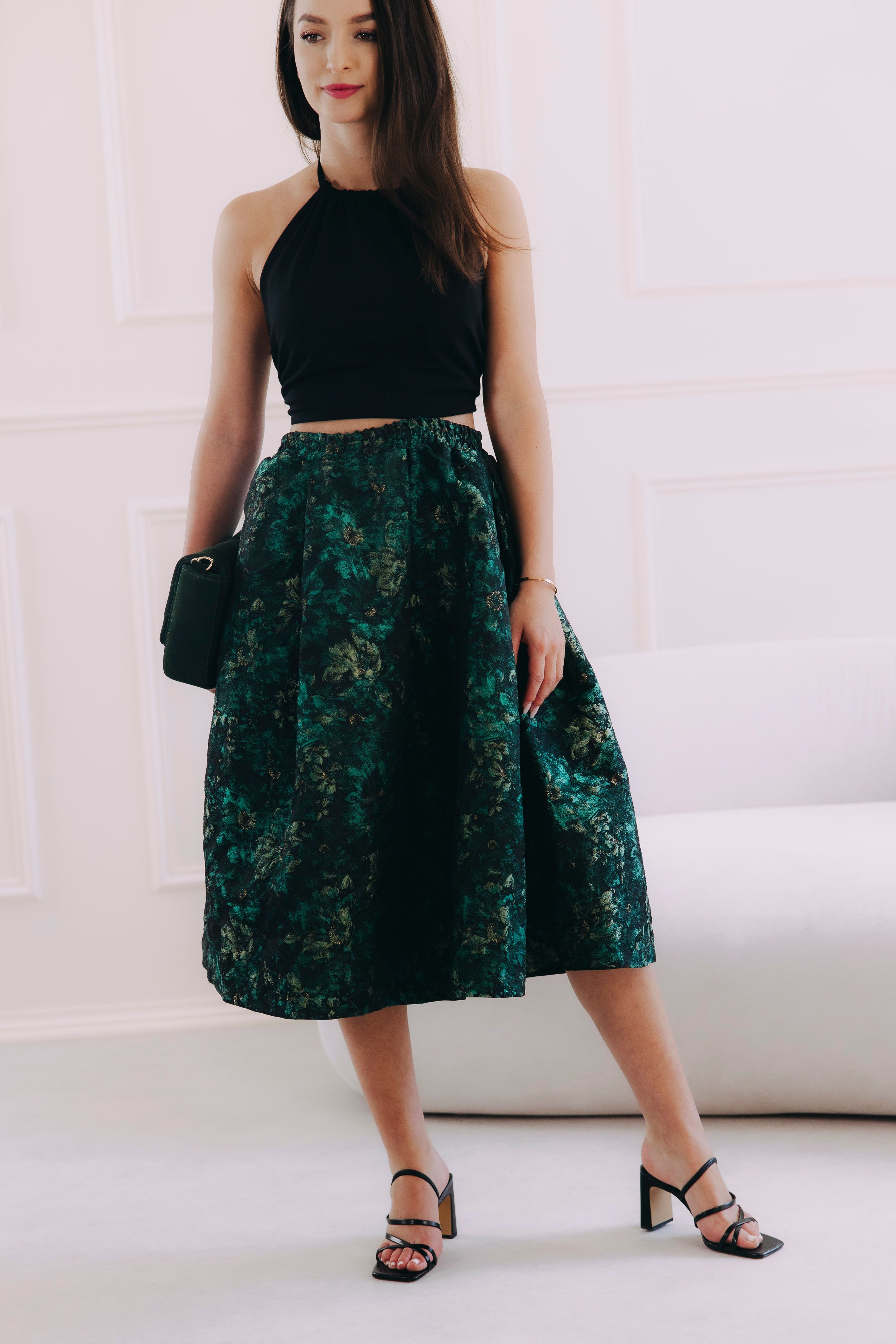 Svátky plné stylu a hravosti! Žakárová sukně Naki v áčkovém střihu, s jemnou texturou a odepínací mašlí v pase dodá vašemu outfitu šmrnc a kouzlo.