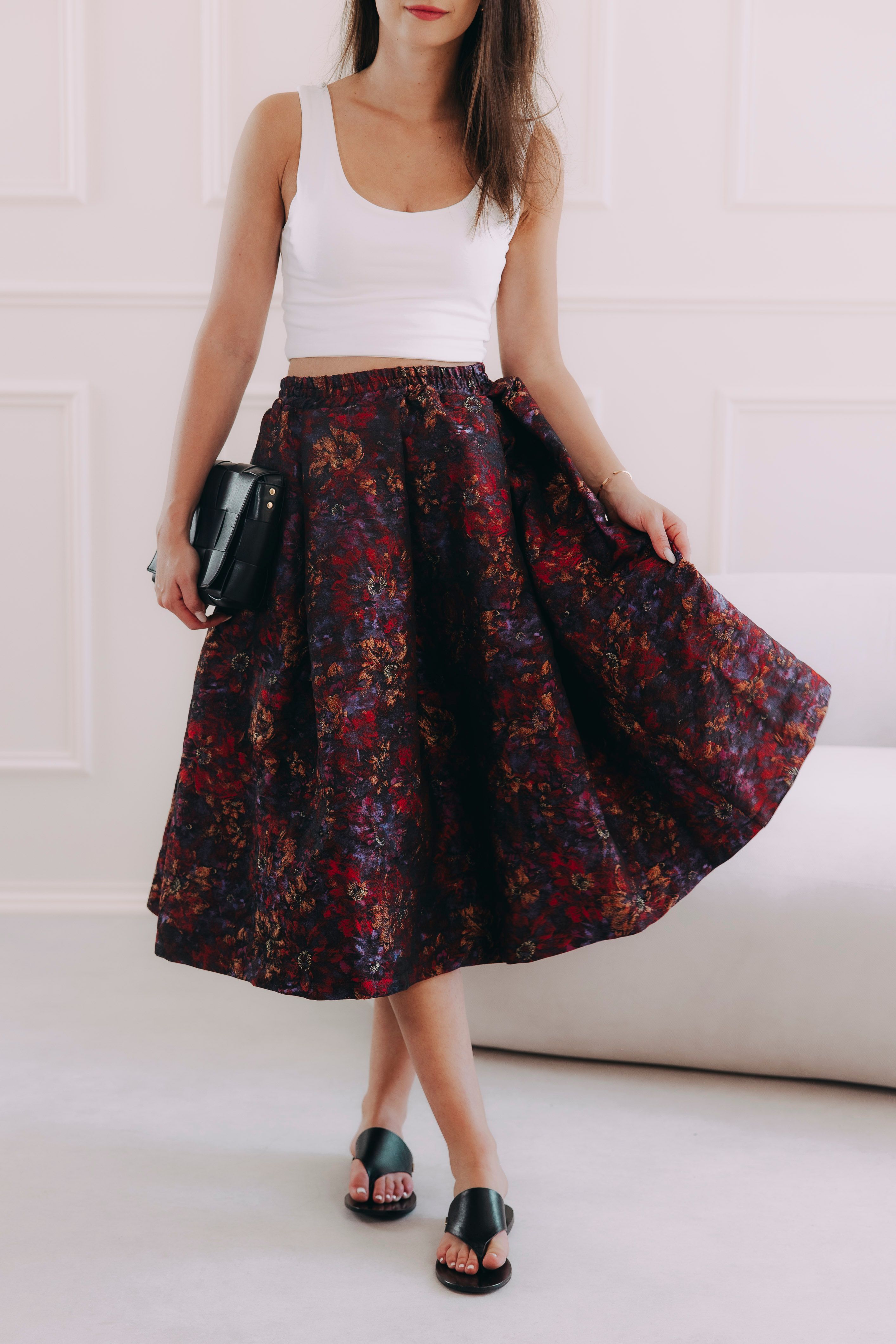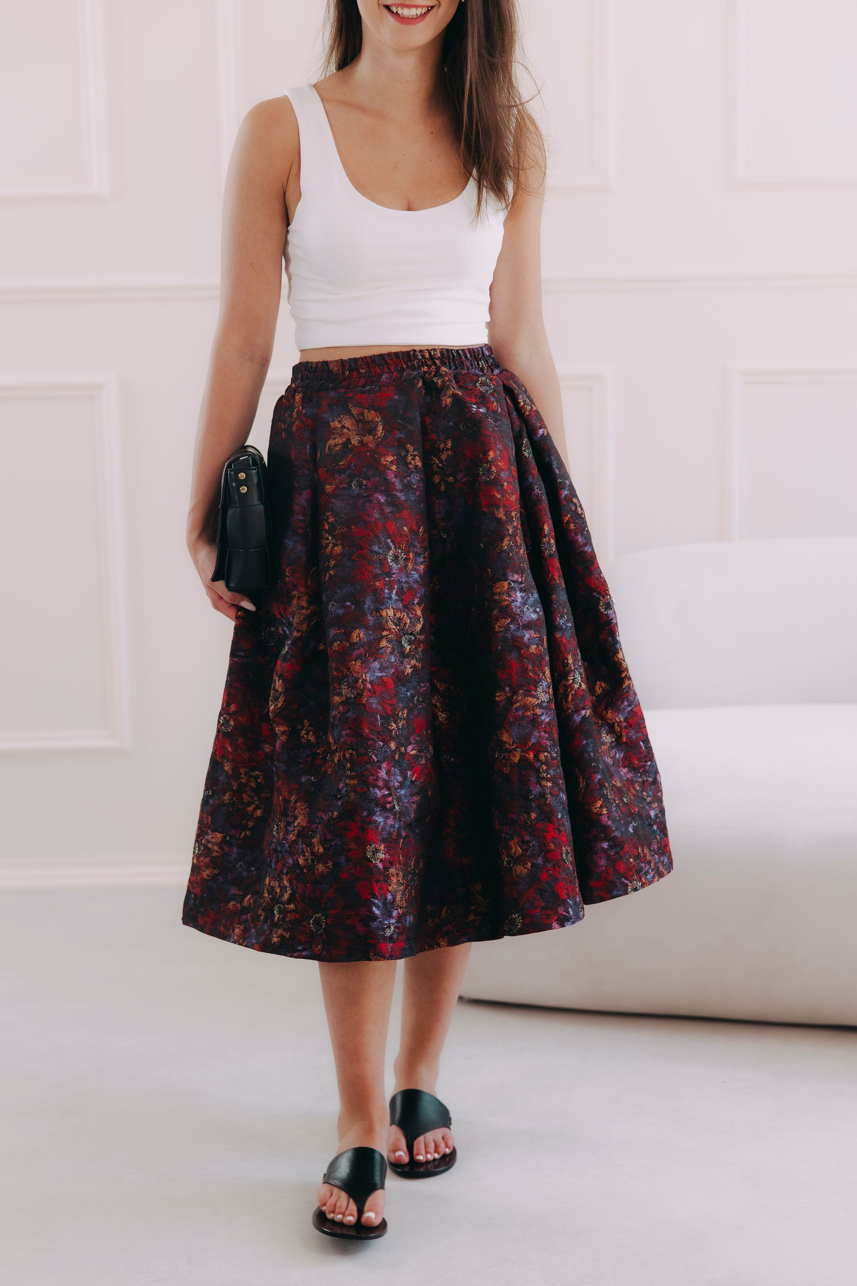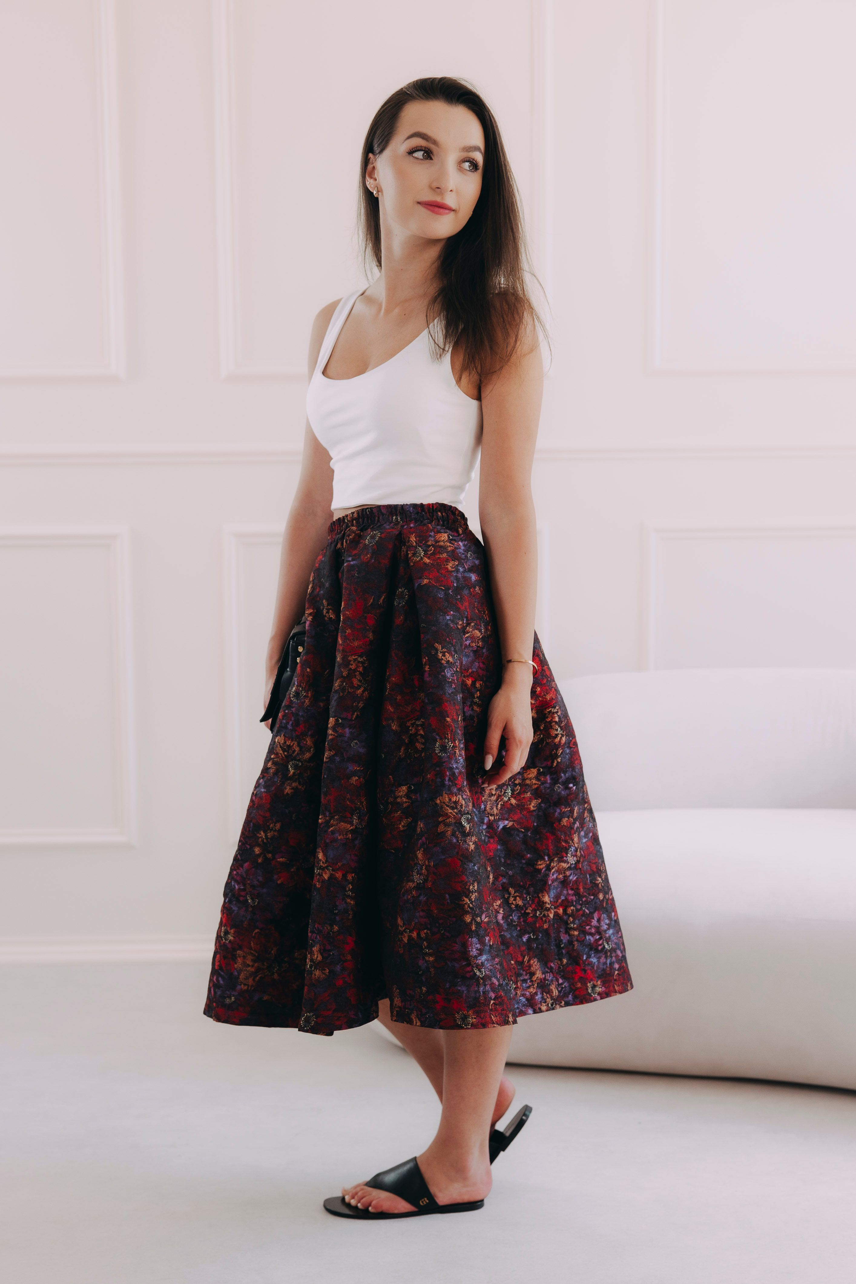 Svátky plné stylu a hravosti! Žakárová sukně Naki v áčkovém střihu, s jemnou texturou a odepínací mašlí v pase dodá vašemu outfitu šmrnc a kouzlo.