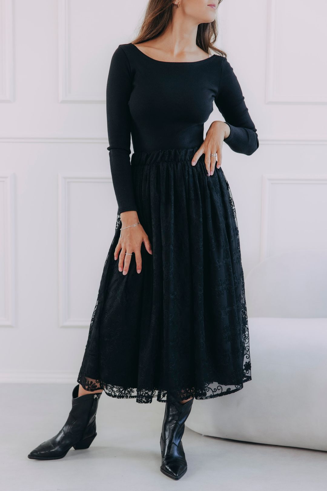 - Střih a délka: Ležérní a elegantní střih lichotí každé postavě. Ideální délka sukně do půli lýtek opticky prodlužuje nohy a je univerzální pro různé příležitosti.