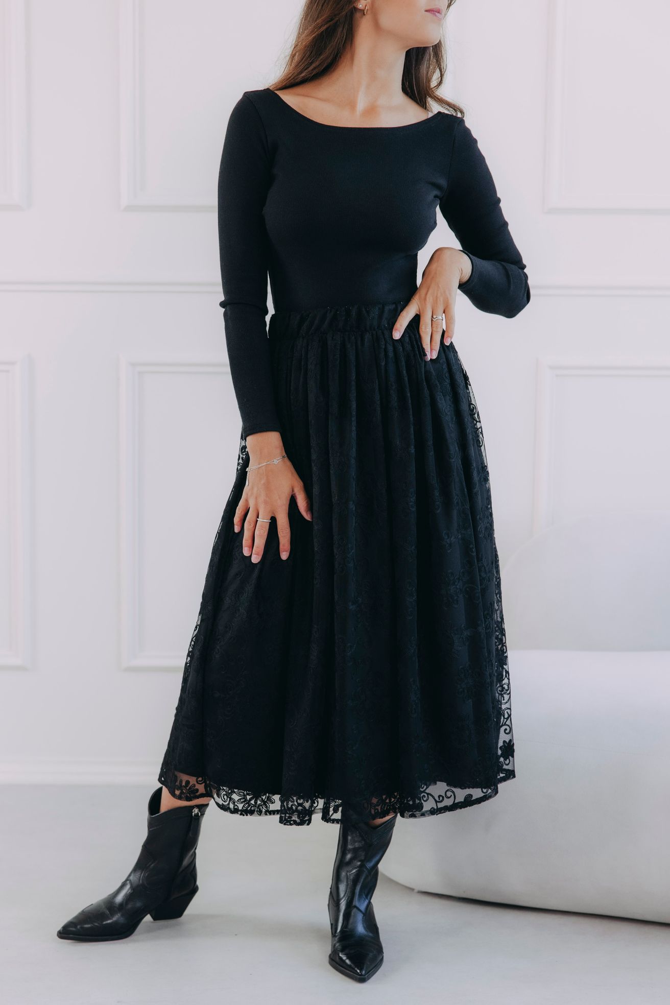 - Materiál: Sukně je ušita ze dvou vrstev pro maximální pohodlí. Vrchní část tvoří jemná krajka, která dodává sukni vzdušný a romantický vzhled. Spodní vrstva, příjemná podšívka, zajišťuje komfortní nošení.
