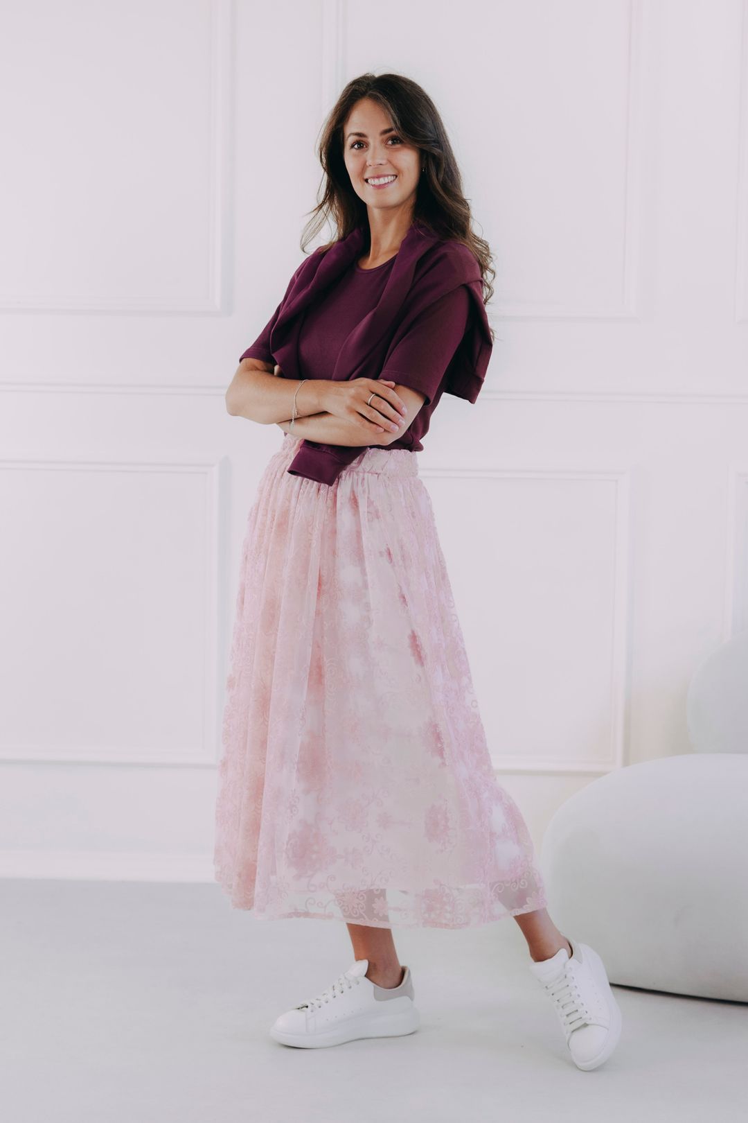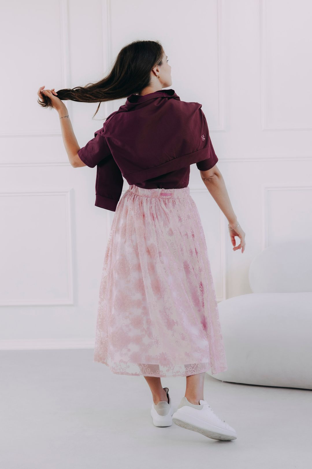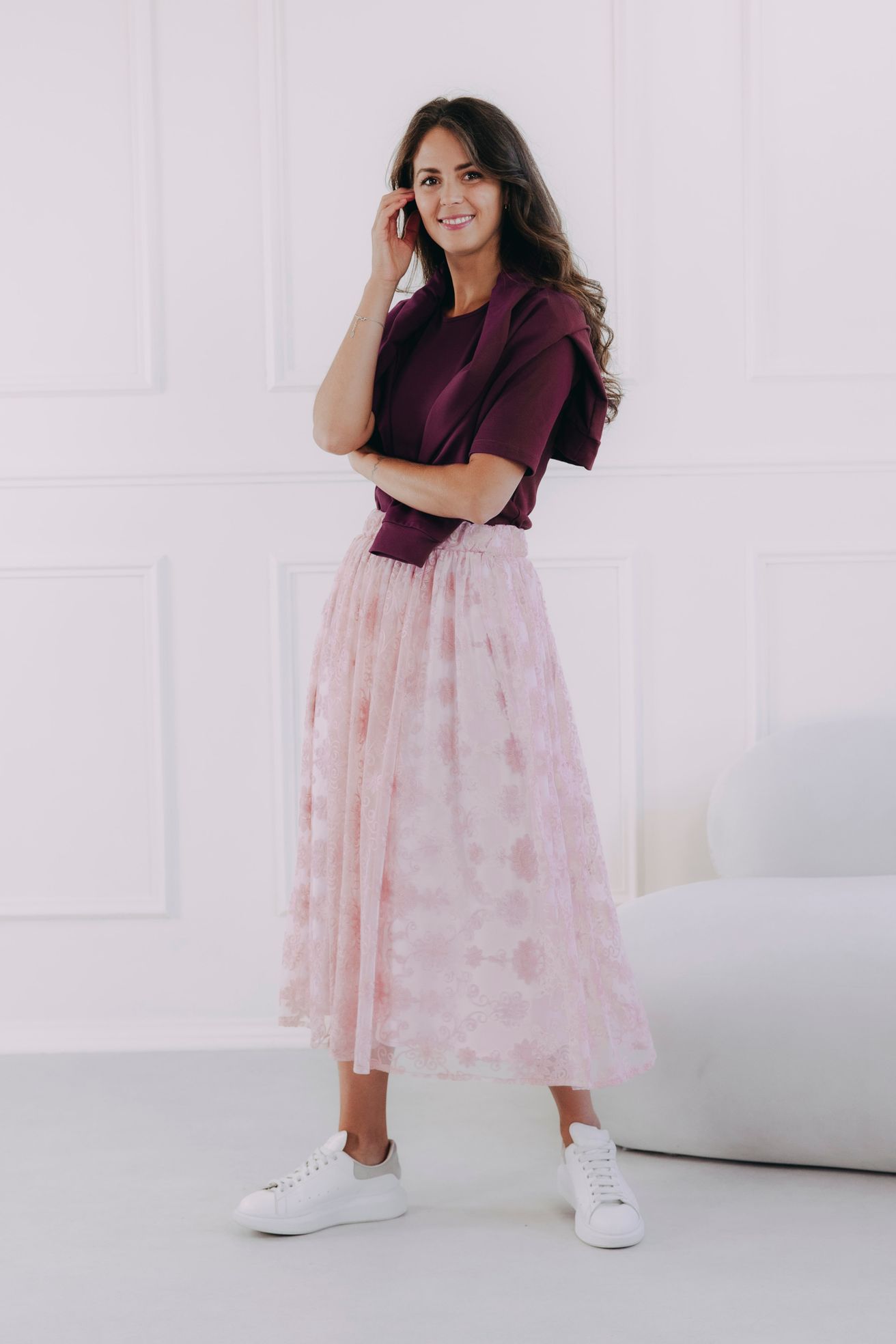 Hledáte inspiraci na ležérní outfit do města či na vycházku do parku? Doplňte sukni jednoduchým basic tričkem (zkuste ho zastrčit dovnitř pro zdůraznění pasu) a stylovými teniskami. Přes ramena si můžete ležérně uvázat mikinu nebo bomber, abyste outfitu dodali ležérní šmrnc a pohodlí.