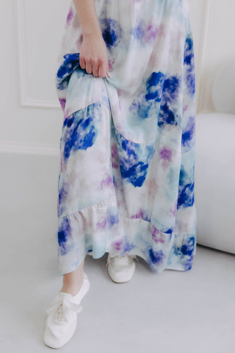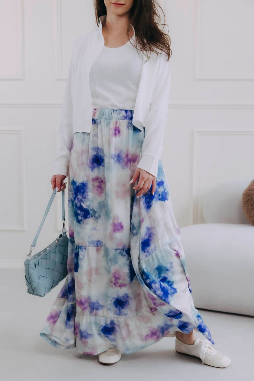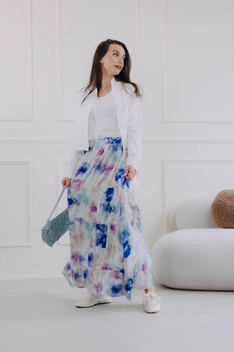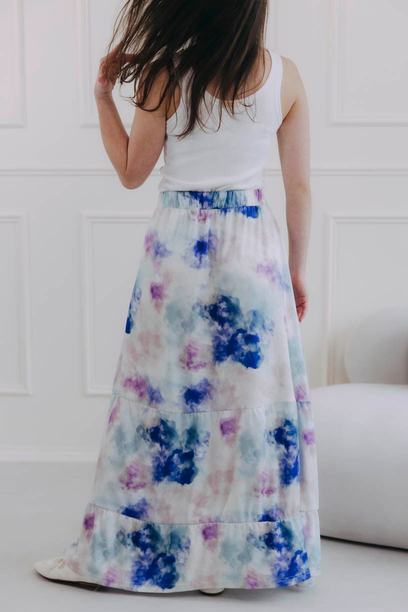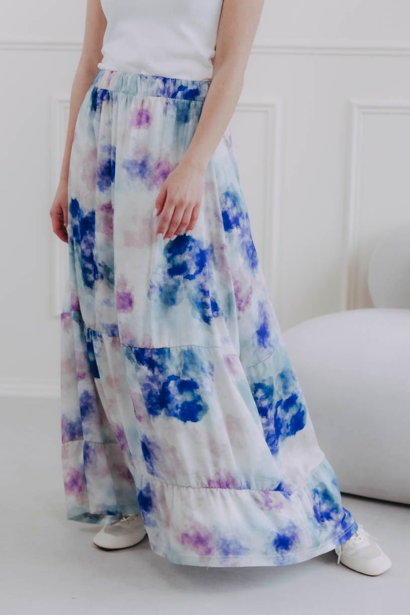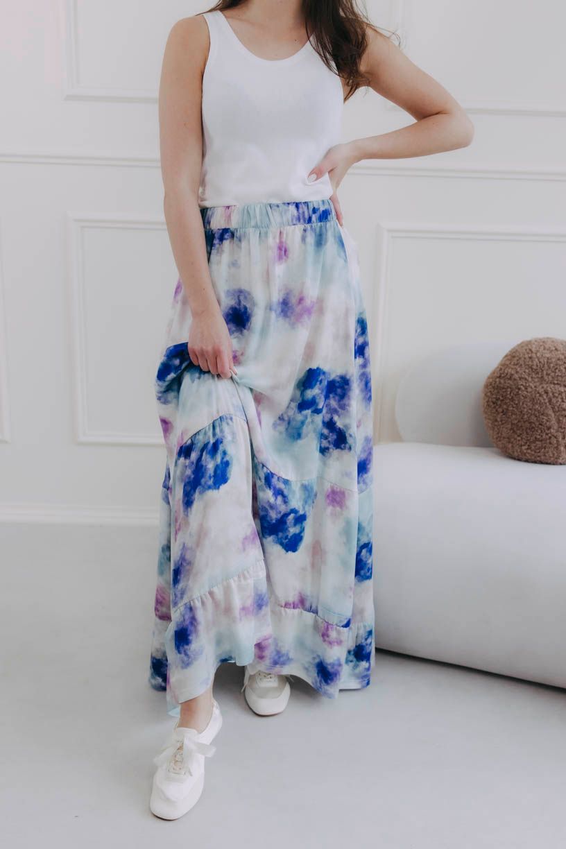 Nechte se okouzlit splývavou sukní Nyota s akvarelovým vzorem a pohodlnou gumou v pase. Navržena s láskou k dlouhým sukním pro váš styl i pohodlí.