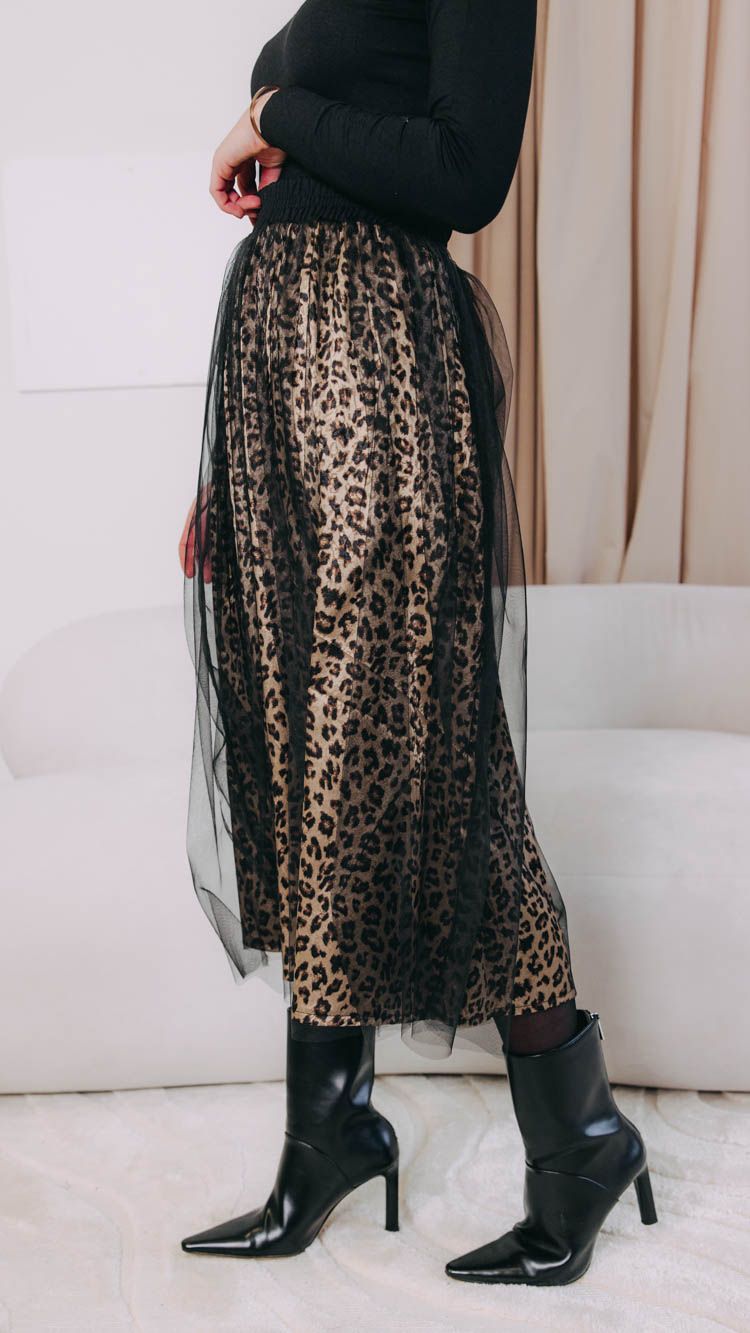 Černá midi sukně Tia s leopardím vzorem a překrytá působivou tylovou látkou. Budete v ní tak trochu princezna, tak trochu punk. Pořád ale stylová.