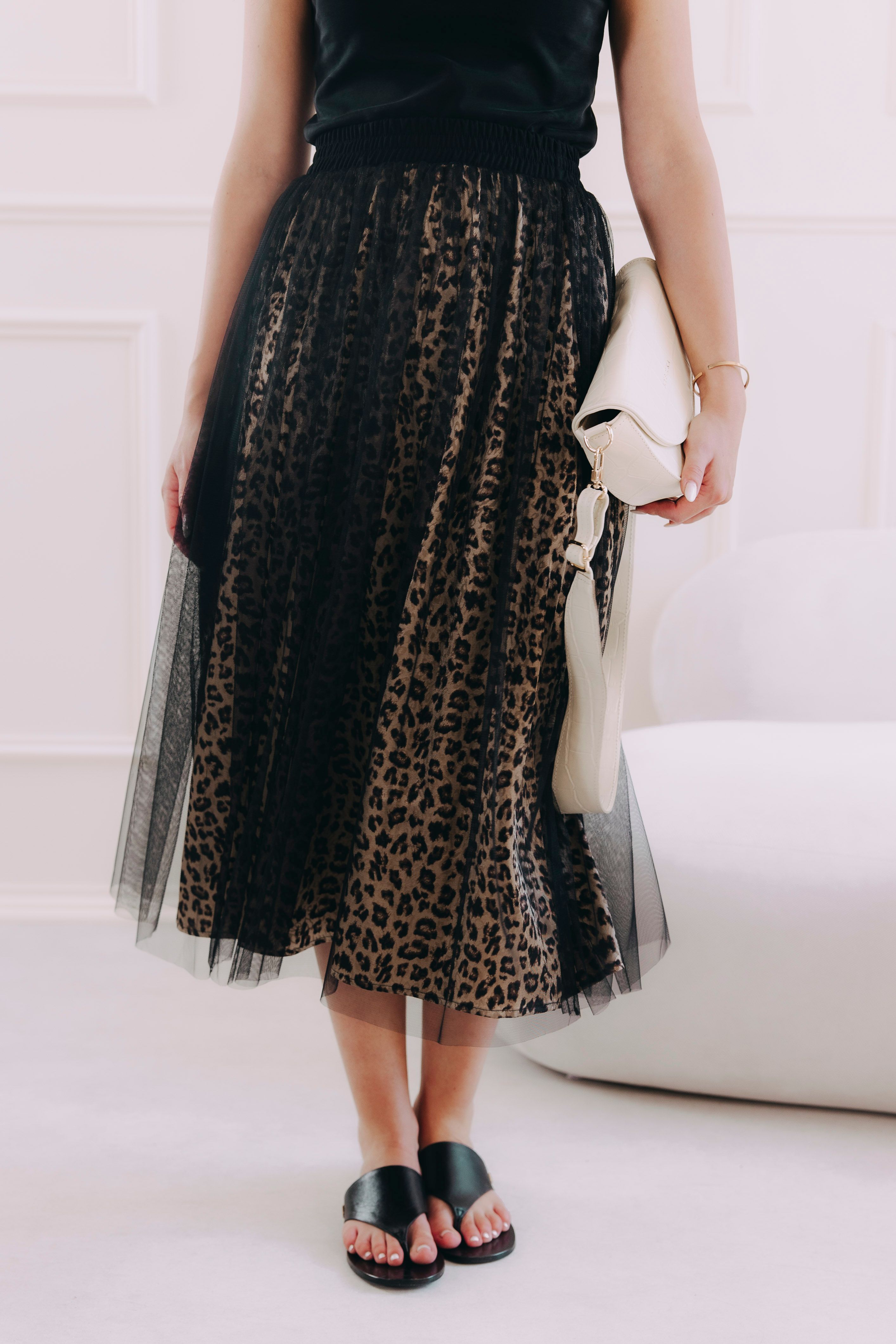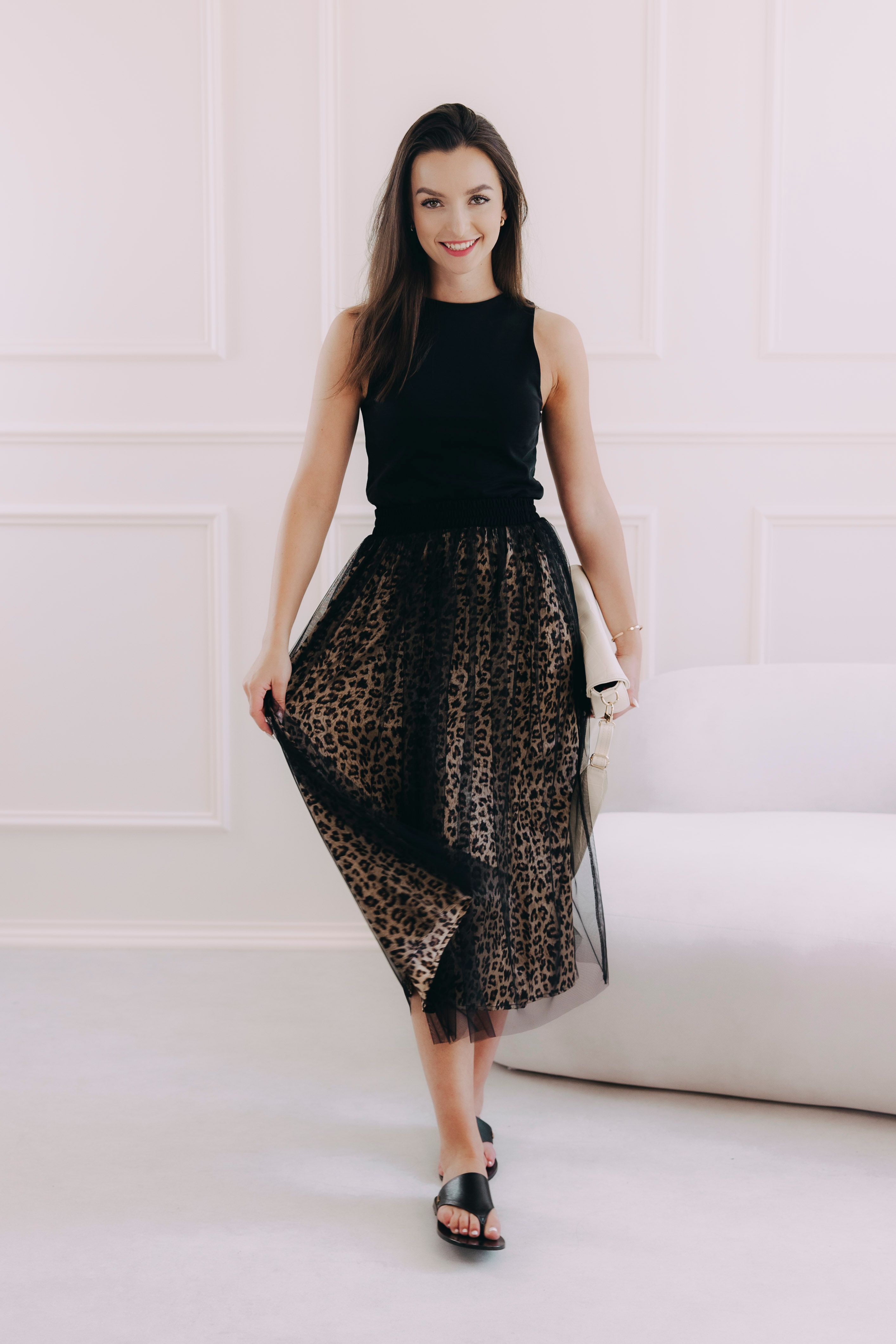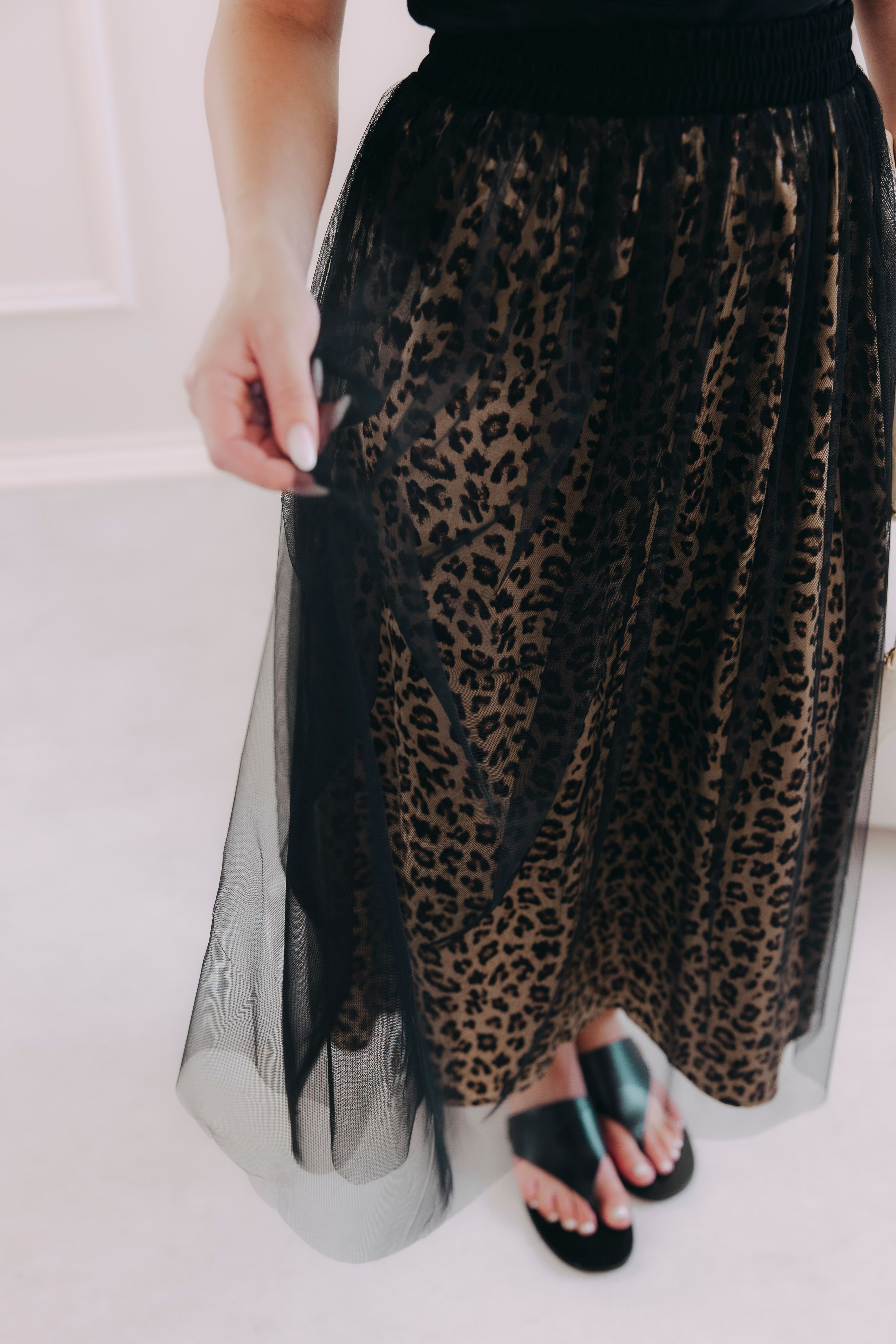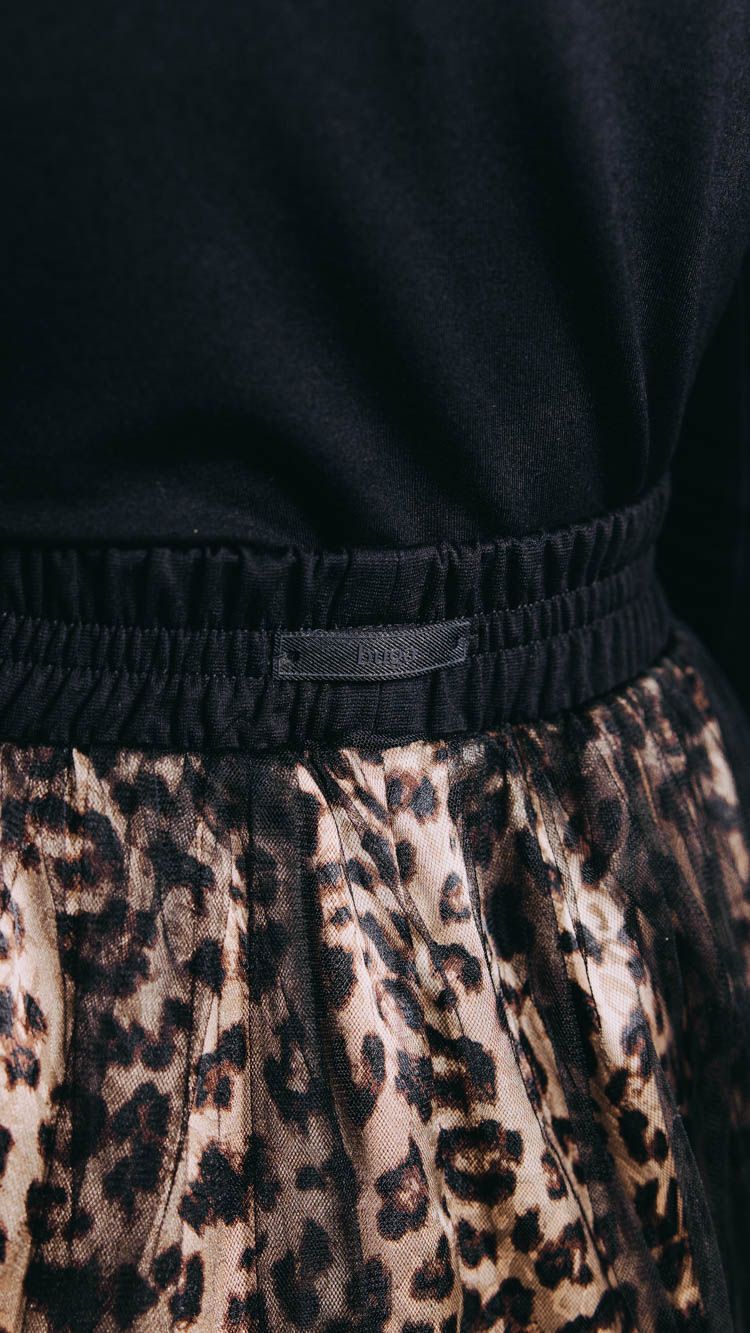 Látka s leopardím vzorem je pokrytá šmrncovní tylovou vrstvou, která ji ještě o kousek tak trochu přidrzle přesahuje. Jemné řasení dodává sukni na křehkosti a guma v pase samozřejmě na pohodlnosti.