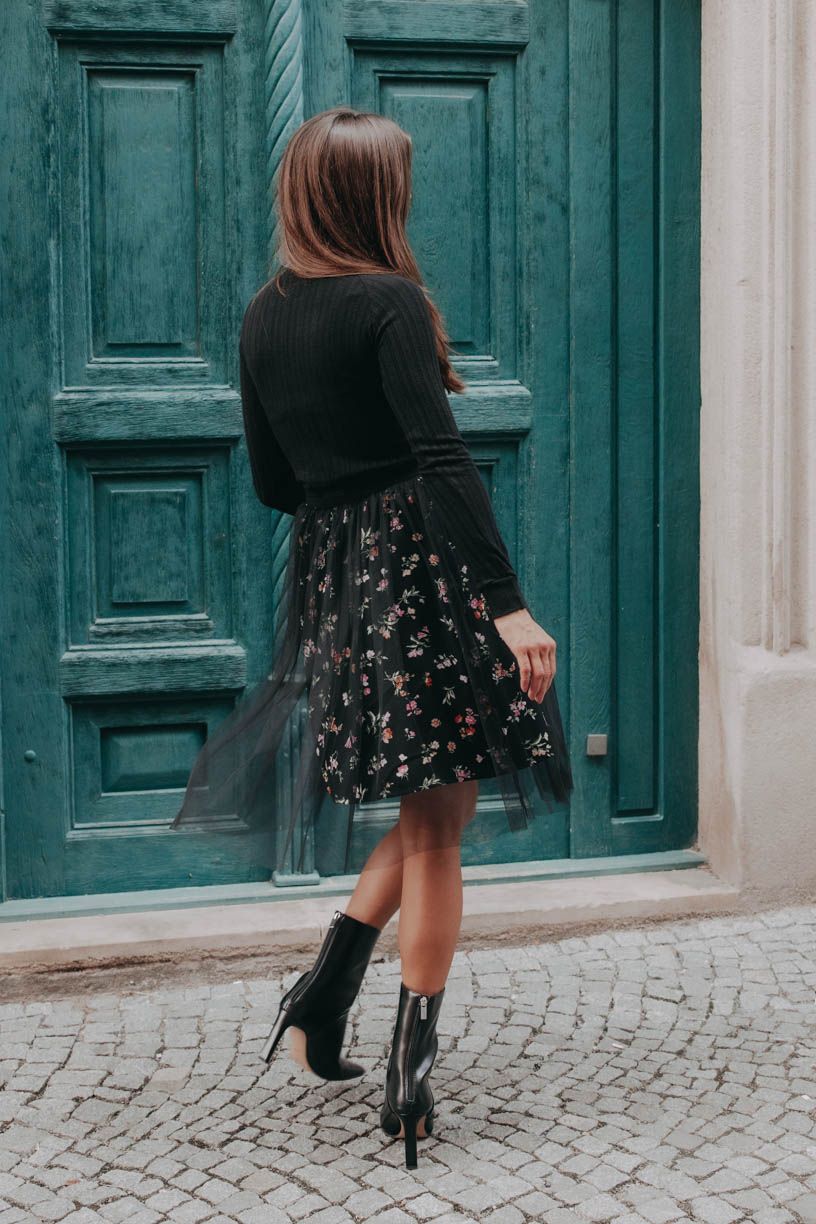 Temně černá látka posetá barevnými kvítky je pokrytá šmrncovní tylovou vrstvou, která ji ještě o kousek tak trochu přidrzle přesahuje. Jemné řasení dodává sukni na křehkosti a guma v pase samozřejmě na pohodlnosti.