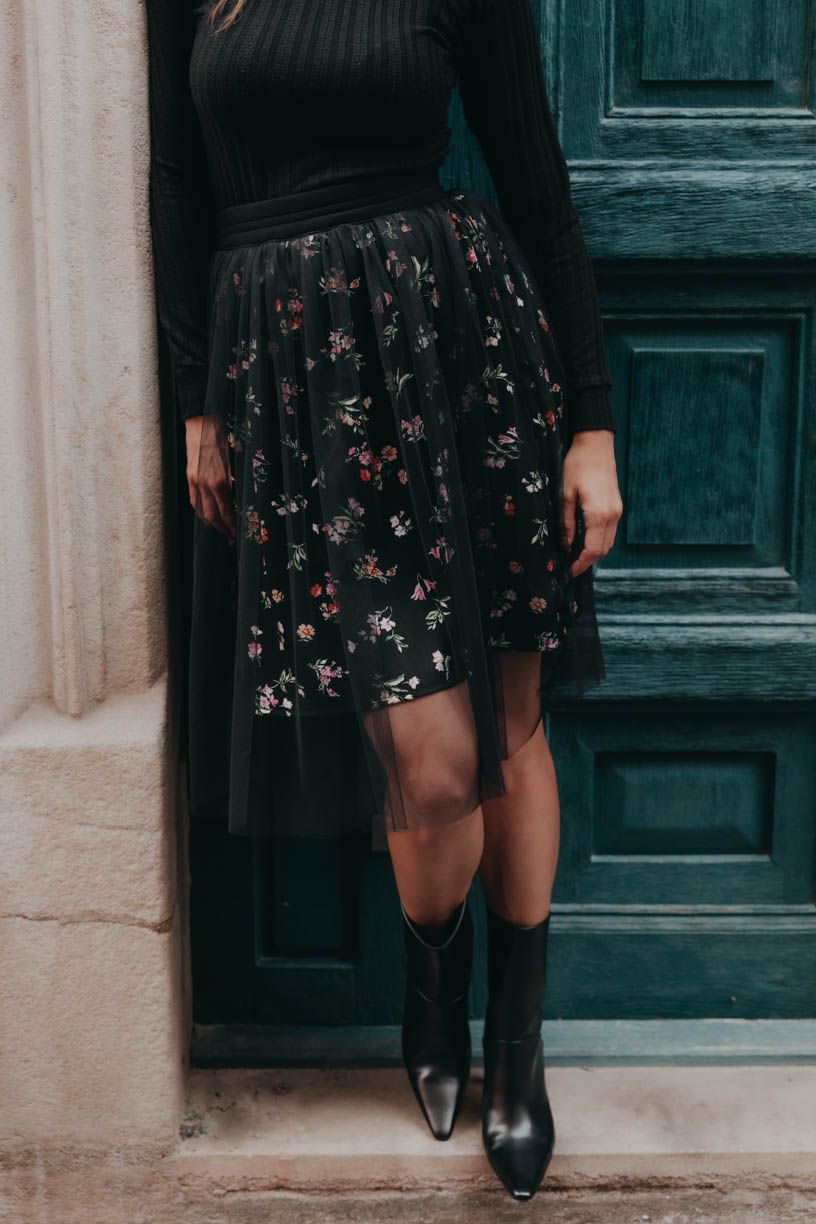 Krátká černá sukně Tia je posetá kvítky a překrytá působivou tylovou látkou. Budete v ní tak trochu princezna, tak trochu punk. Pořád ale stylová.