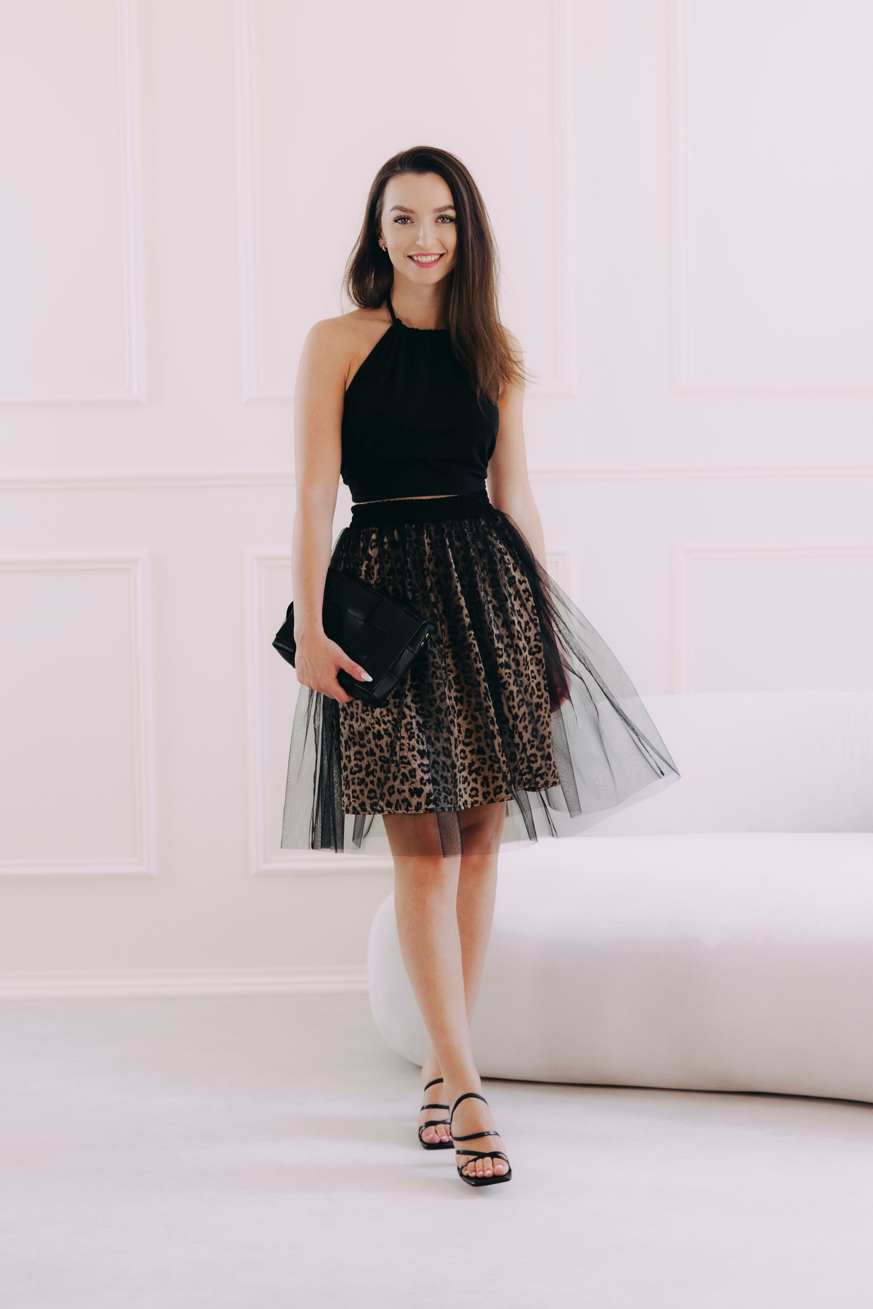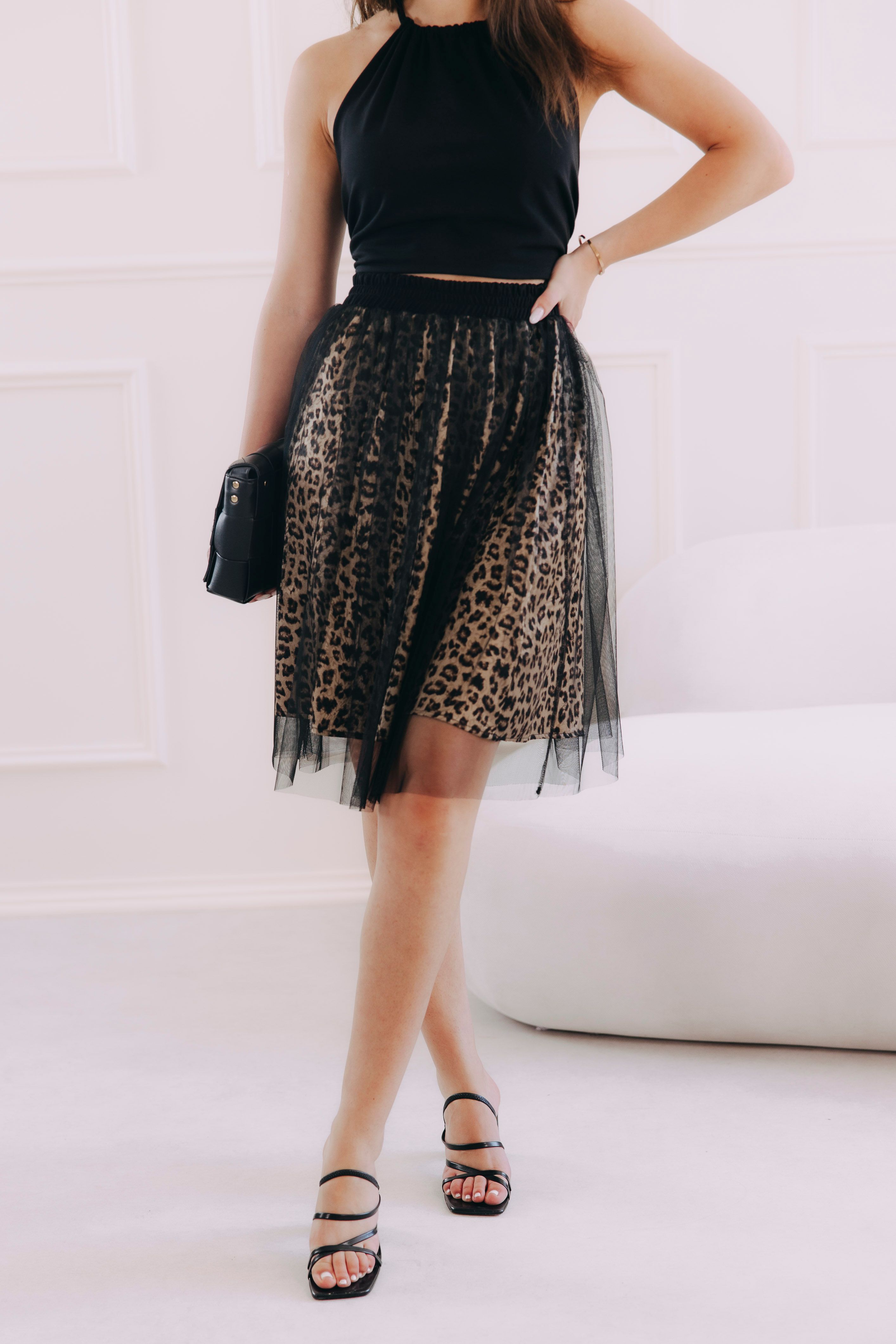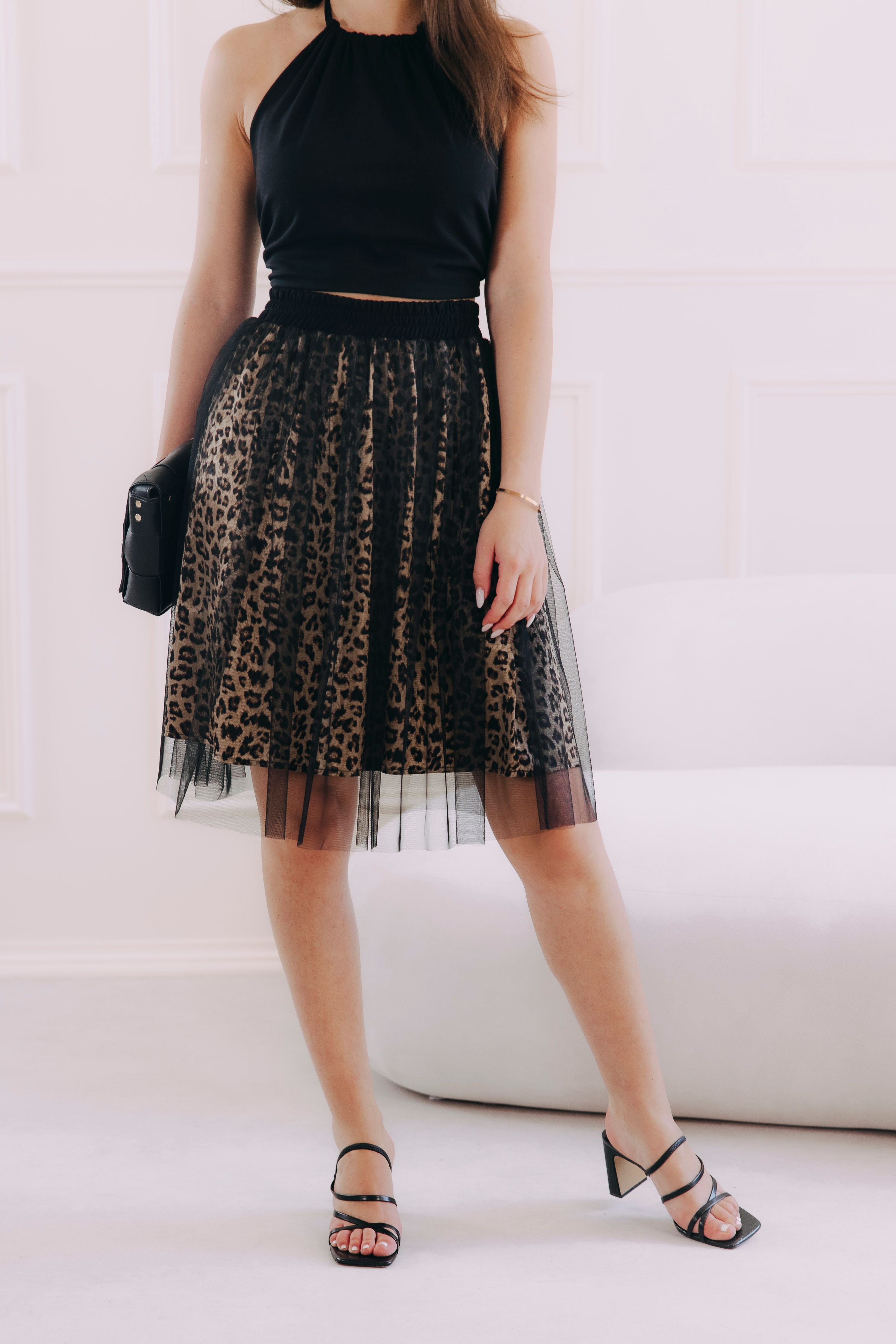 Látka s leopardím vzorem je pokrytá šmrncovní tylovou vrstvou, která ji ještě o kousek tak trochu přidrzle přesahuje. Jemné řasení dodává sukni na křehkosti a guma v pase samozřejmě na pohodlnosti.
